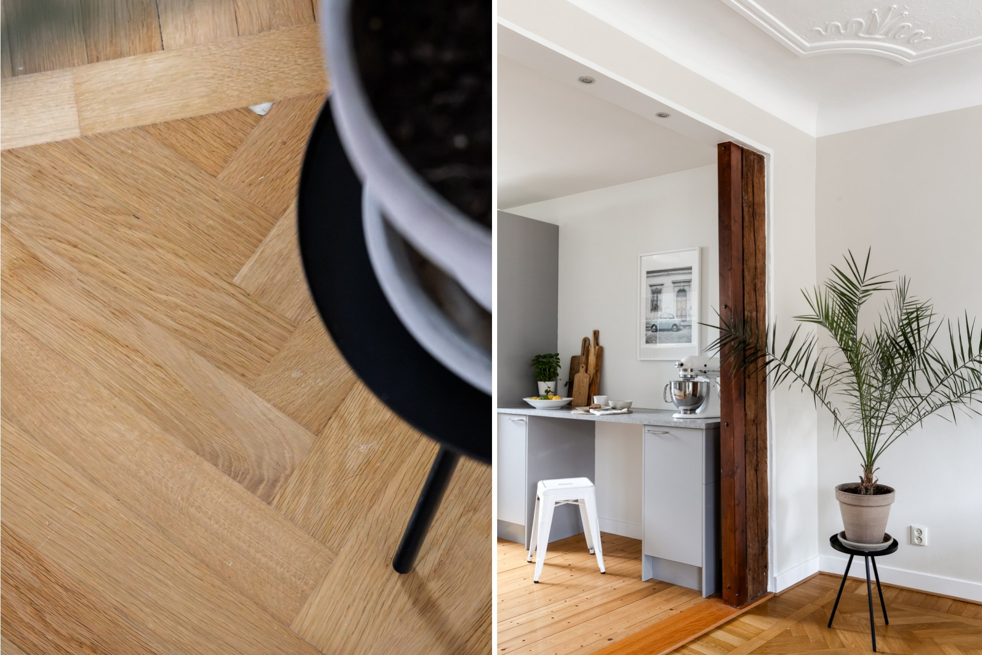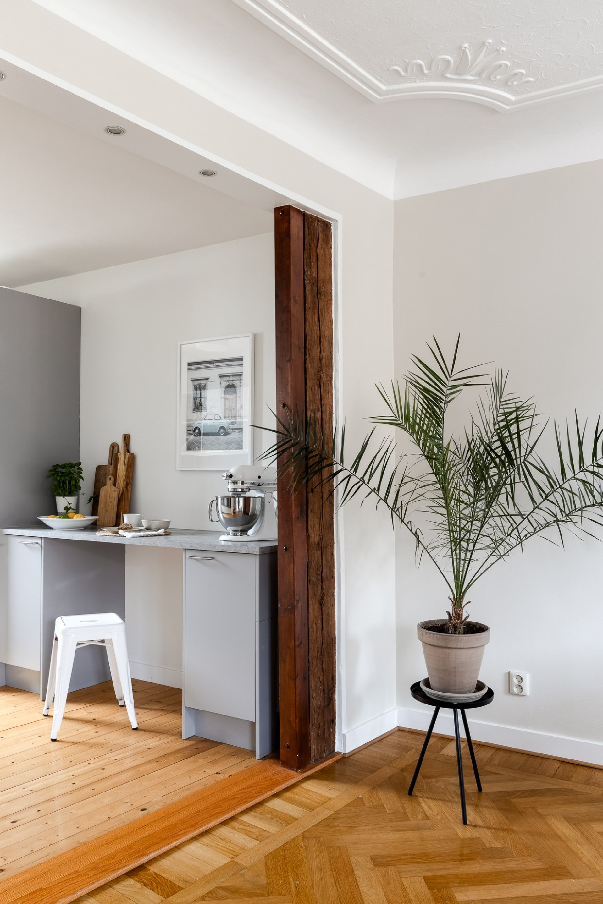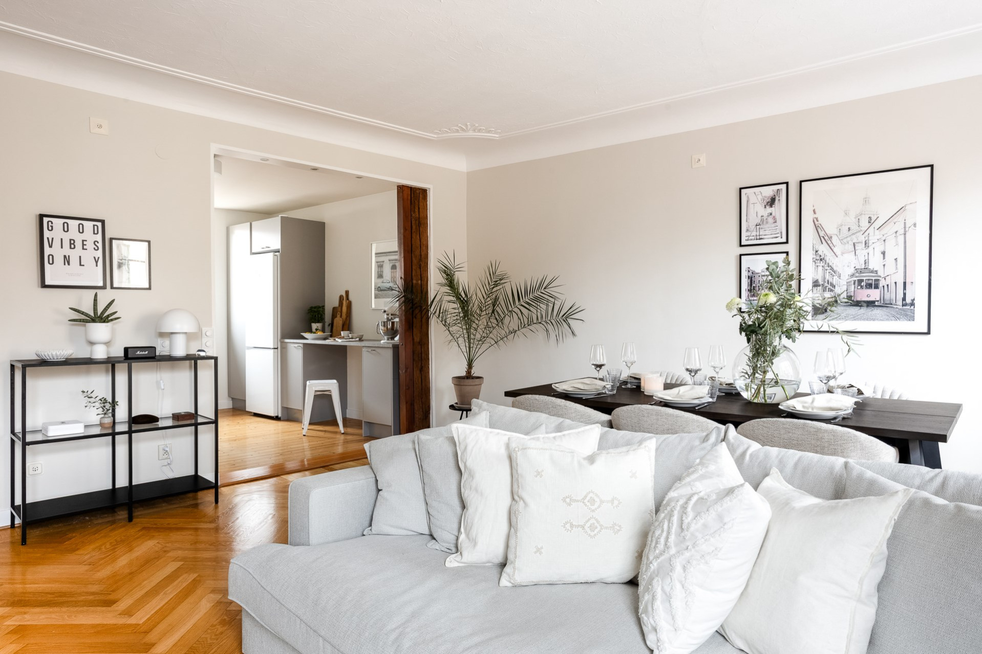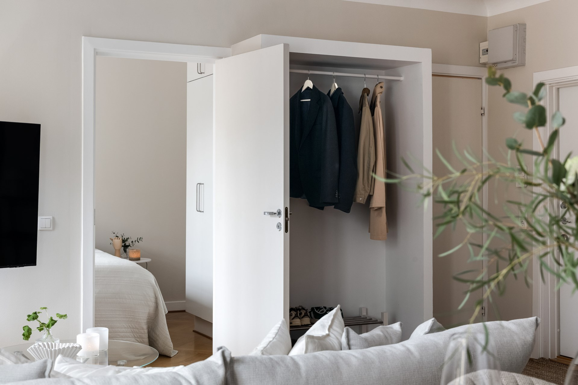 Ett kliv över tröskeln öppnar sig lägenheten. Originaldetaljerna från sekelskiftet syns i tak och fiskbensparketten ligger över golvet. Vi kliver in i lägenhetens allrum och intill entren finns plats för både skor och kläder. Väggarna är målade i en sober ljus ton.