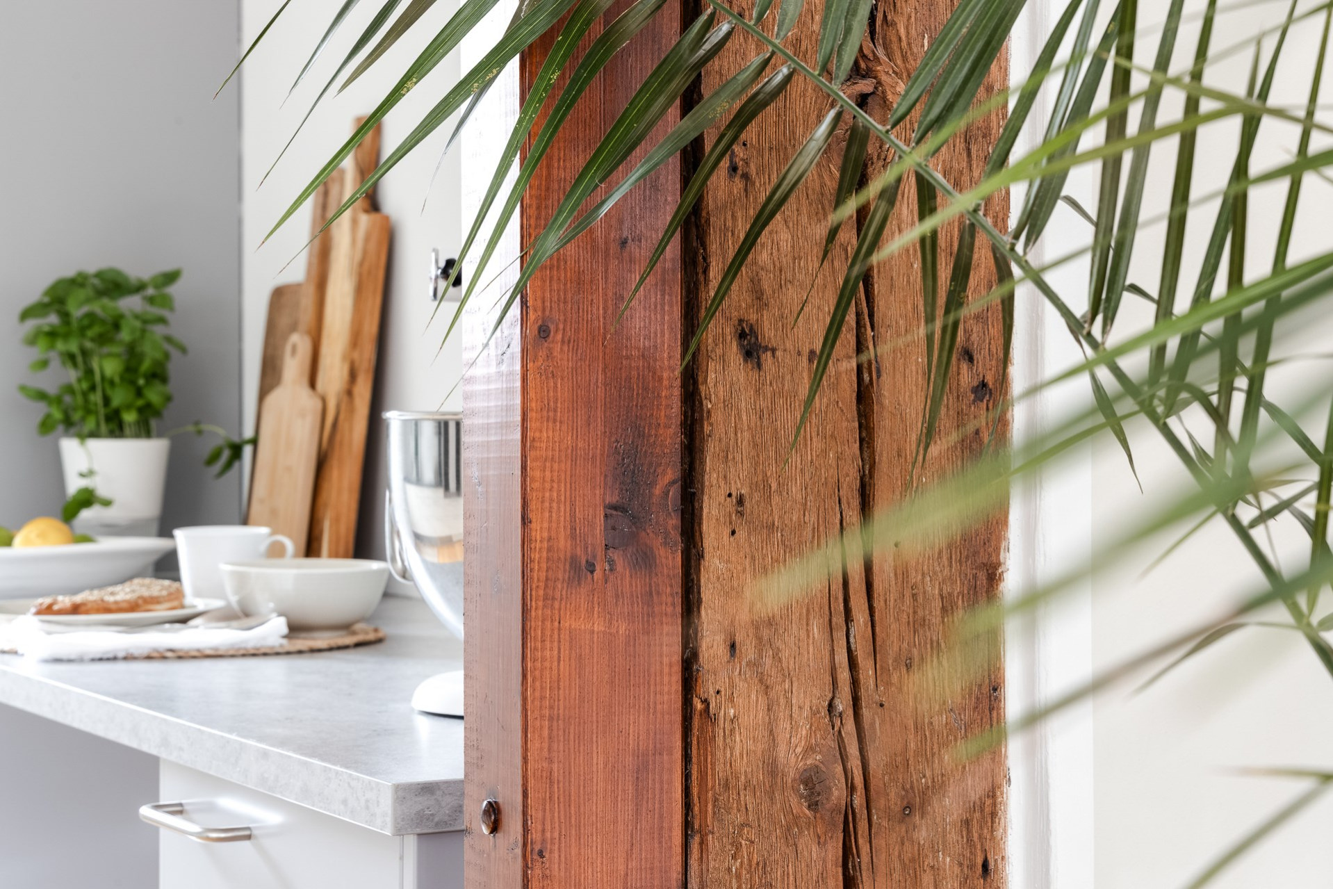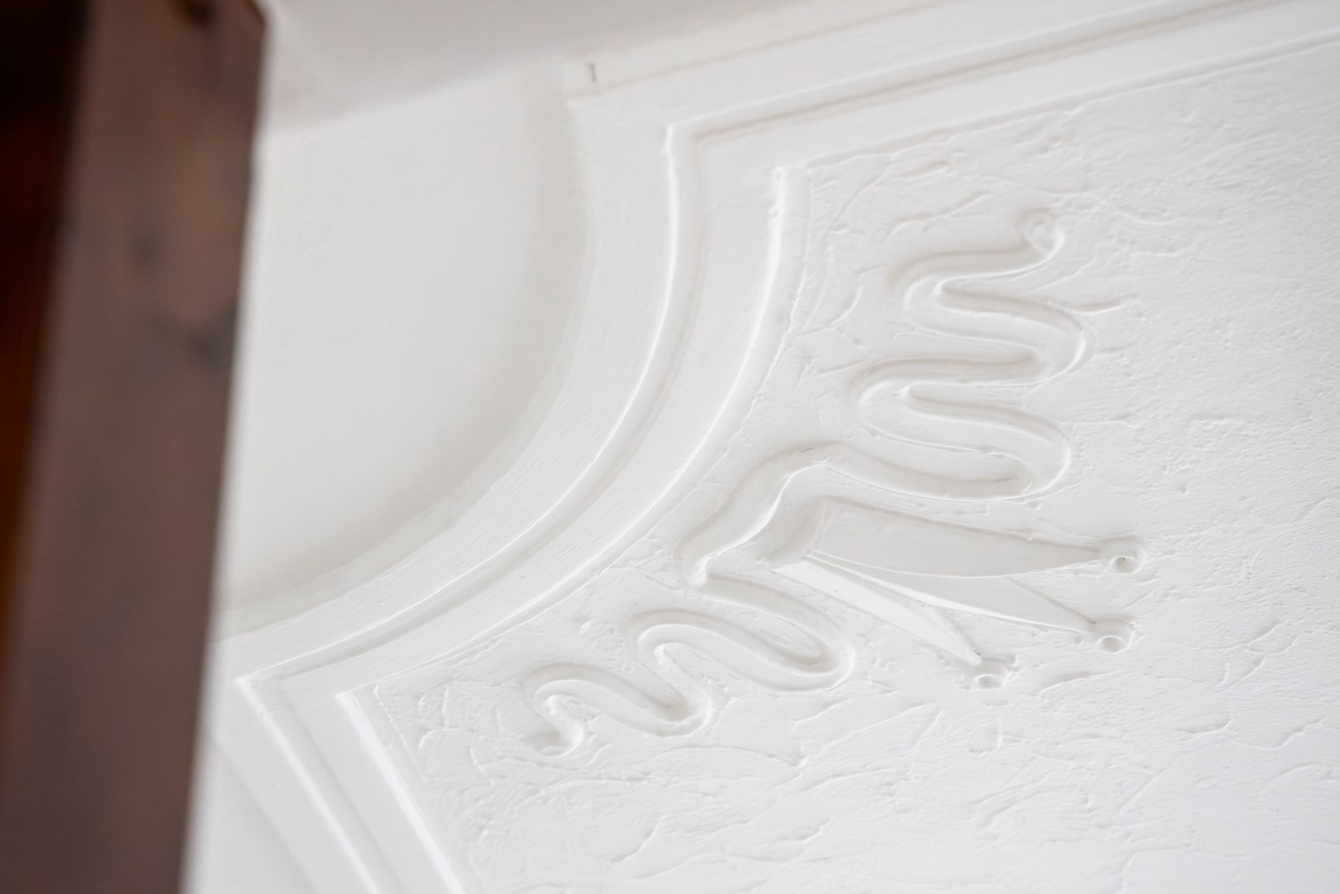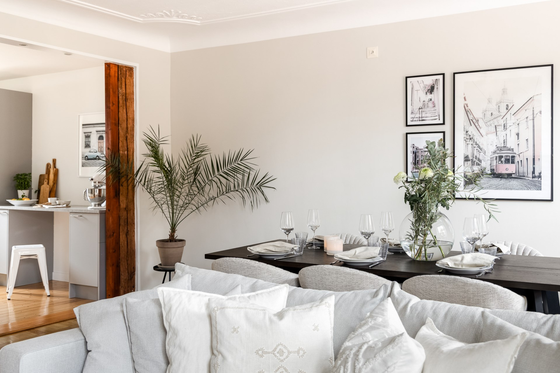 Ett kliv över tröskeln öppnar sig lägenheten. Originaldetaljerna från sekelskiftet syns i tak och fiskbensparketten ligger över golvet. Vi kliver in i lägenhetens allrum och intill entren finns plats för både skor och kläder. Väggarna är målade i en sober ljus ton.