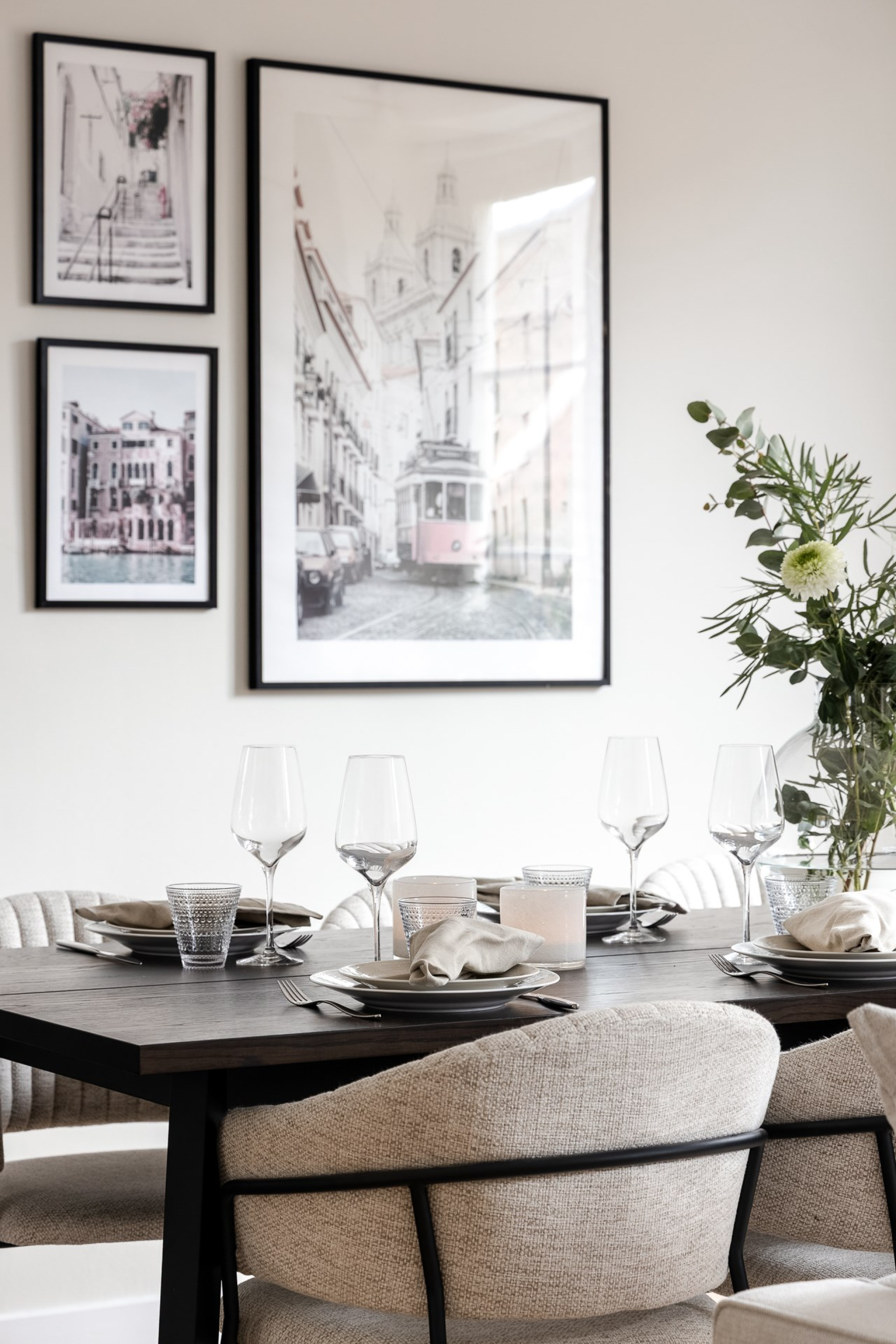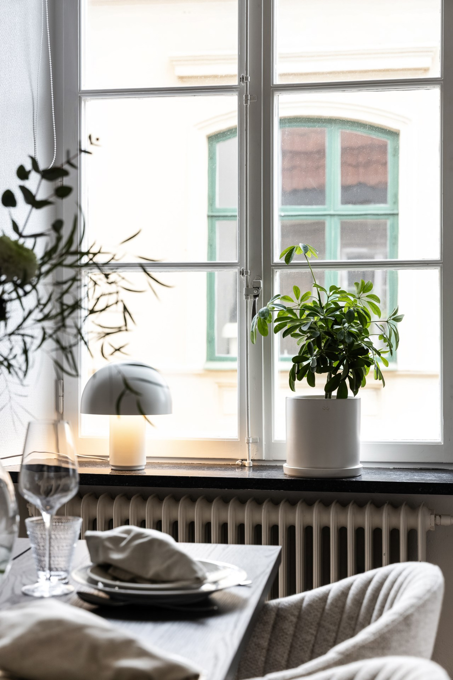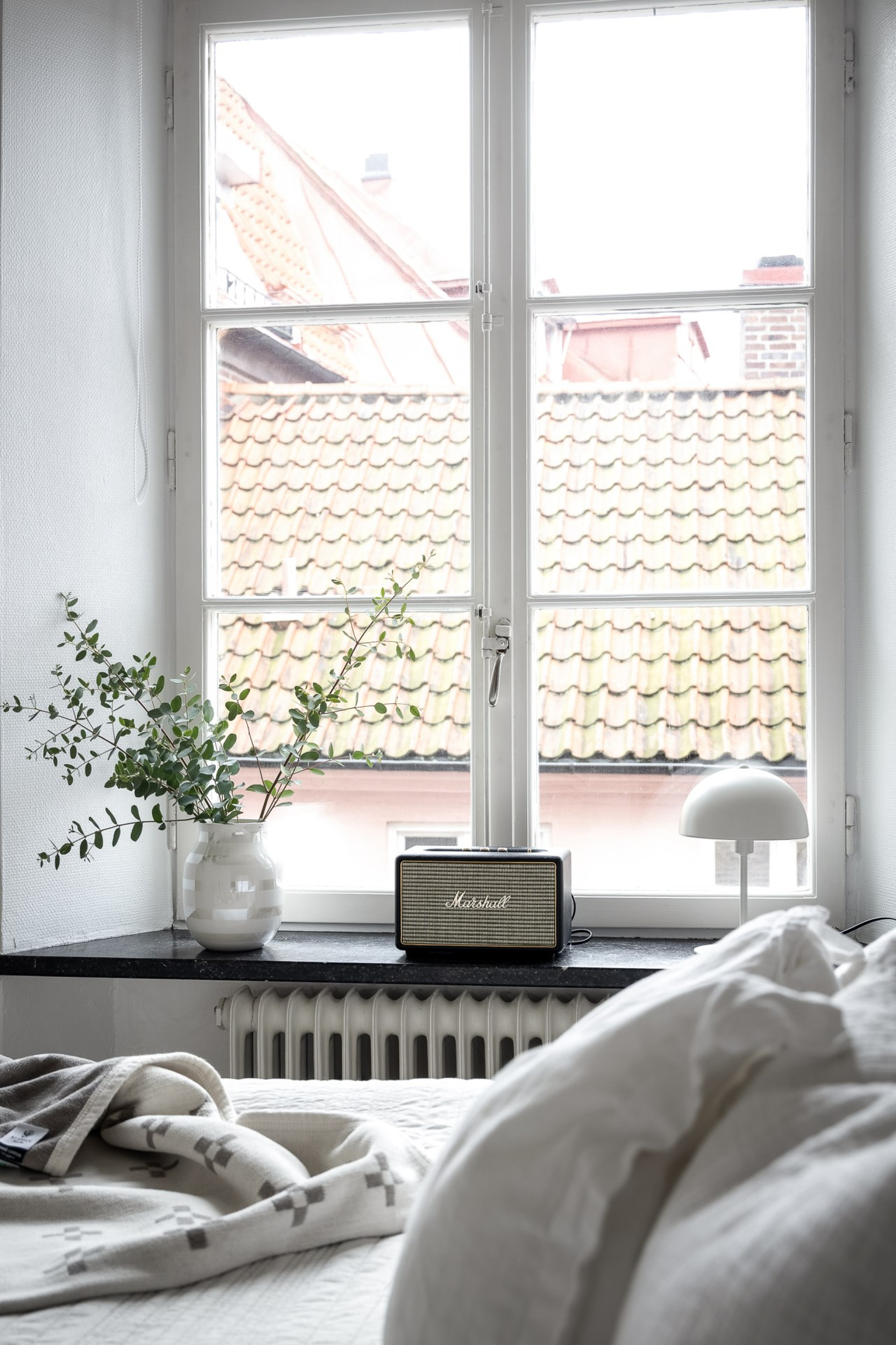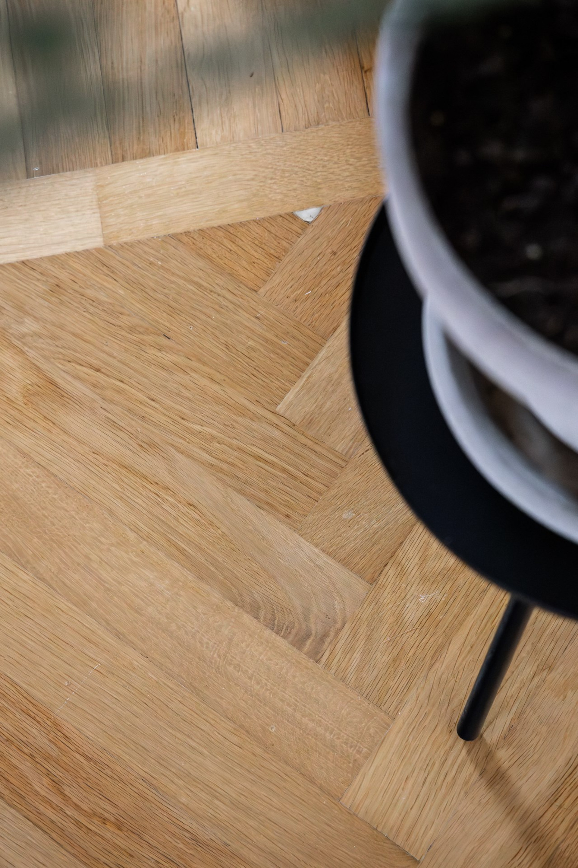 Ett kliv över tröskeln öppnar sig lägenheten. Originaldetaljerna från sekelskiftet syns i tak och fiskbensparketten ligger över golvet. Vi kliver in i lägenhetens allrum och intill entren finns plats för både skor och kläder. Väggarna är målade i en sober ljus ton.