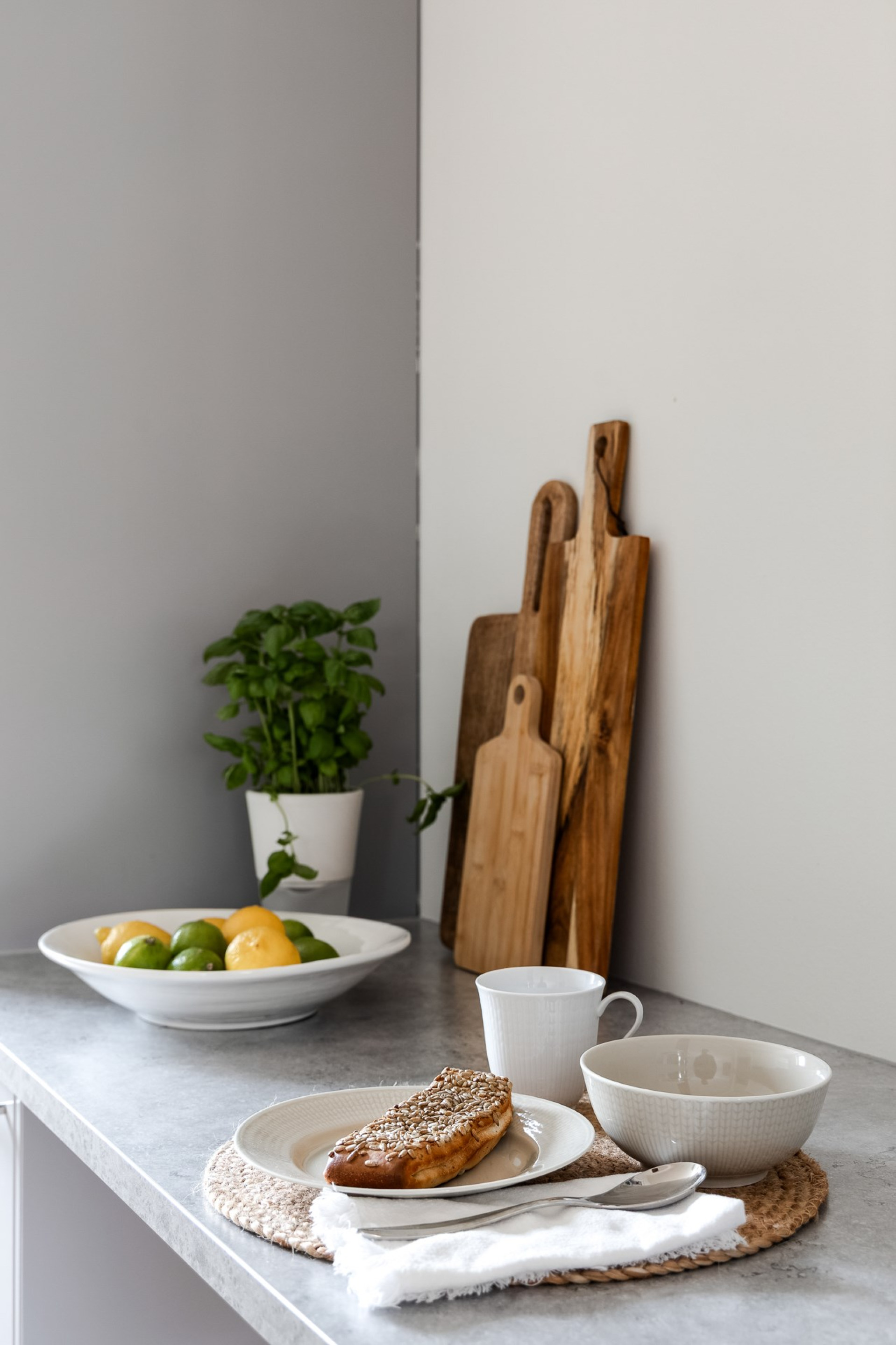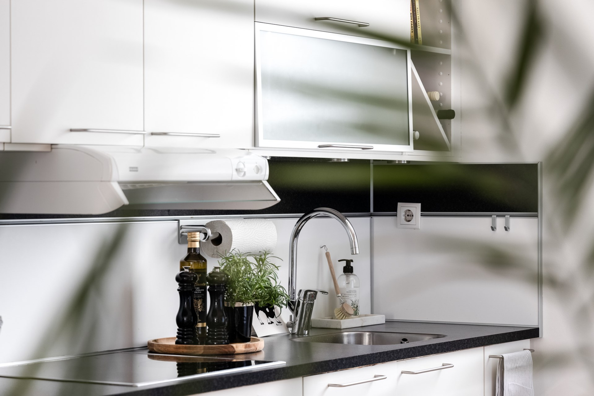 Köket är dubbelsidigt och uppdaterat av föregående ägare. Här ges en ljus och sober inredning med god maskinpark bestående av kombinerad kyl/frys, ugn och micro i arbetshöjd, diskmaskin samt vask och induktionshäll samt fläkt. Här ges gott om i både över och underskåp samt en gedigen arbetsyta kombinerad med bardisk. På golv ligger ett brädgolv och väggarna är ljusa.