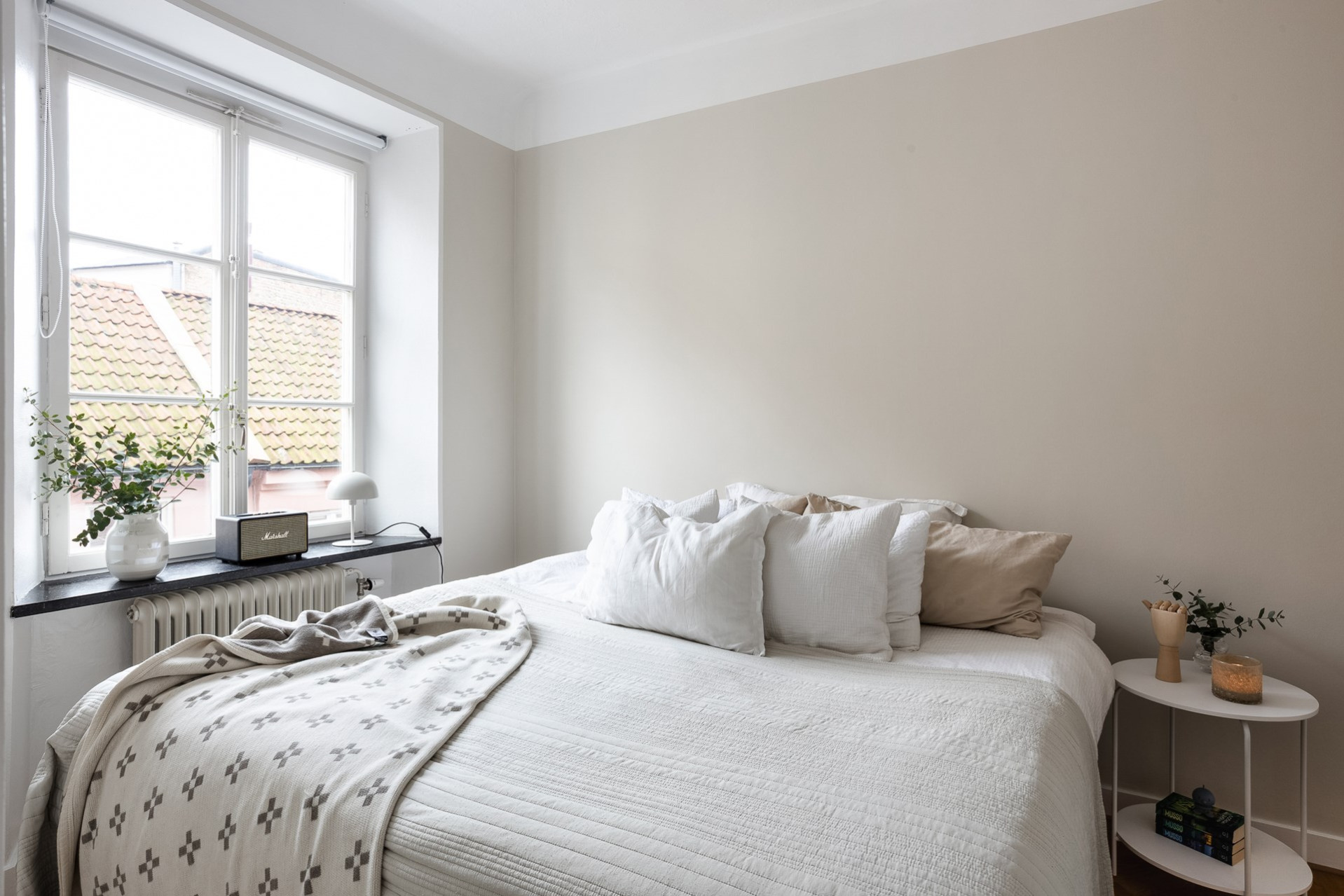 Sovrummet är tilltaget och ger plats åt både säng, nattduksbord samt garderober som idag står. Invid garderoberna ryms ett mindre skrivbord eller varför inte bygga en komplett garderobsvägg!