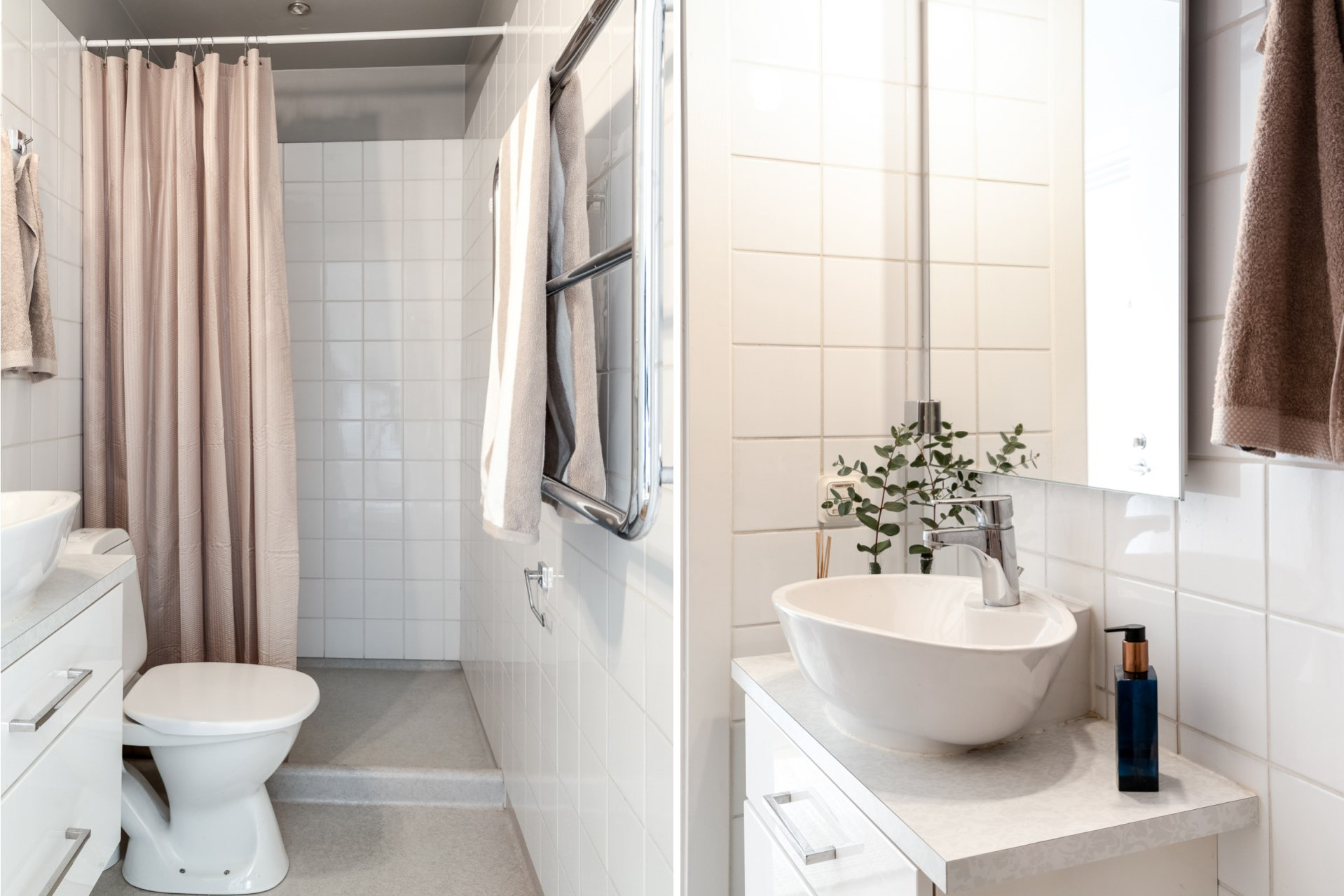 Badrummet är halvkaklat med sitt vita kakel på väggar och heltäckningsmatta på golv. Taket är målat i en grå kulör och helheten ger ett fräscht intryck. Inredningen består av vask med kommod, spegel, WC, handdukshängare samt dusch med drapperi och spotlights i tak.