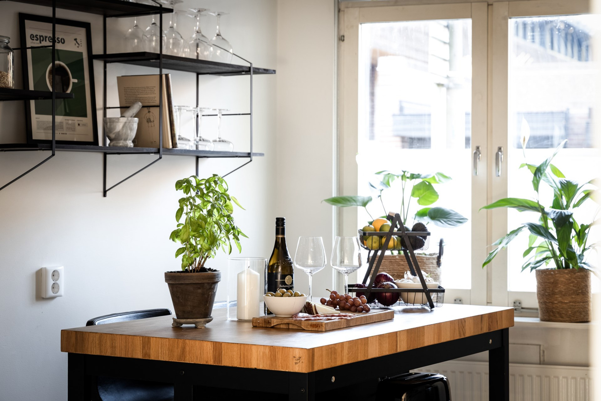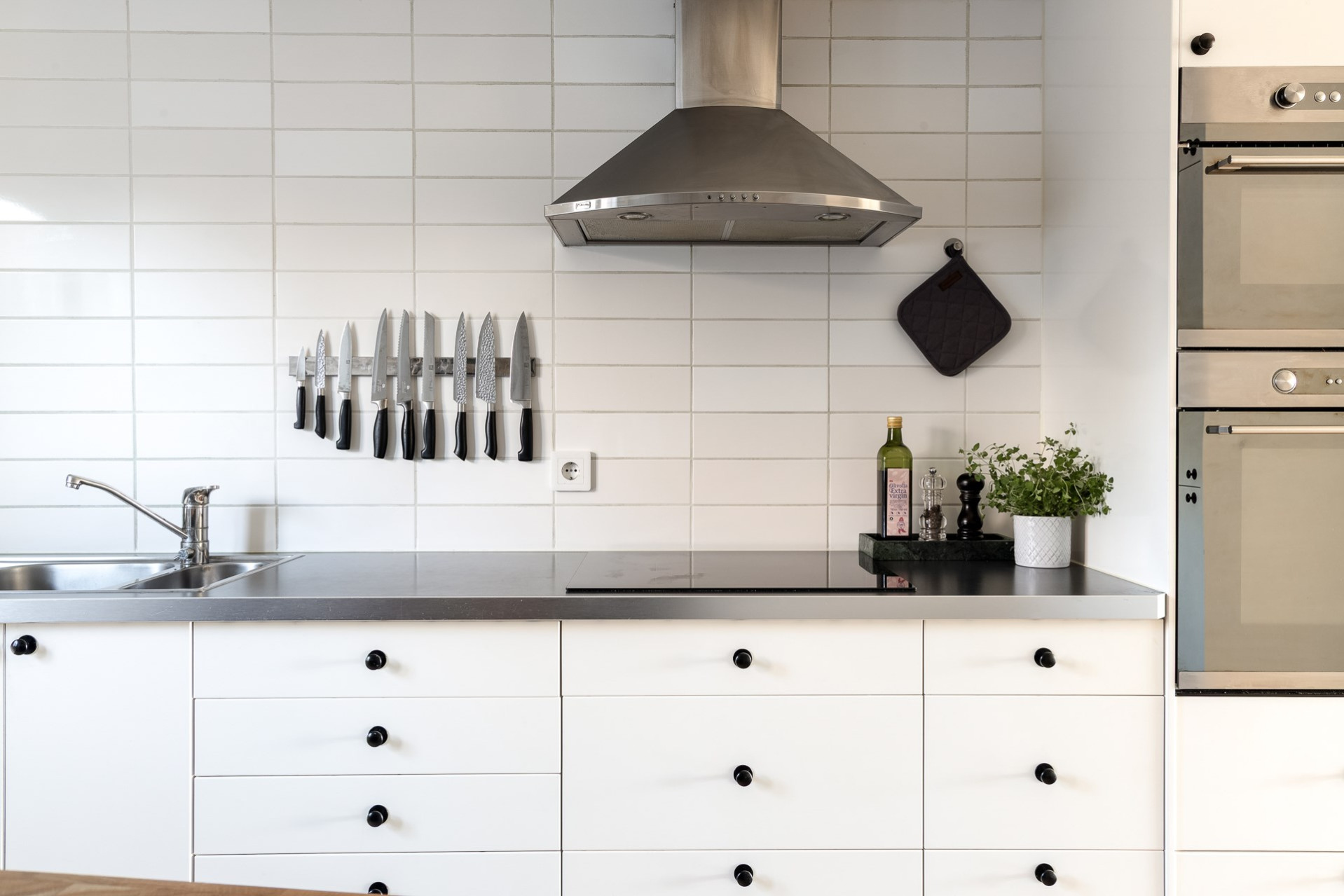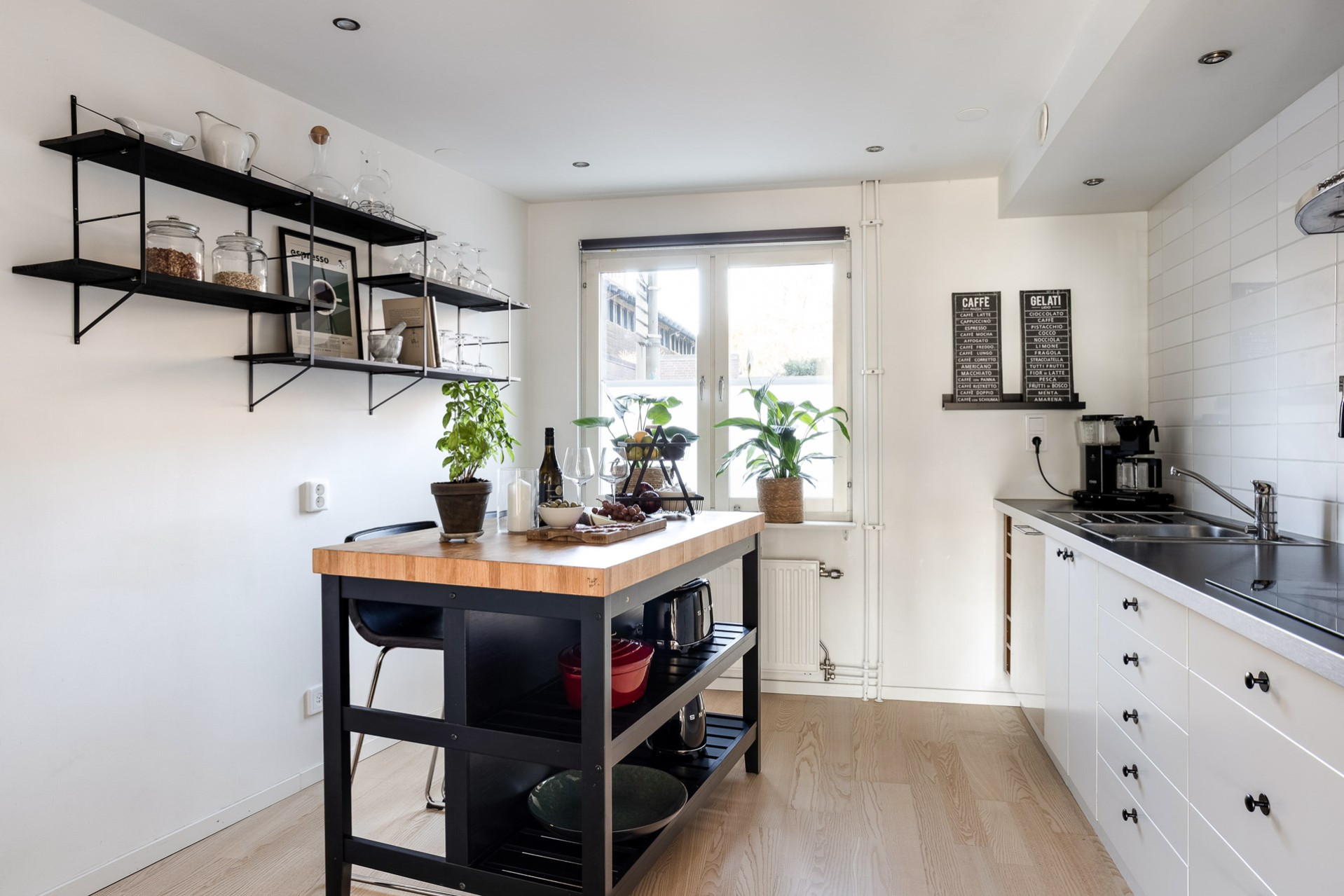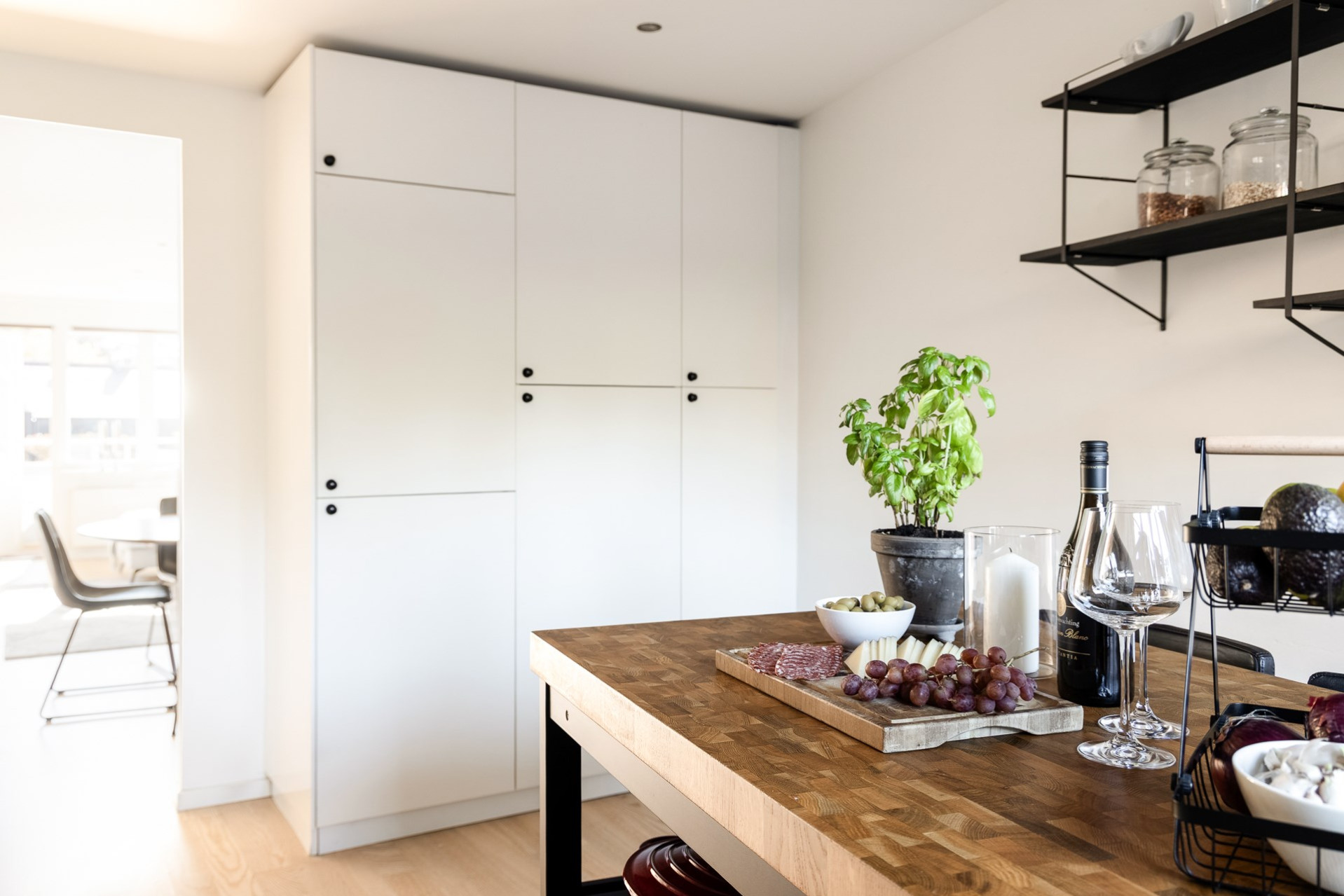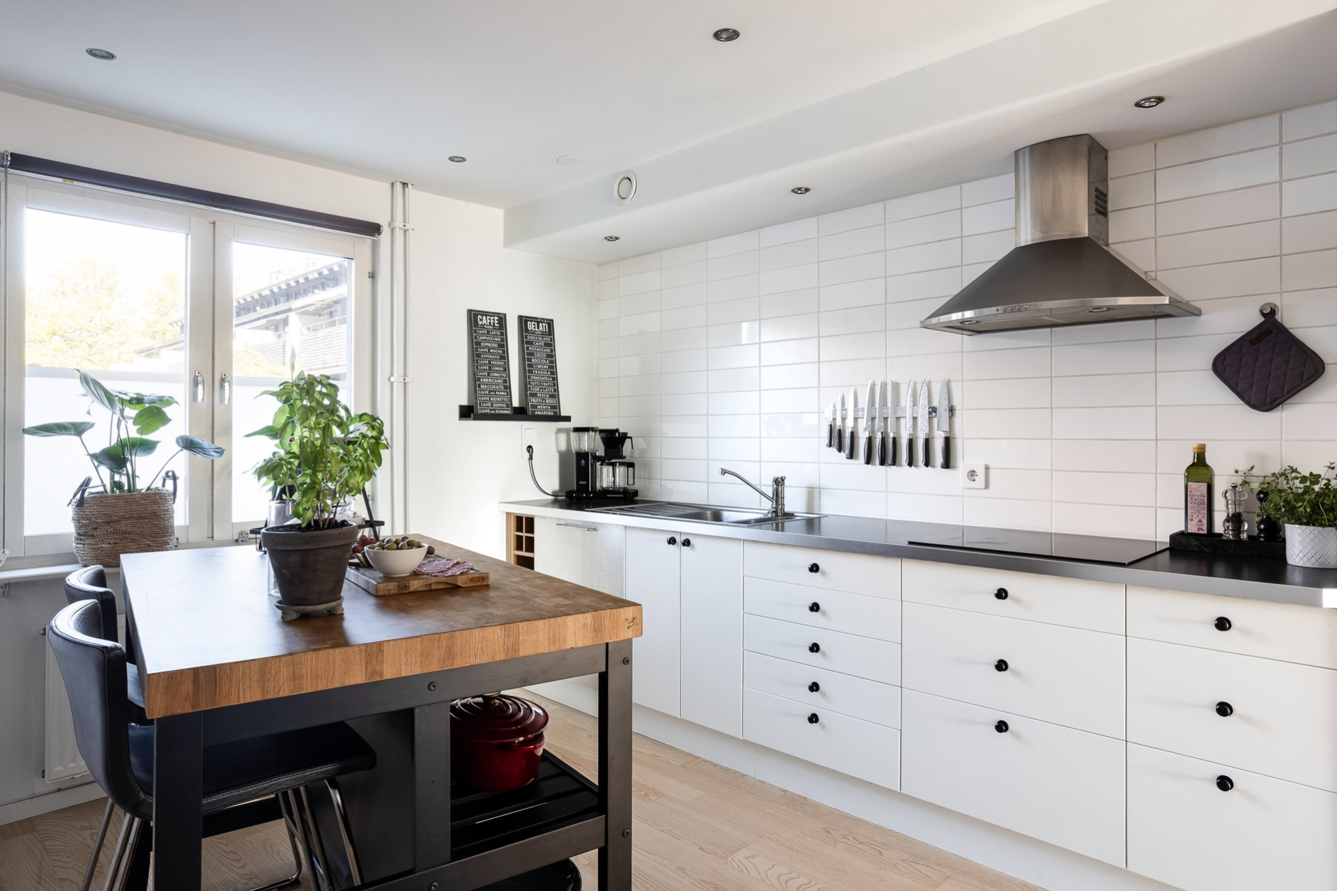 Stort härligt kök med möjlighet till köksö/slaktarbänk i centrum. Vitpigmenterad och mattlackad askparkett, bredspacklade väggar och infällda spotts. Kyl/frys, ugn, induktionshäll, fläkt, micro och diskmaskin.