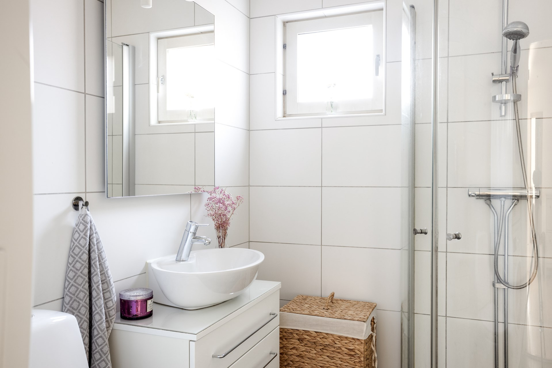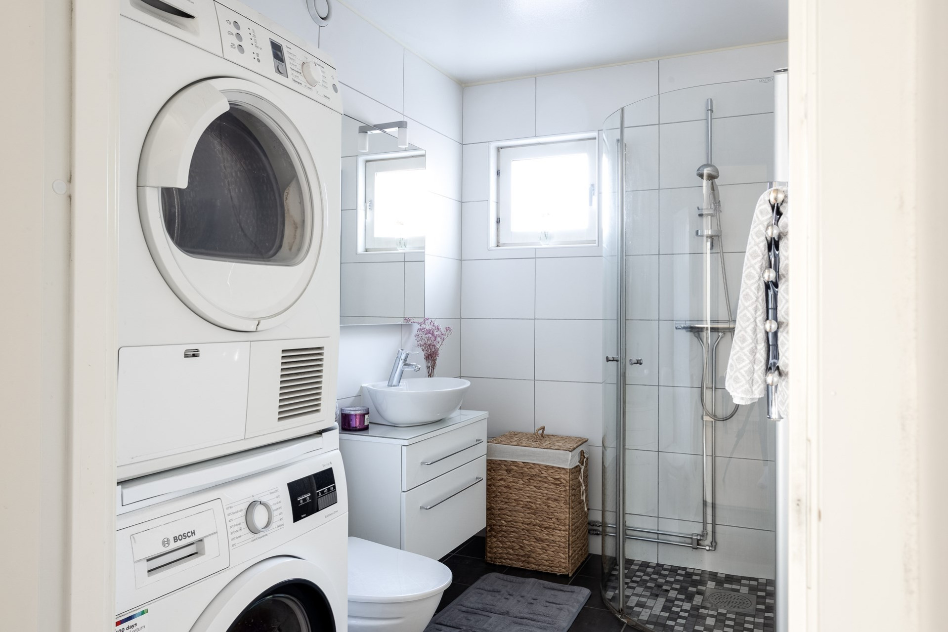 Helkaklat med klinker i grått och kakel i vitt. Porslin följer genom vask med förvaring och toalett. Dusch med vikvägg, handukstork samt tvättpelare bestående av tvättmaskin & torktumlare. Golvvärme och vädringsfönster.