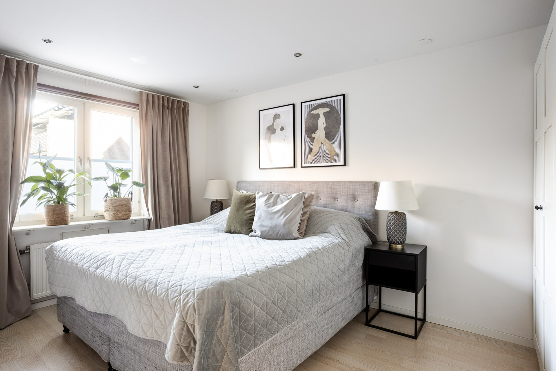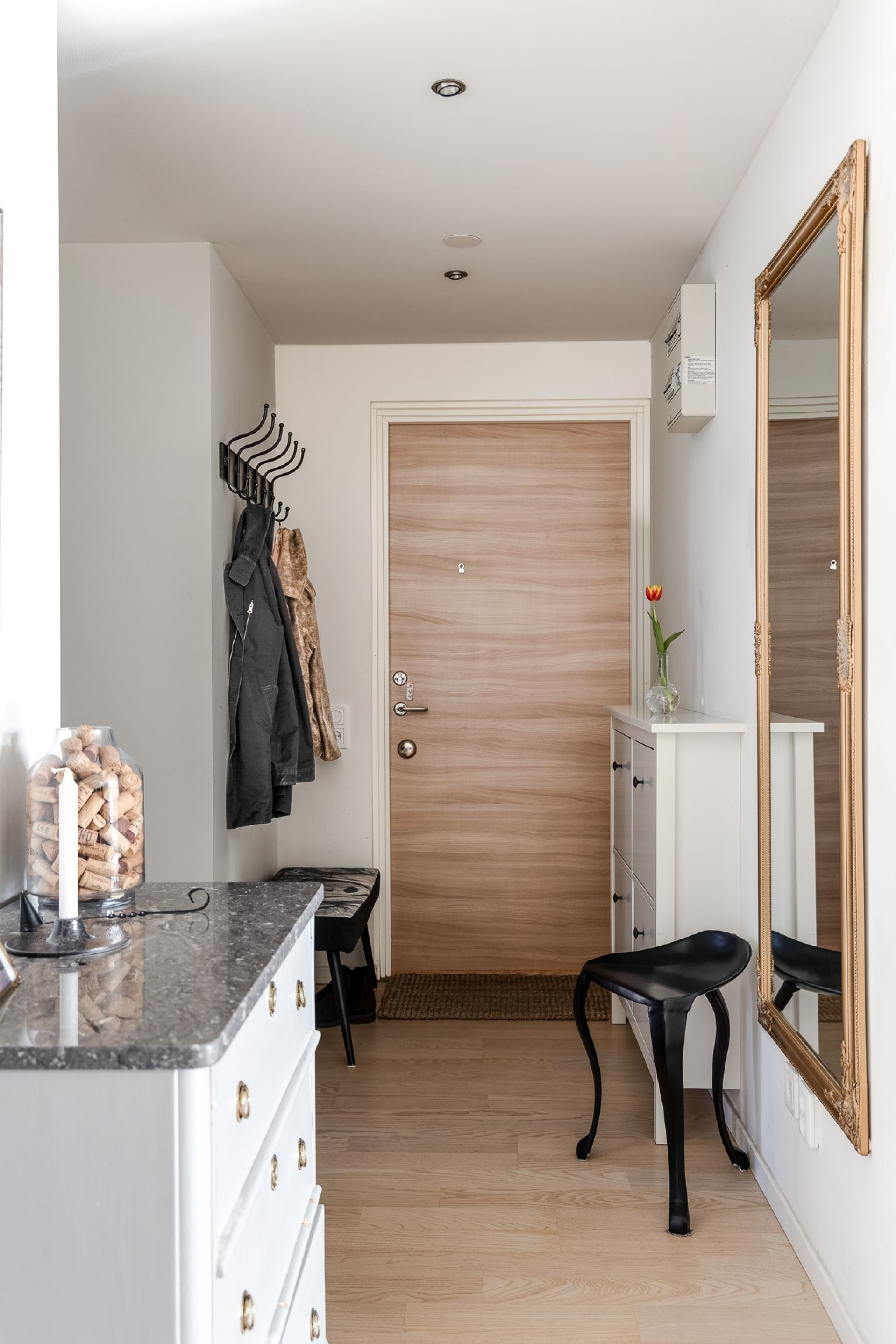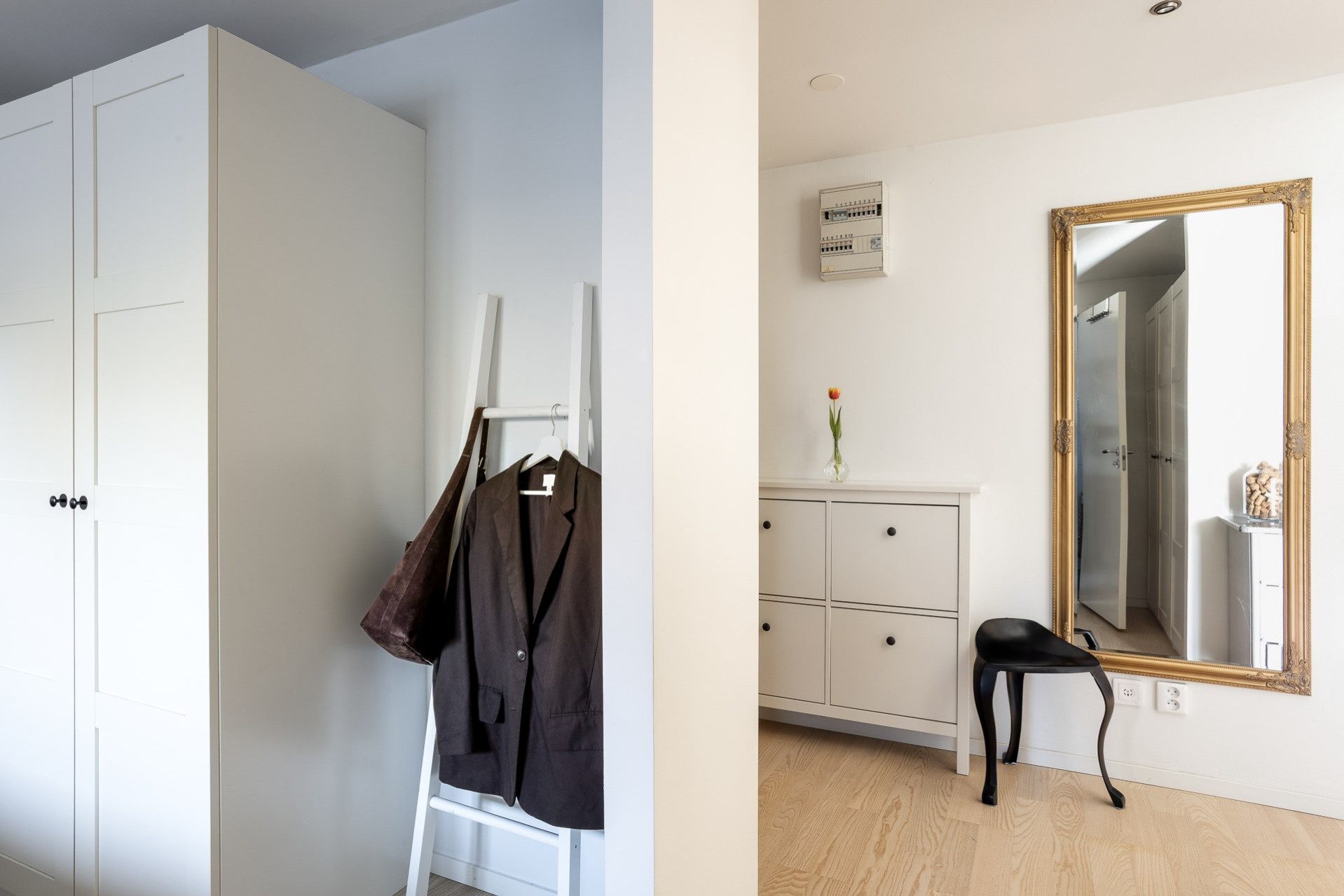 Vitpigmenterad och mattlackad askparkett, infällda spotts, bredspacklade väggar i vitt och garderober till förvaring.