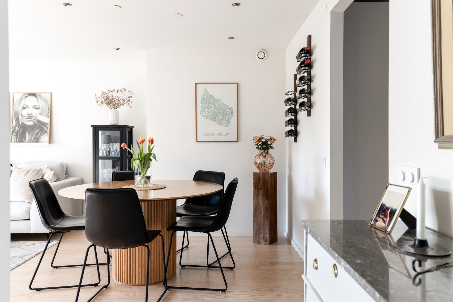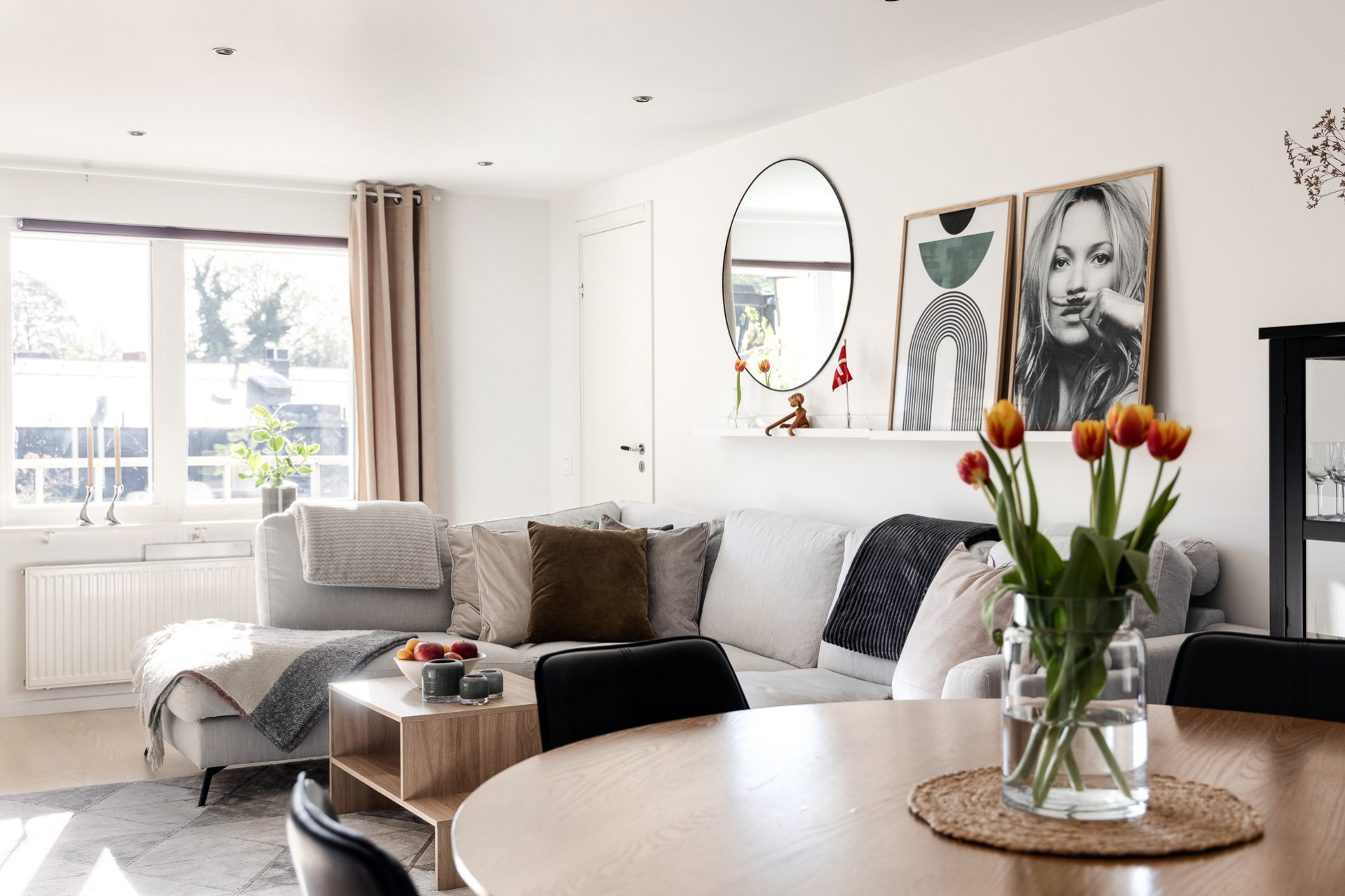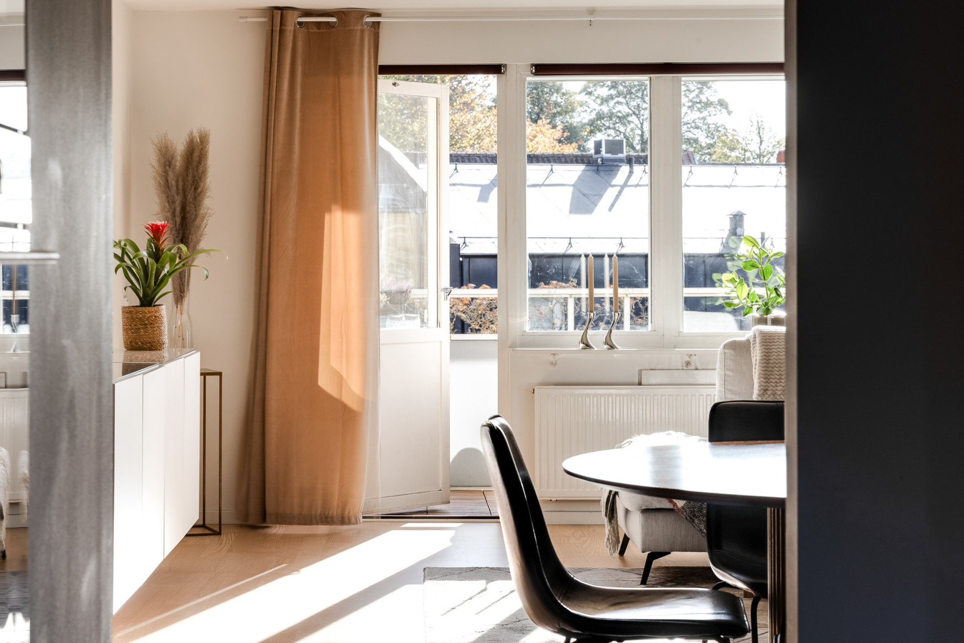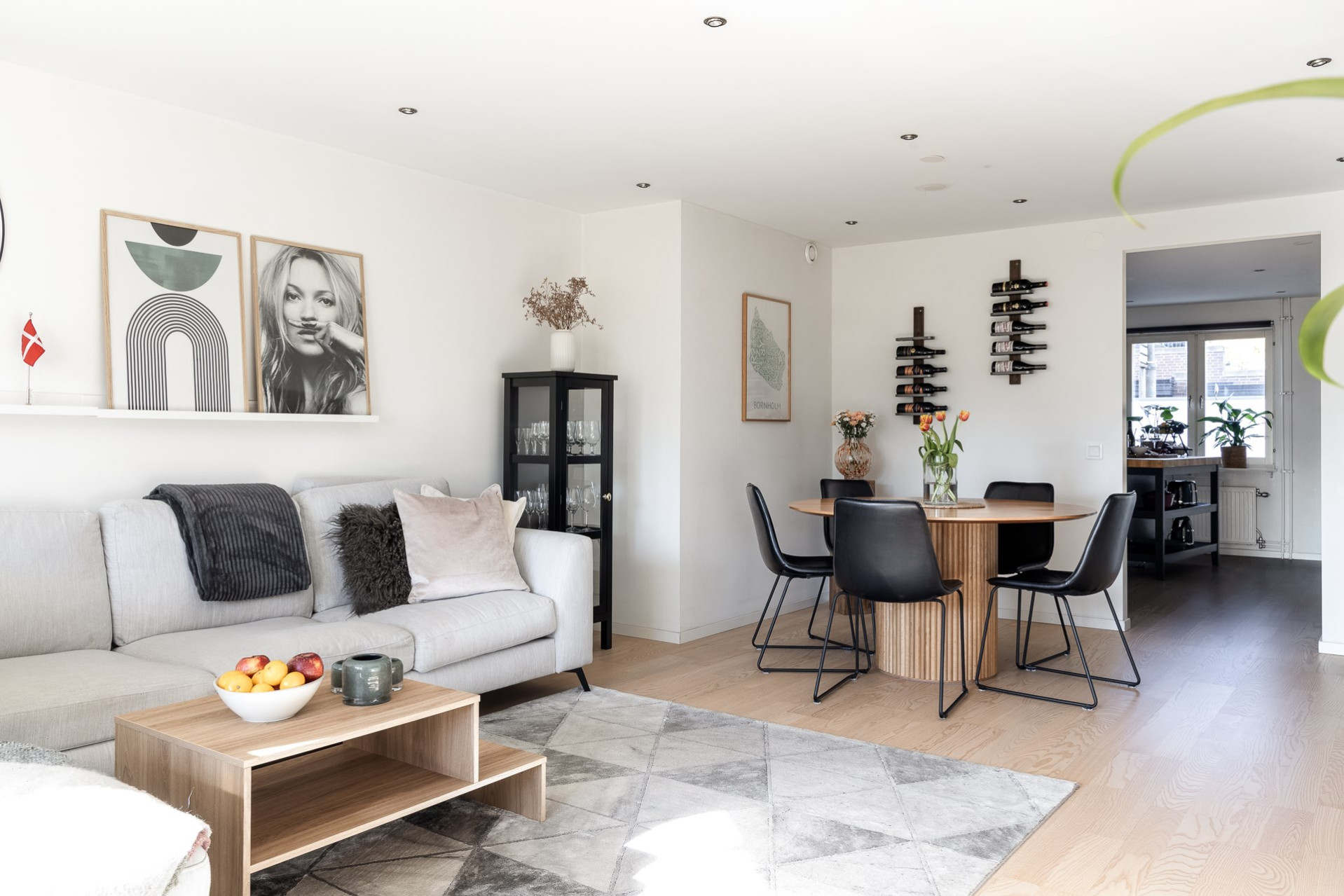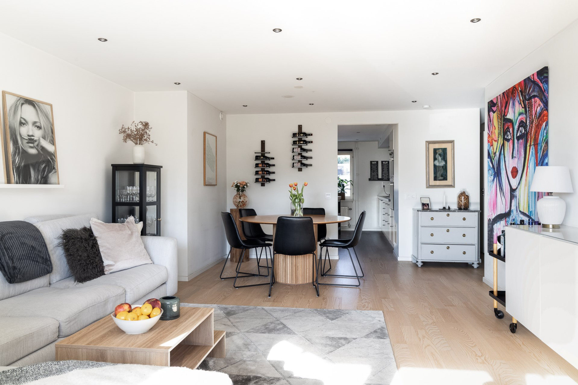 Rymligt med fint ljusinsläpp och plats för både större soffgrupp, arbetshörna och matplats för 6-8 personer. Vitpigmenterad och mattlackad askparkett, bredspacklade väggar, och infällda spotts. Vidare finner vi ett extra förvaringsutrymme samt utgång till balkongen.