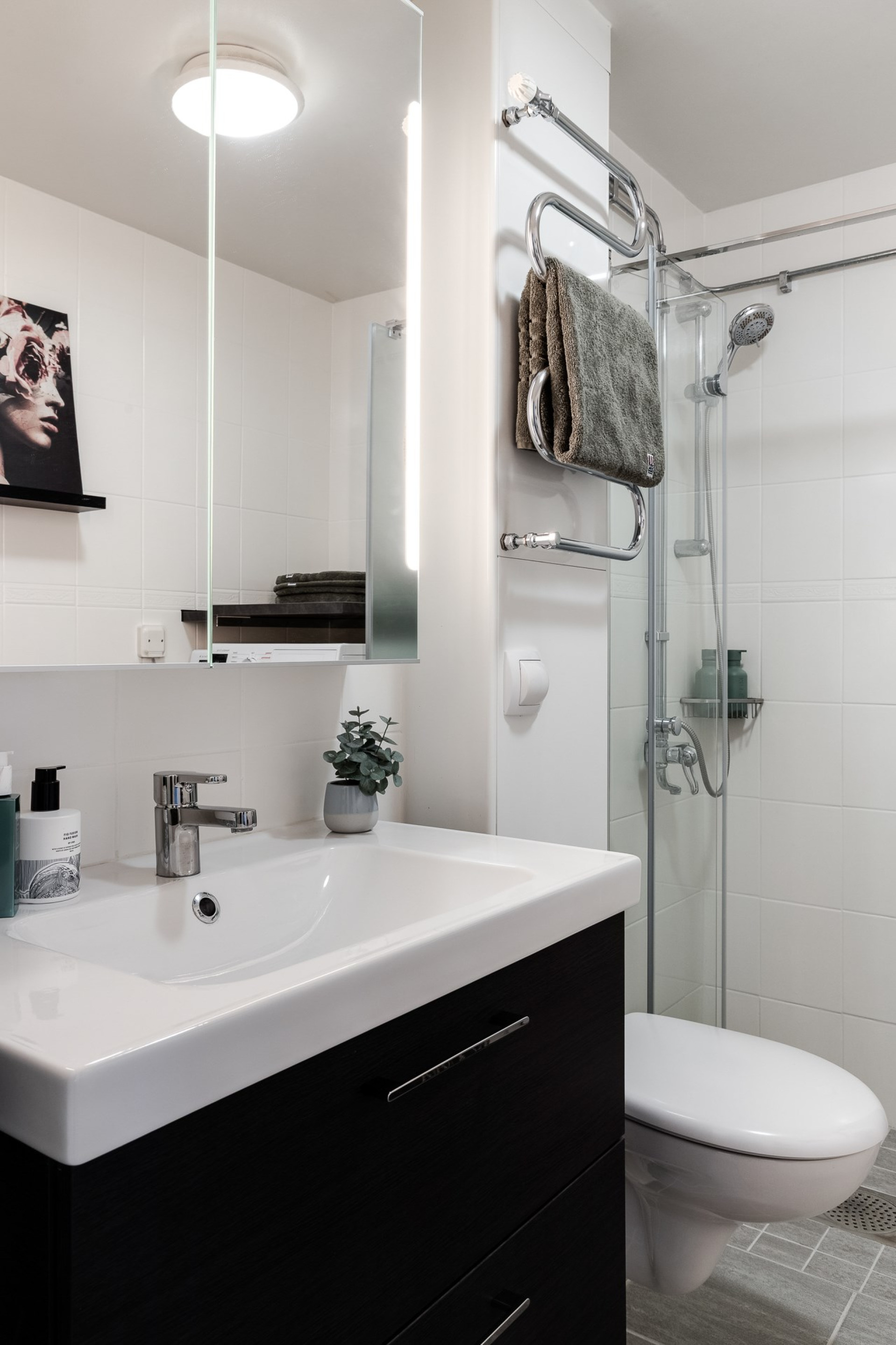 Ljust och helkaklat badrum med duschhörna, handfat, wc samt kombimaskin för tvätt och tork.