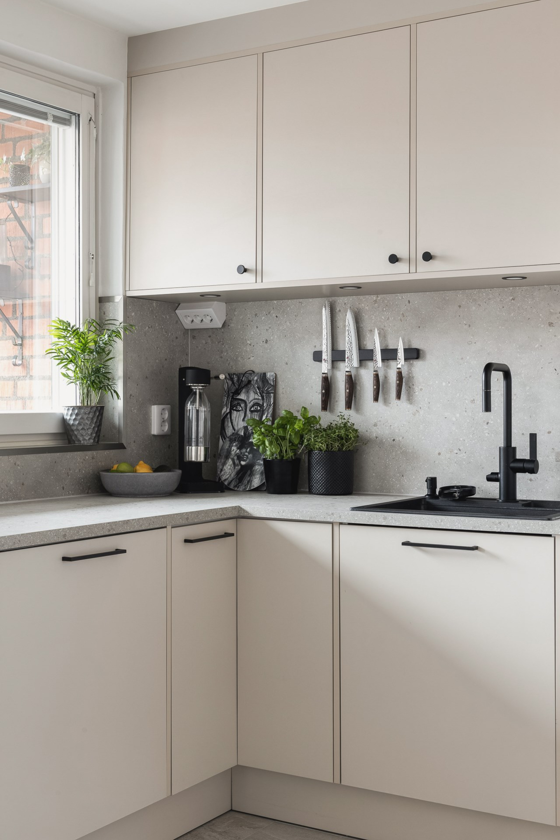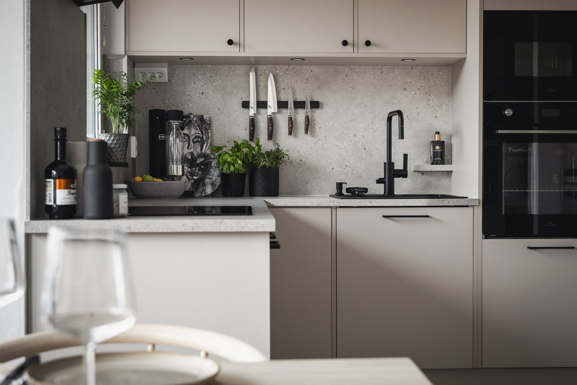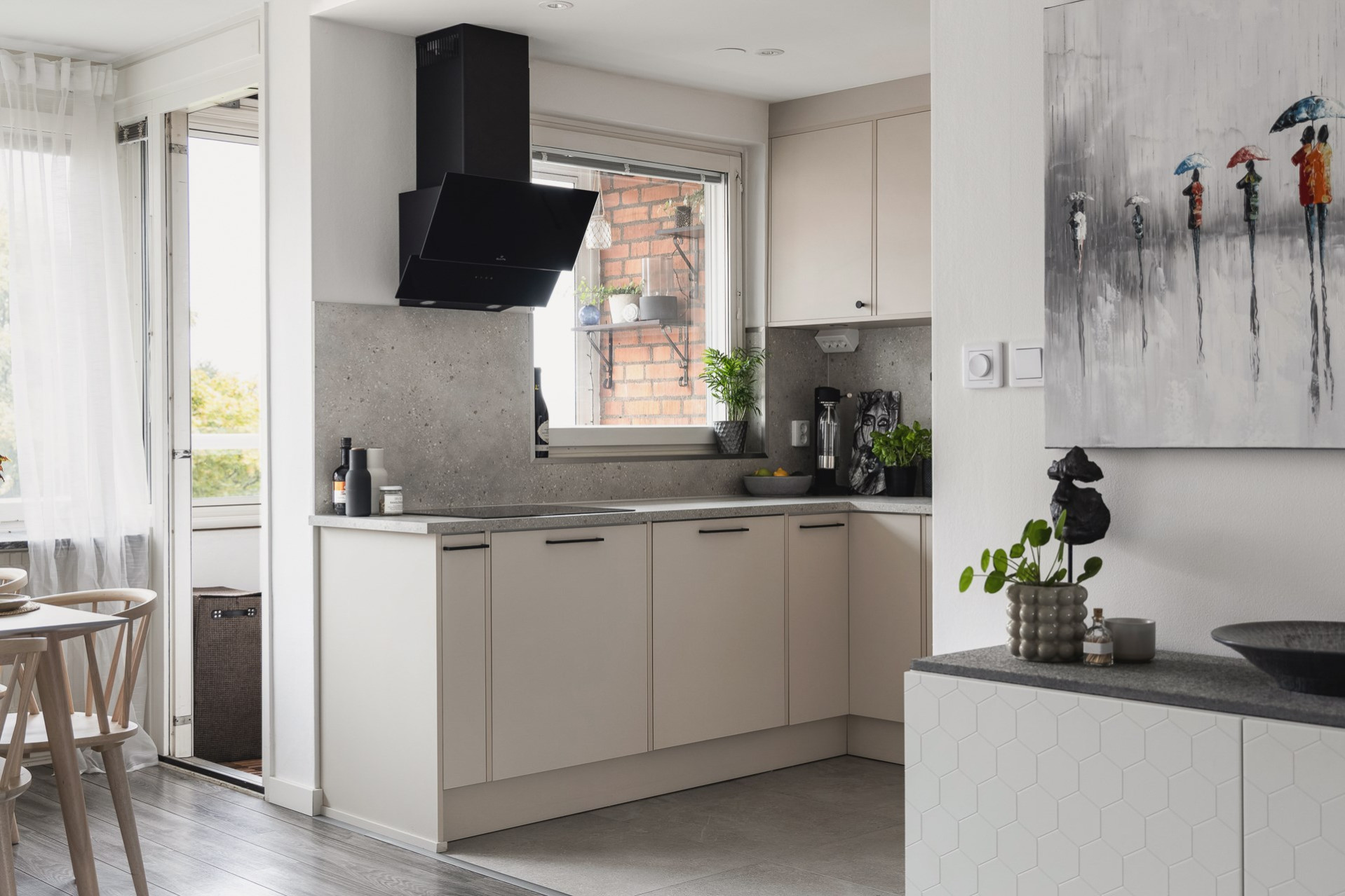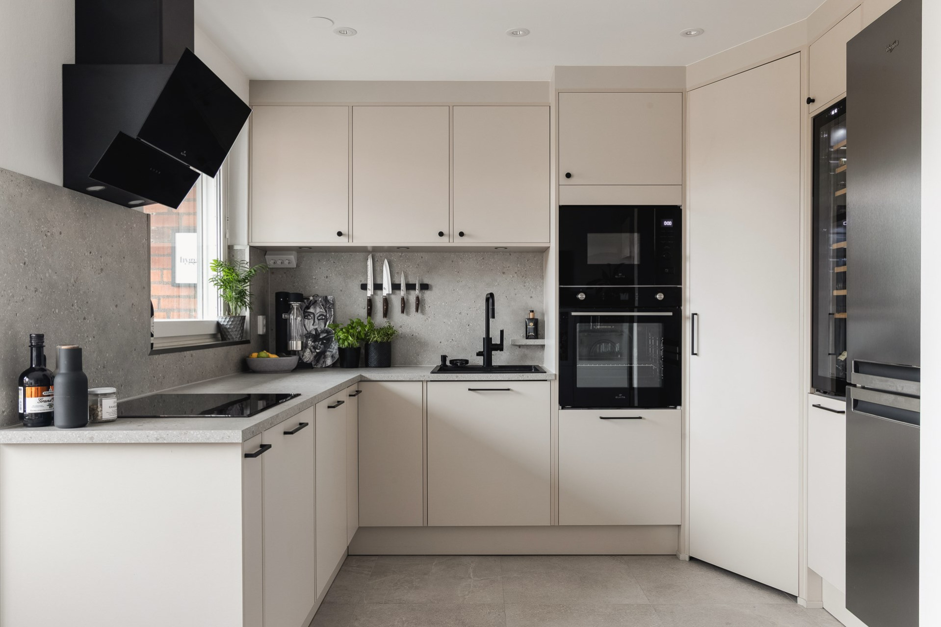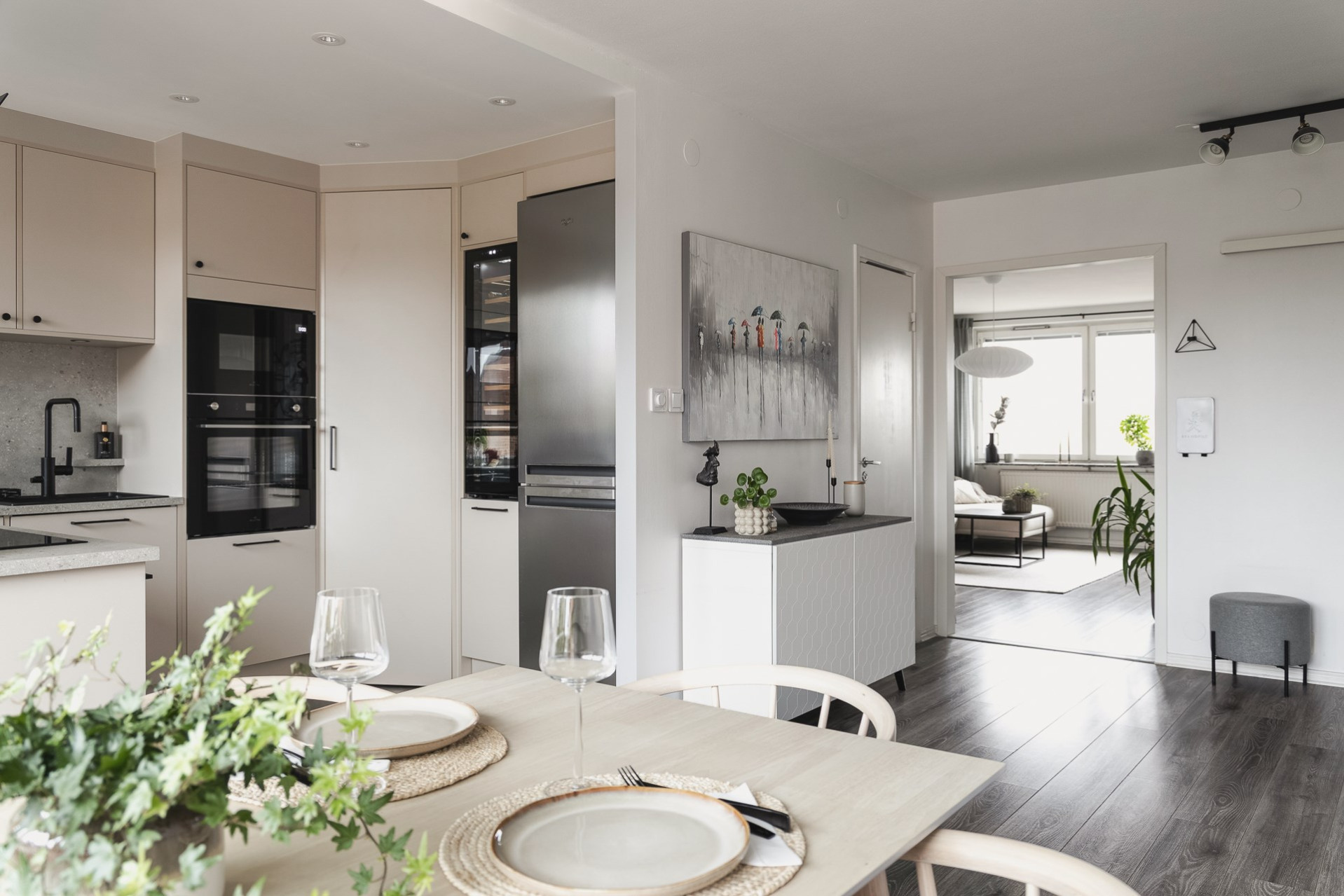 Köket totalrenoverades 2023 med inredning från Epoq. Ett riktigt snyggt kök med många smart lösningar som t ex det stora skafferiet i ena hörnet. Utöver detta består inredningen i köket av kombinerad kyl och frys, inbyggnadsugn och mikro, induktionshäll, diskmaskin, fläkt och inbyggd vinkyl.