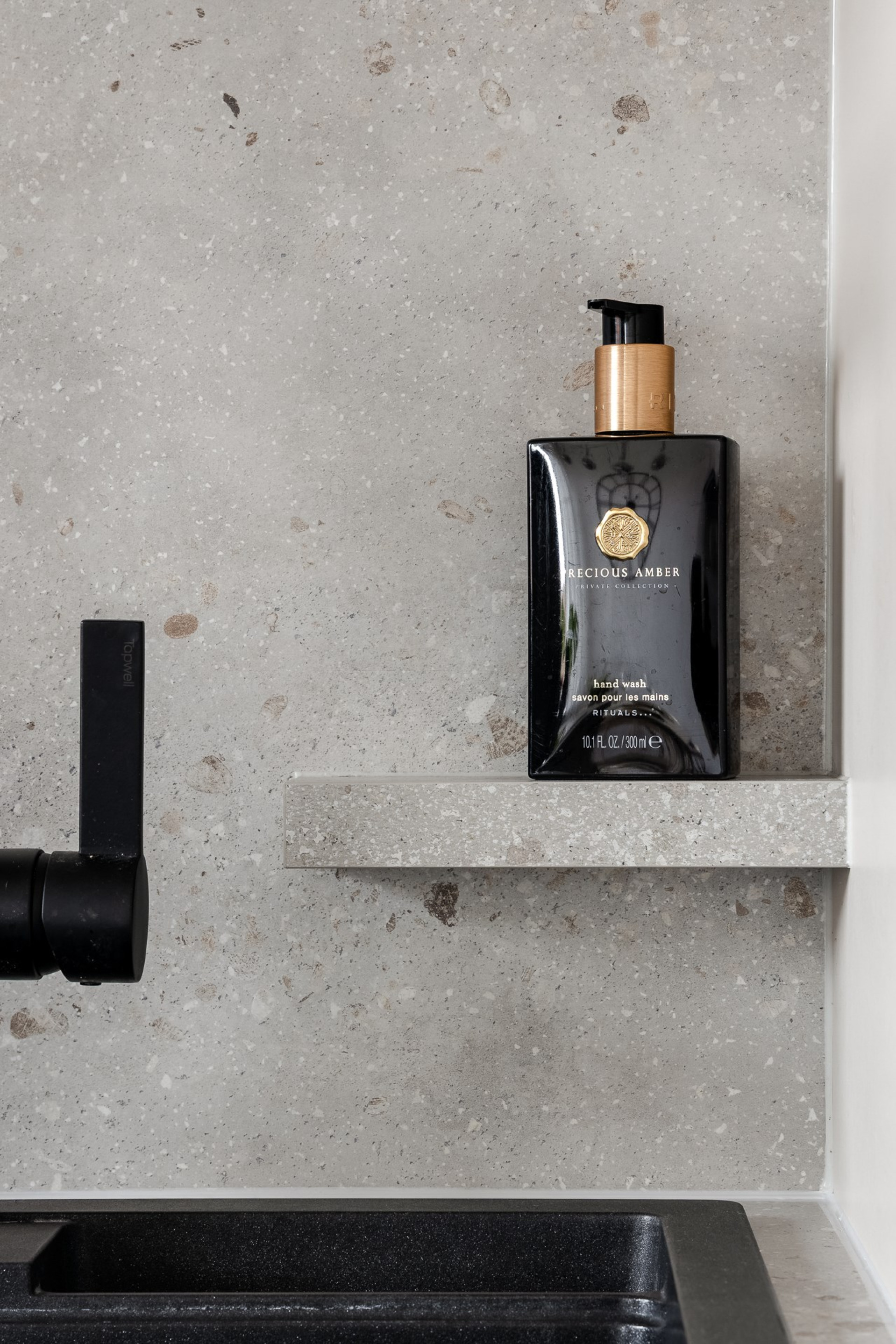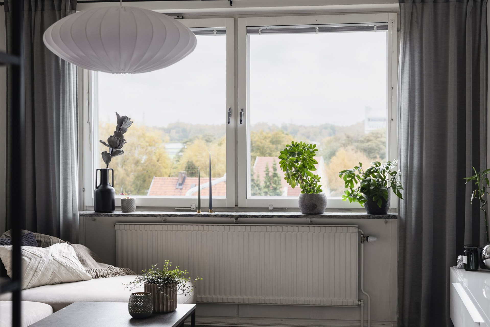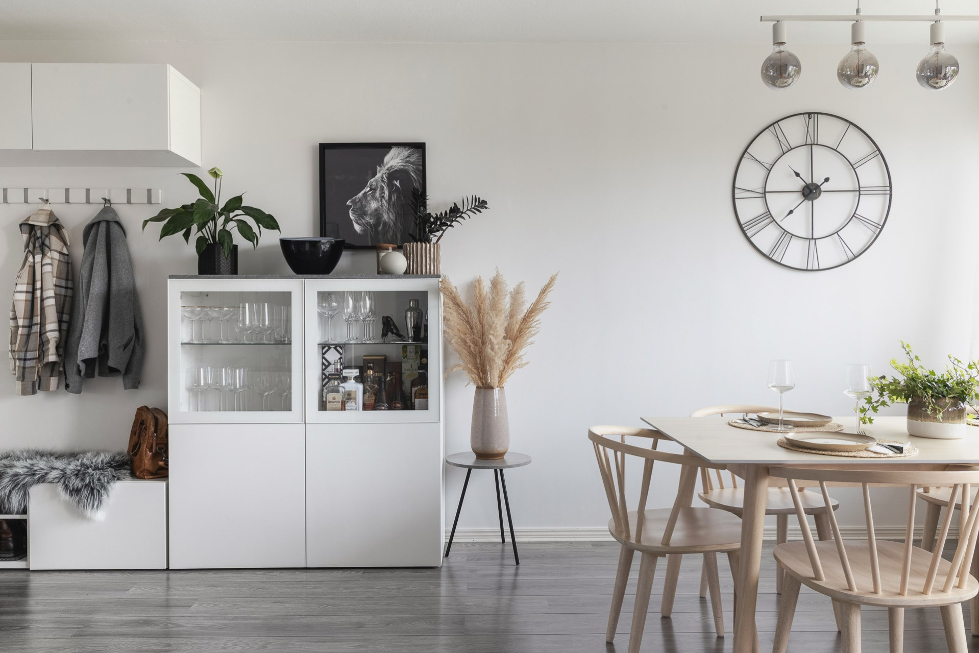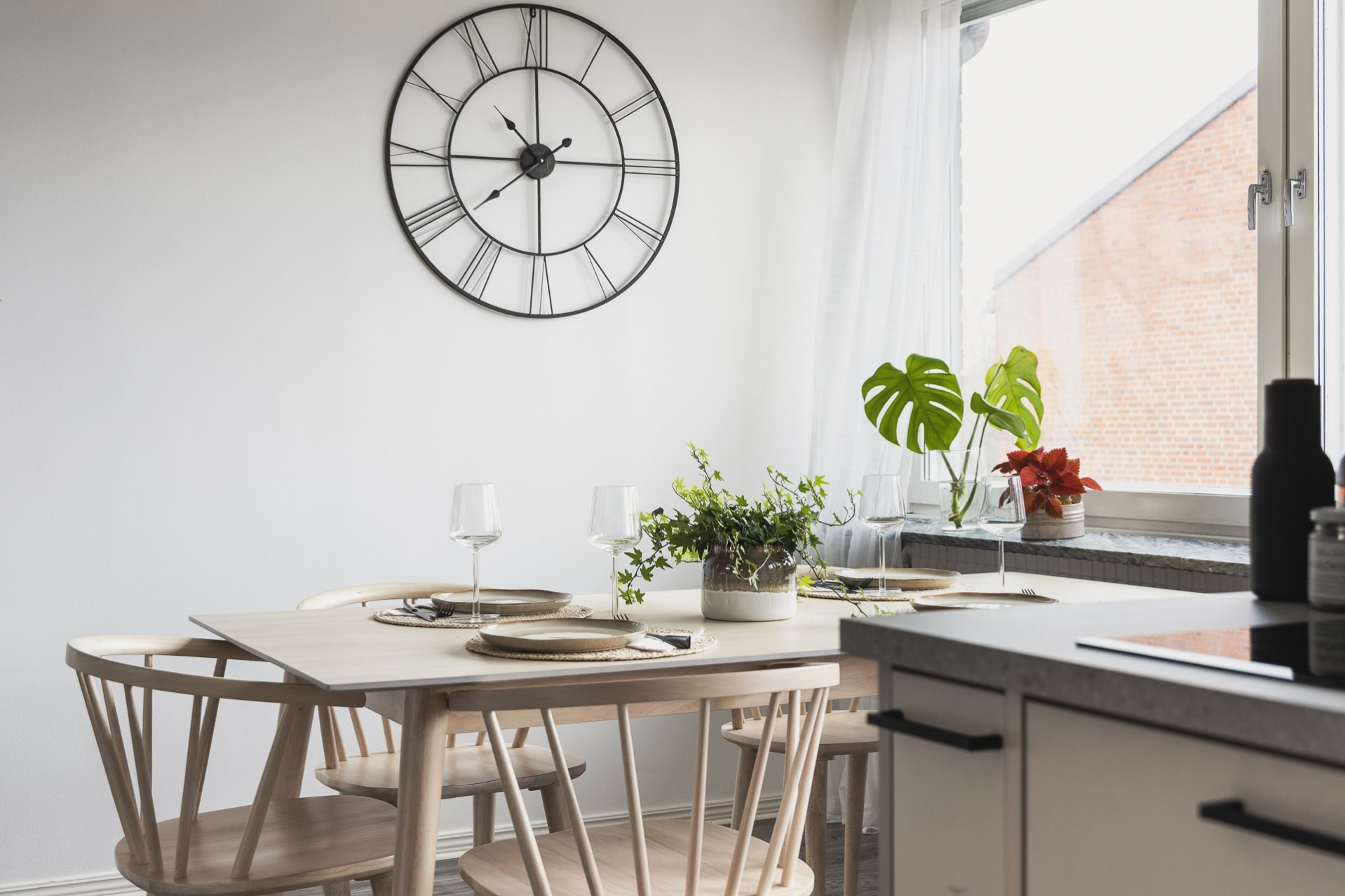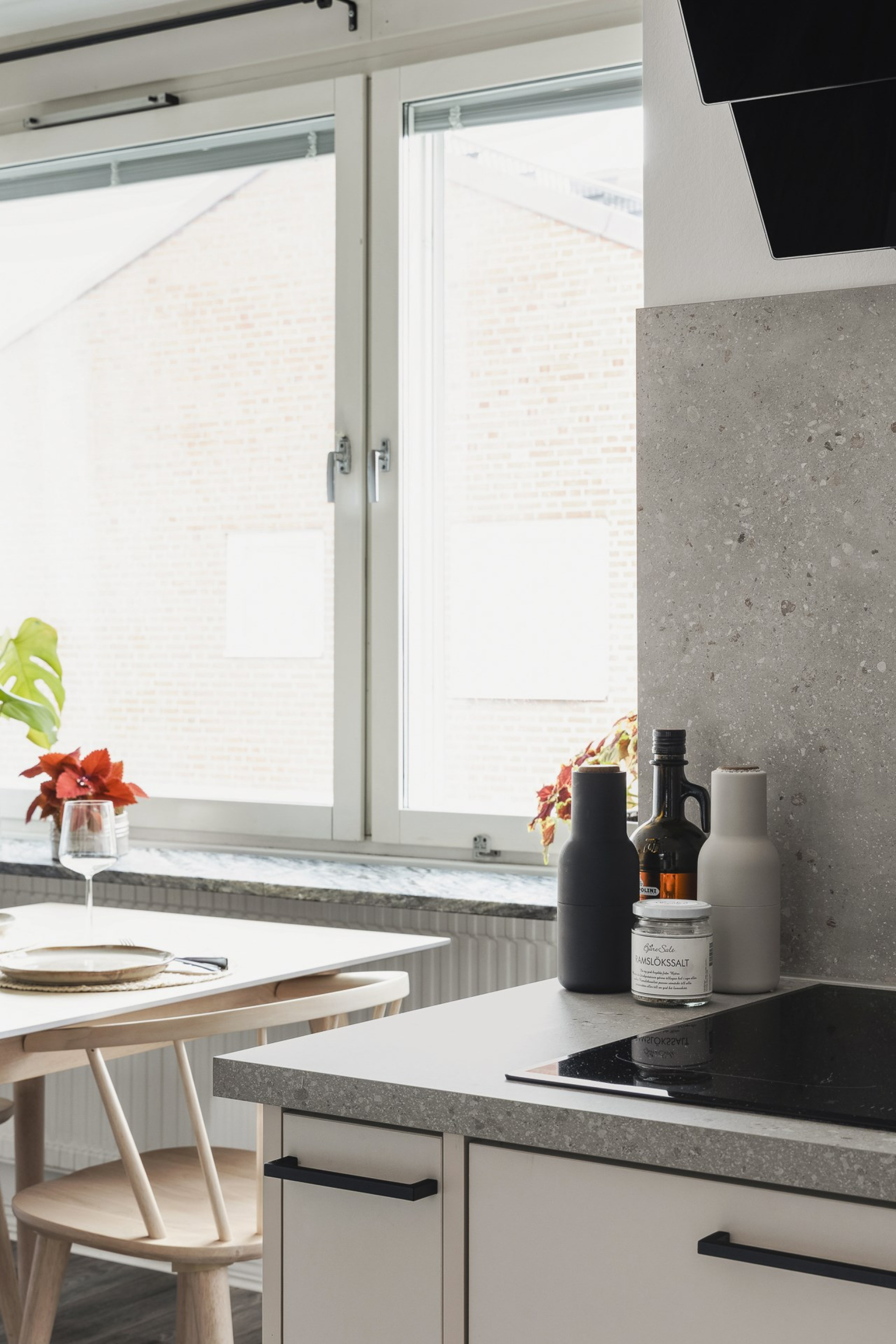 Köket totalrenoverades 2023 med inredning från Epoq. Ett riktigt snyggt kök med många smart lösningar som t ex det stora skafferiet i ena hörnet. Utöver detta består inredningen i köket av kombinerad kyl och frys, inbyggnadsugn och mikro, induktionshäll, diskmaskin, fläkt och inbyggd vinkyl.