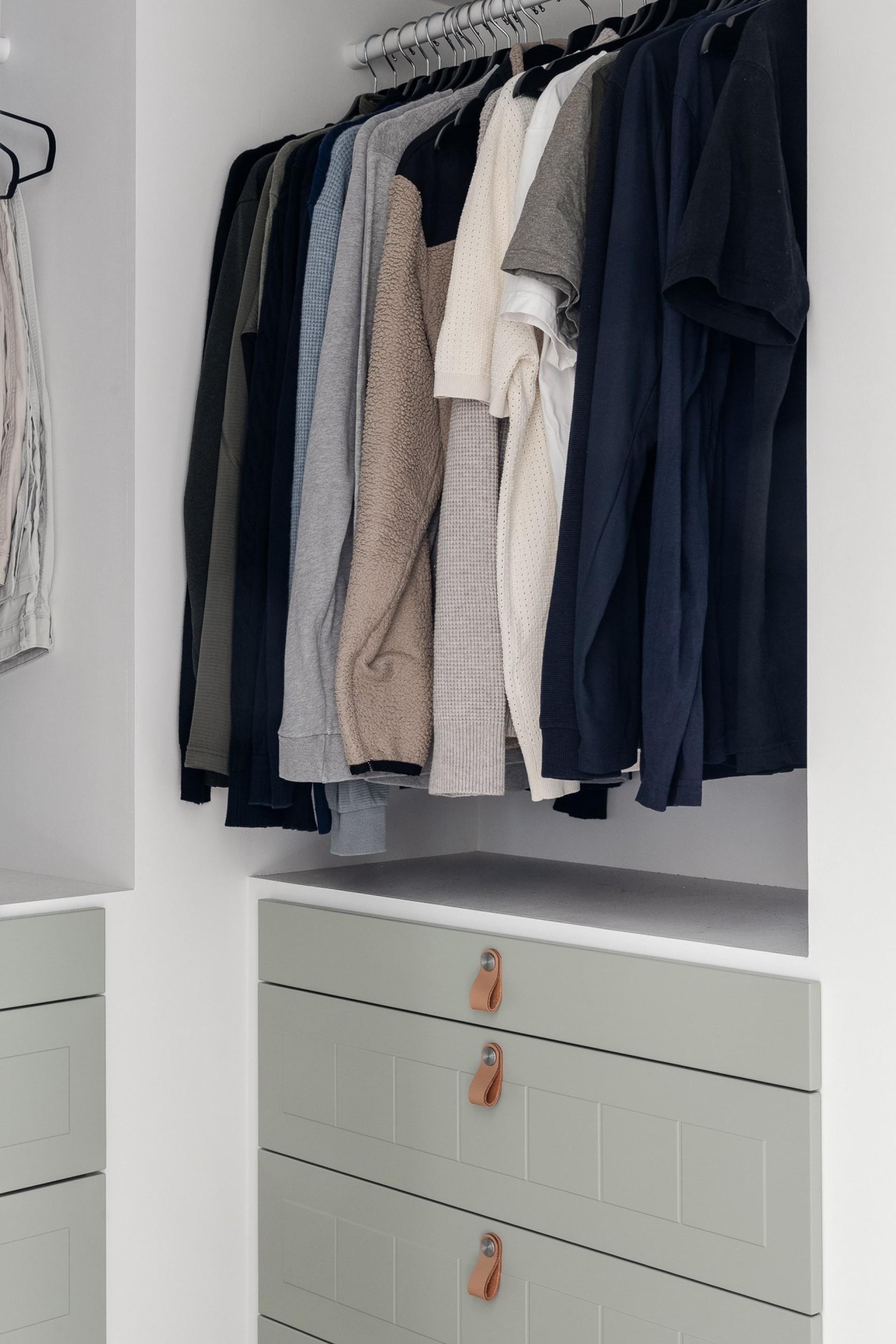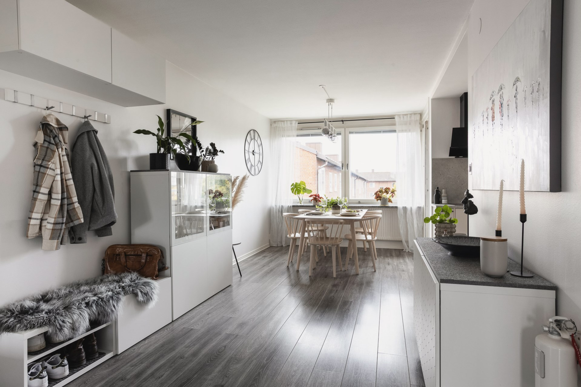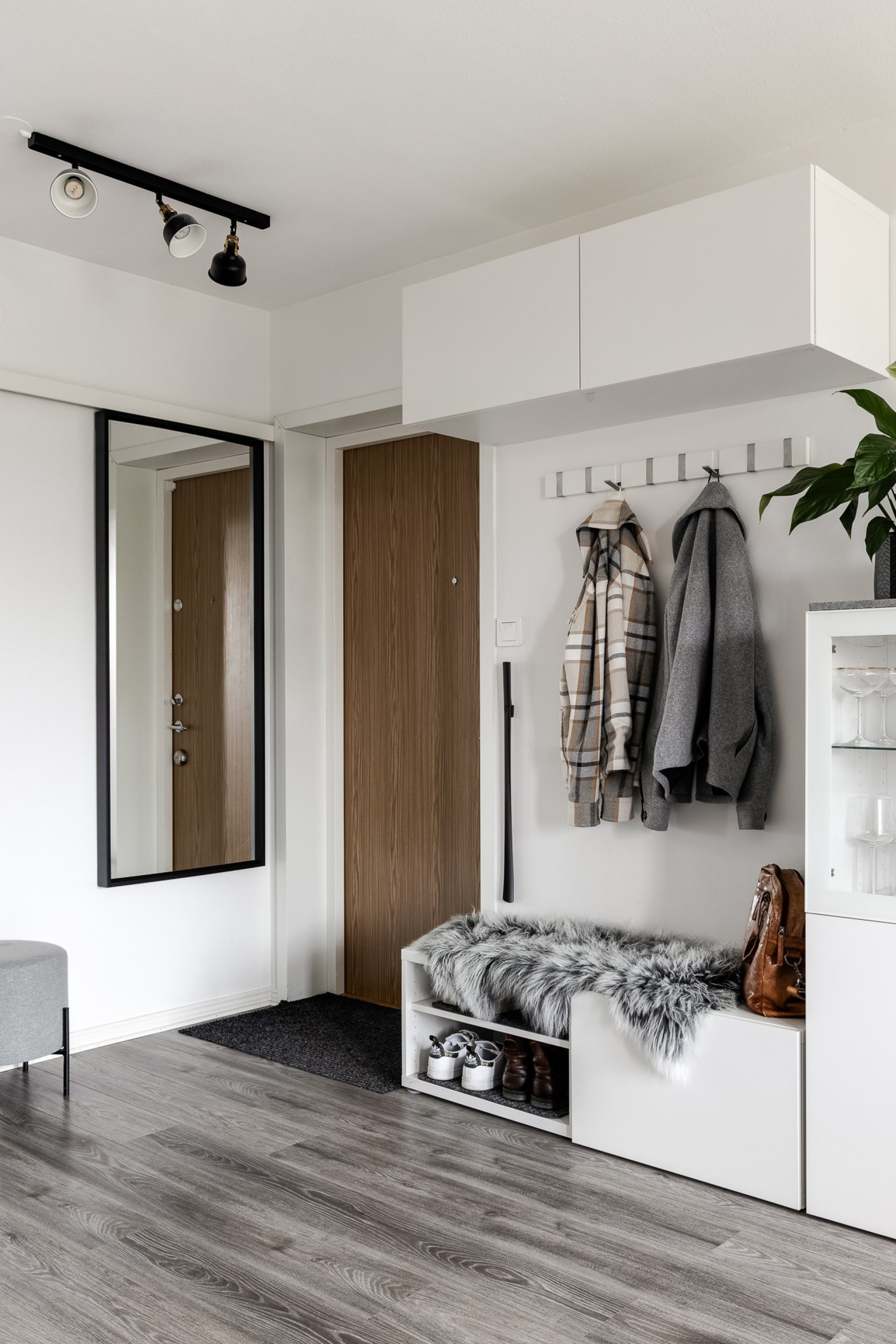 Med laminatgolv och gott om avhängningsmöjligheter, dels direkt till vänster vid entrén men även i en gömd garderob bakom den skjutbara spegeln på väggen till höger, både smart, oväntat och effektivt!