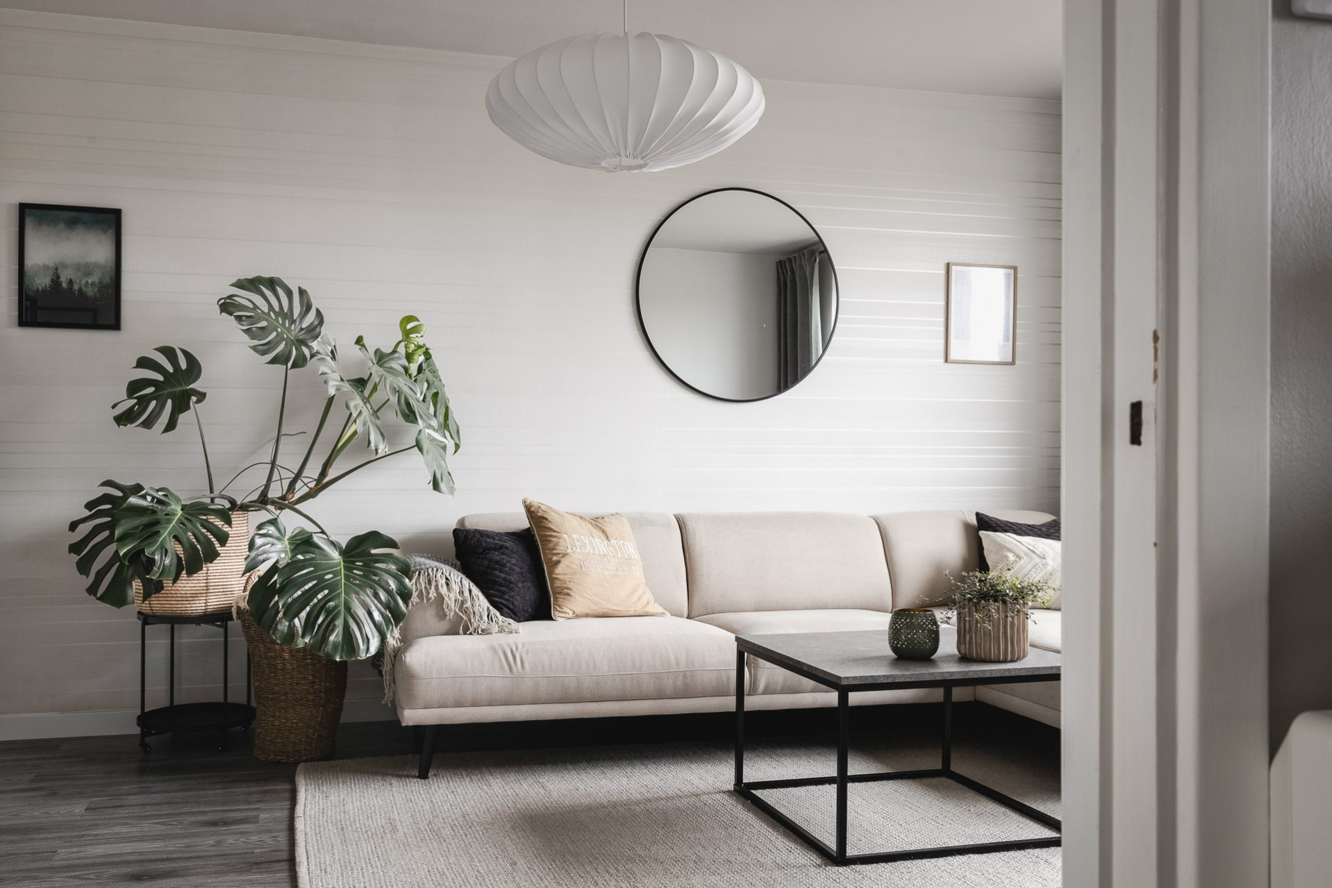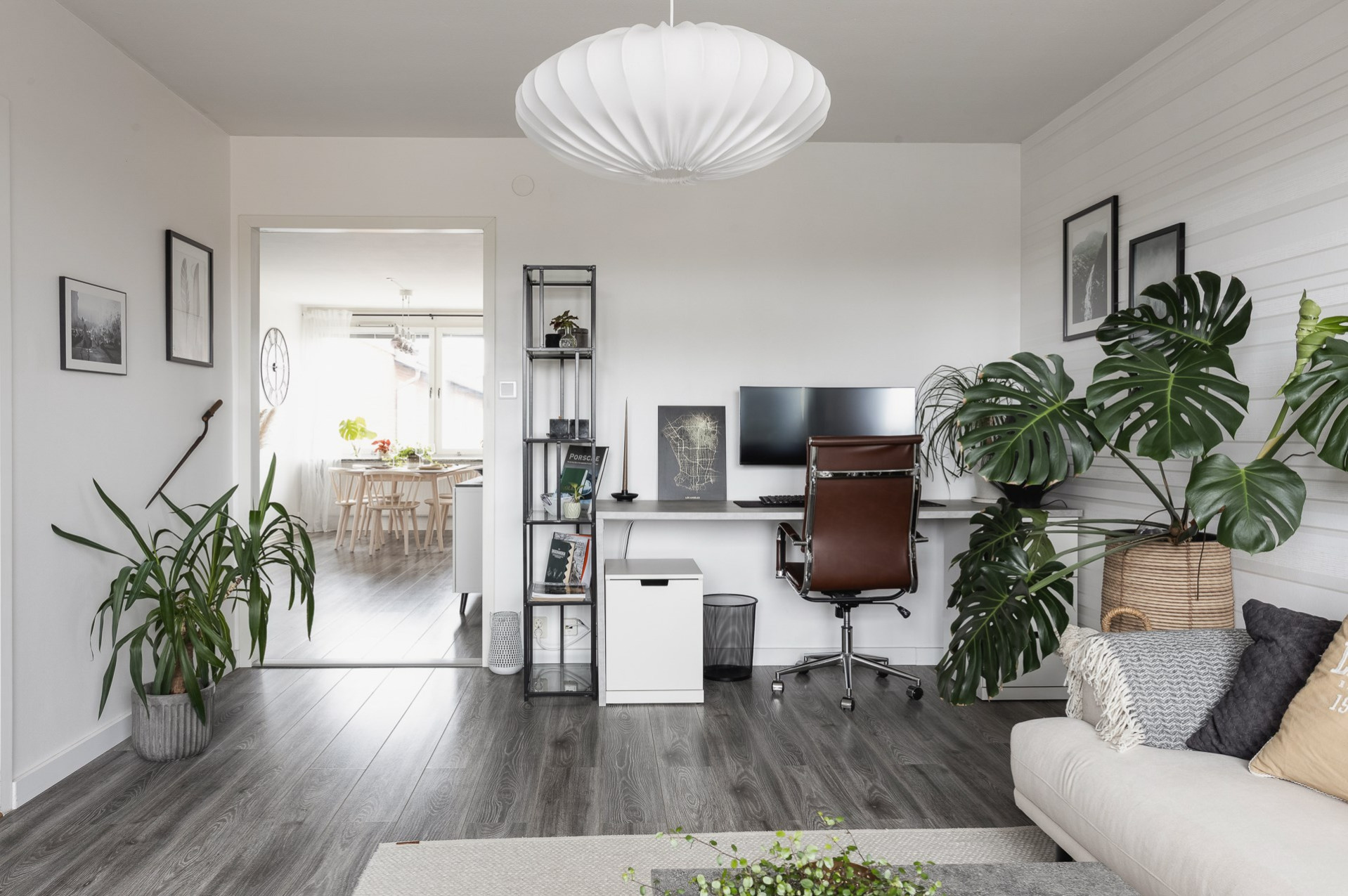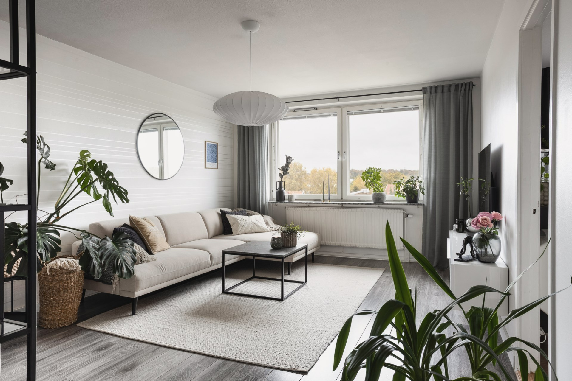 Större vardagsrum med likadant laminatgolv som i hall och matplats. Rummets storlek möjliggör plats för både soffhörna och ytterligare möblering, exempelvis i forn av en arbetsplats eller liknande.