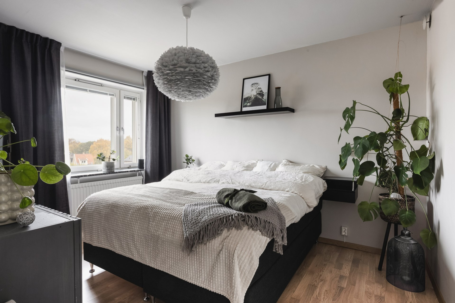 Väl tilltaget sovrum med parkettgolv och intill rummet finns en stor klädkammare med både snygg och praktisk platsbyggd förvaring.