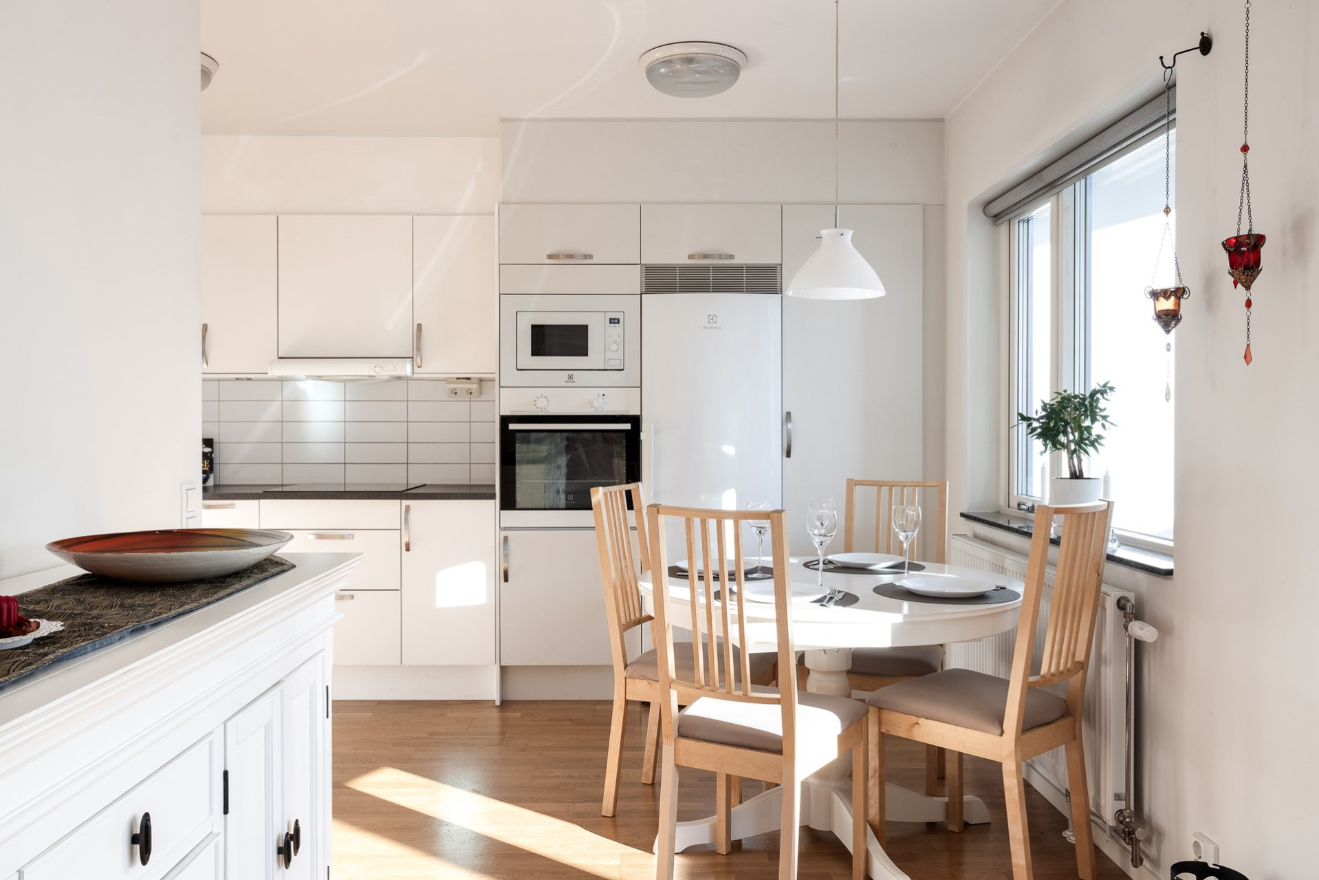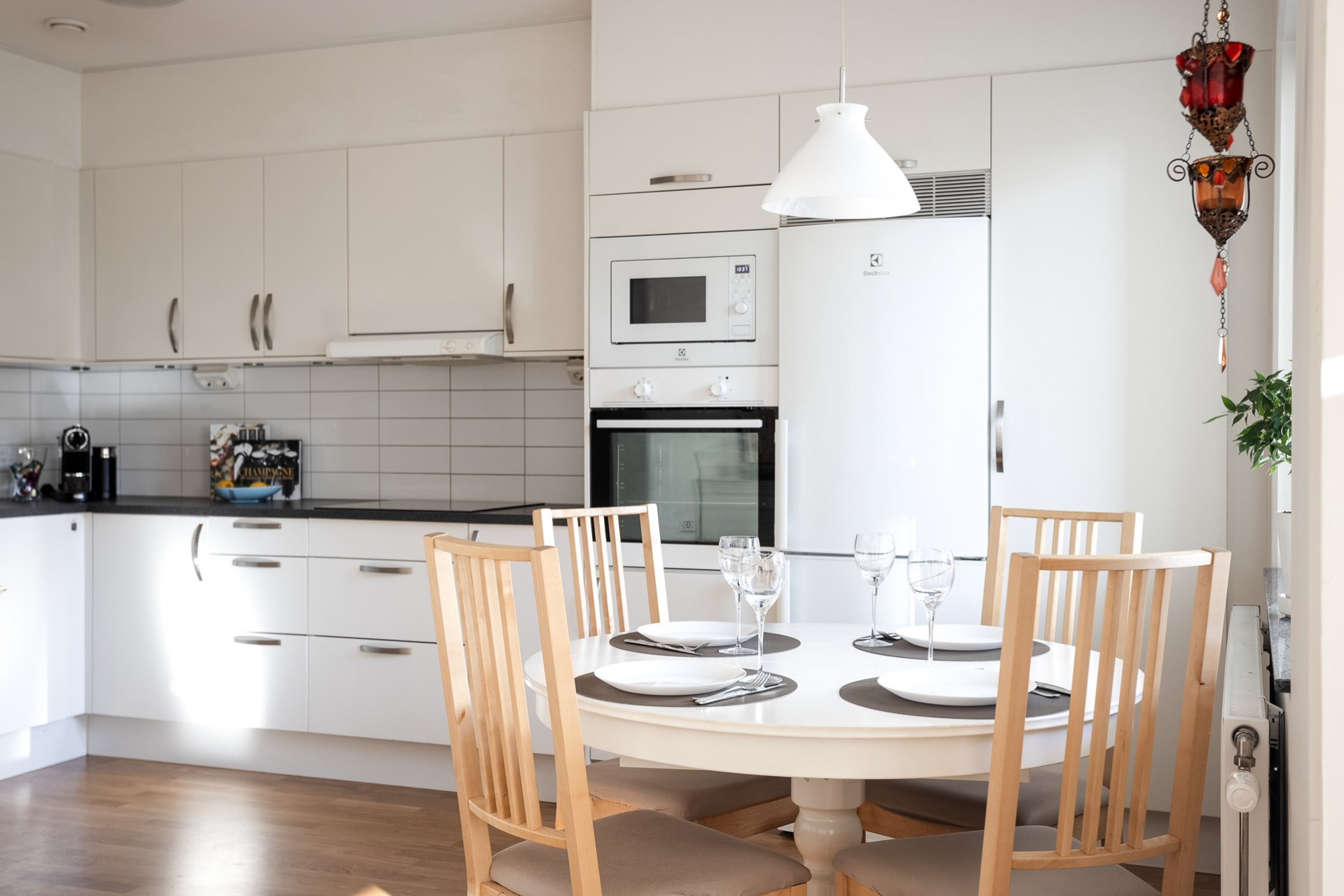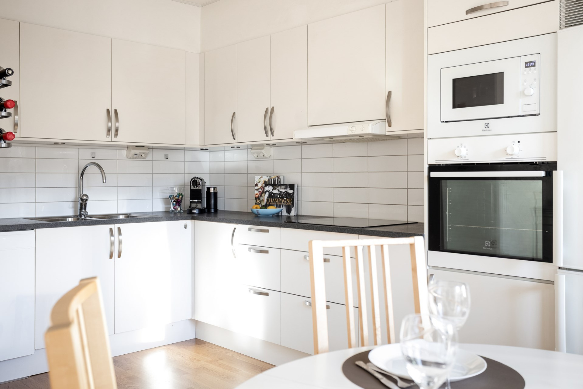 Ett stilrent kök som är utrustat med inbyggd mikrovågsugn och ugn, häll, spisfläkt, kyl & frys. Vita luckor, vitt kakel som stänkskydd och mörkgrå bänkskiva som snyggt bryter av mot det ljusa. Goda förvaringsmöjligheter i skåp och lådor. Köket erbjuder även en matplats för 4 personer.