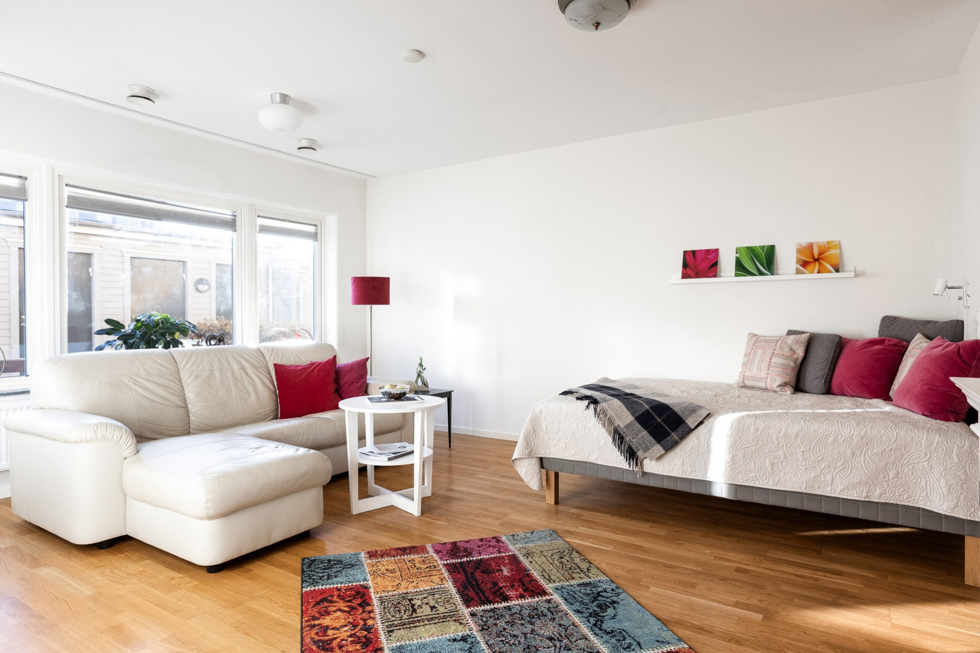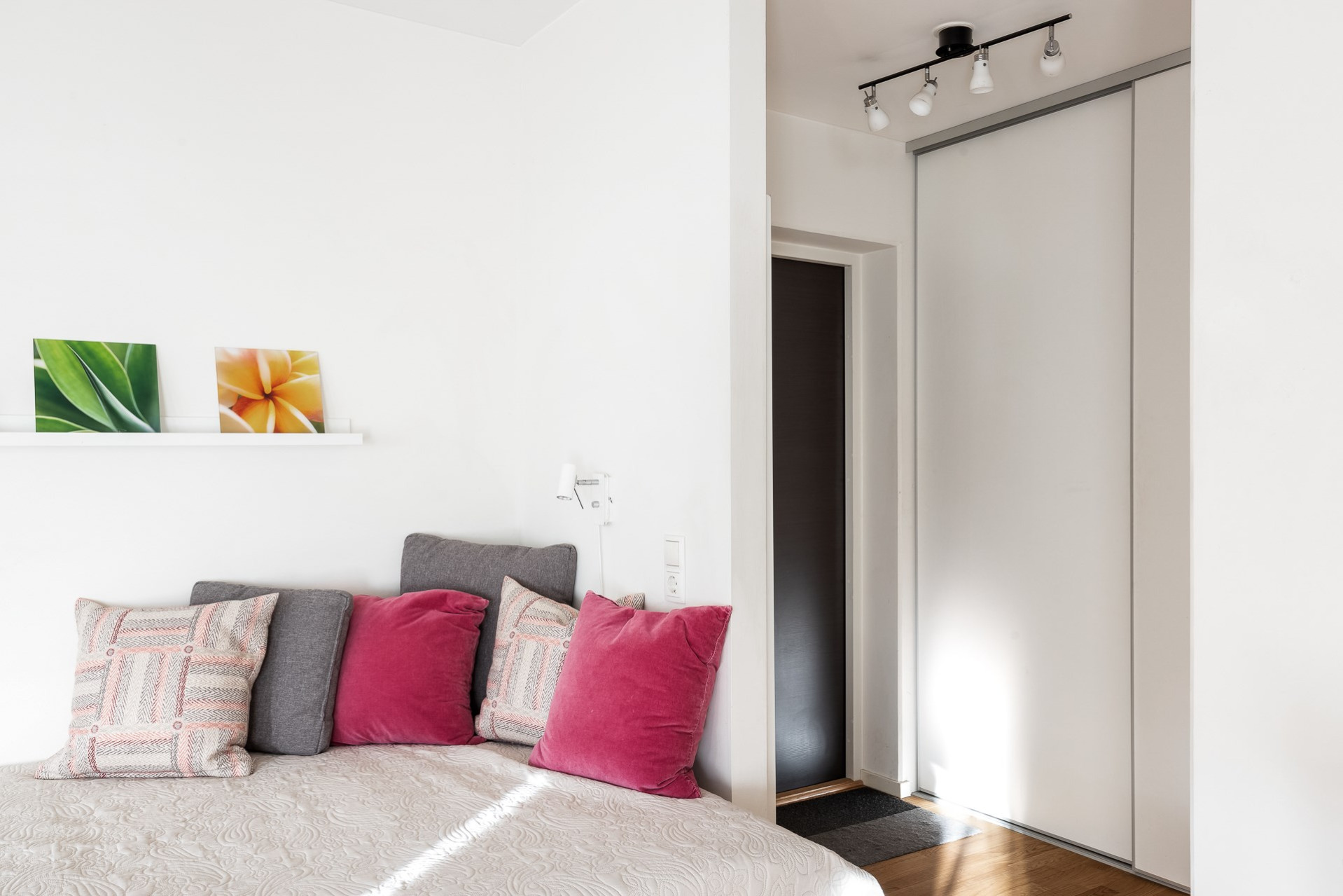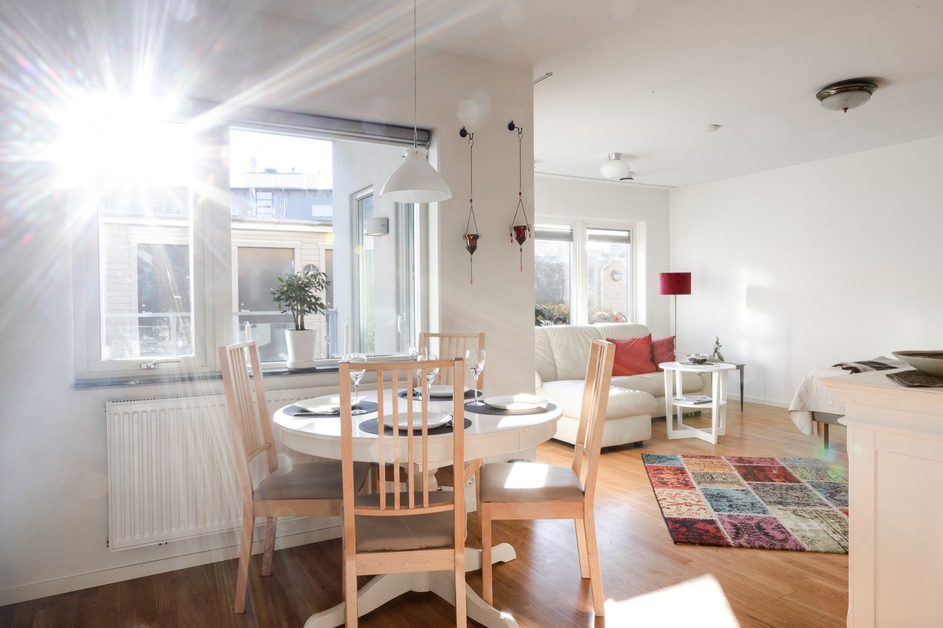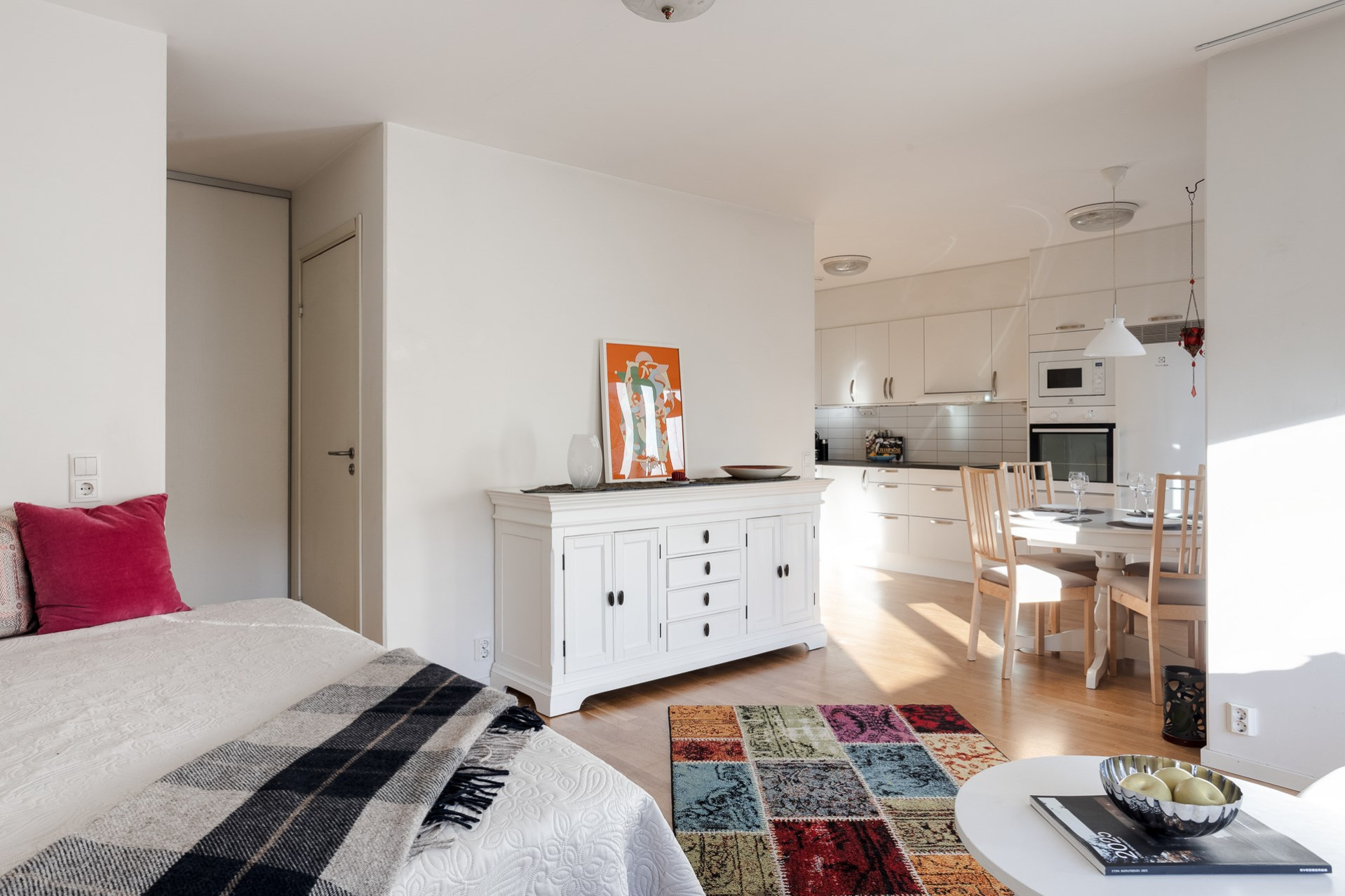 Genomgående i bostaden (förutom i badrummet) ligger ett slitstarkt ekparkett och väggarna är vita.