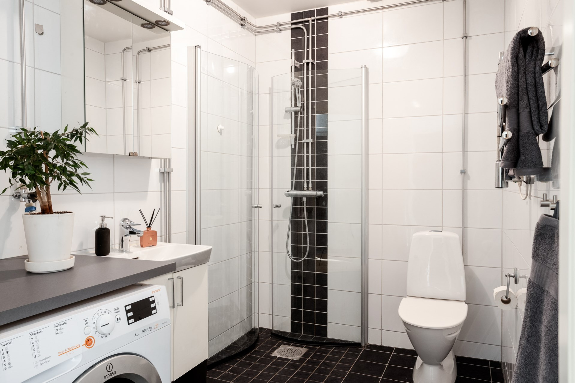 Ett modernt, helkaklat badrum i tidlösa färger som är utrustat med dusch och duschdörrar i glas, wc, handdukstork, vask med kommod undertill samt spegelskåp där du får plats med dina hygienartiklar. Här finns även en tvättmaskin för extra komfort i vardagen.