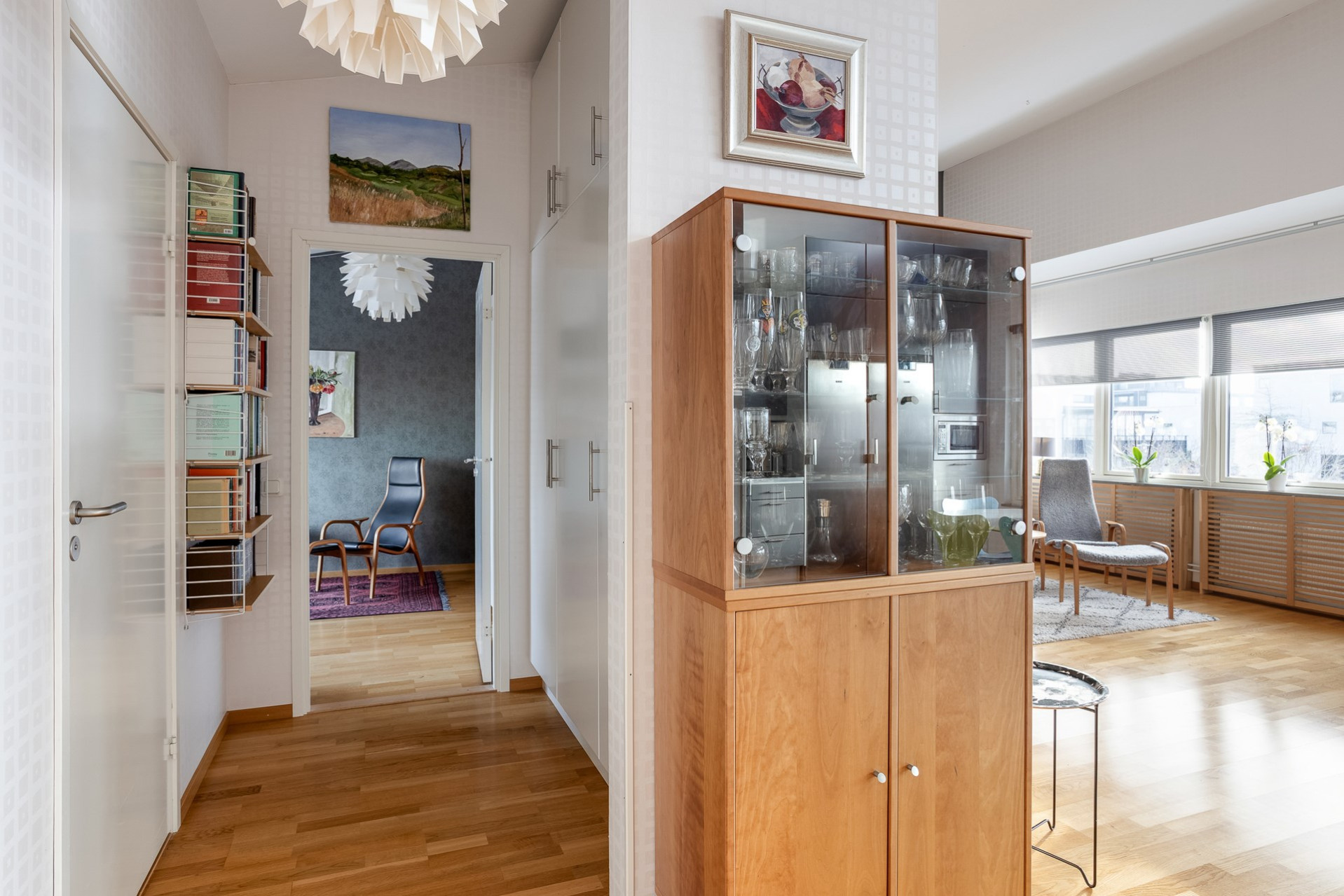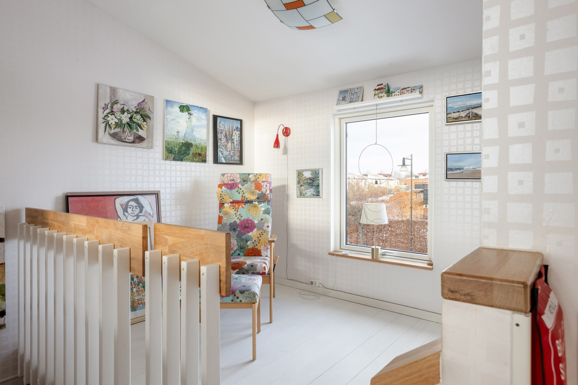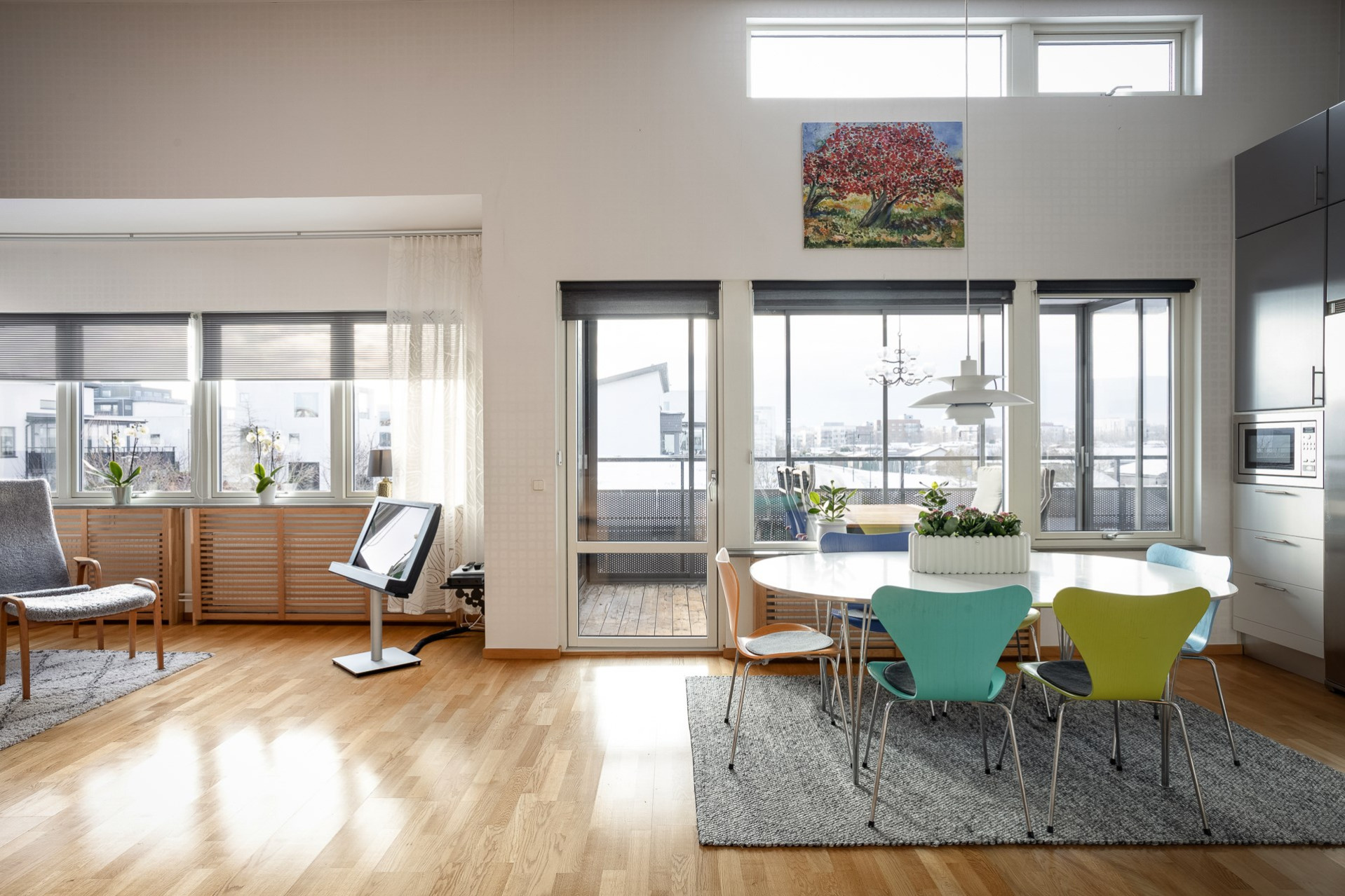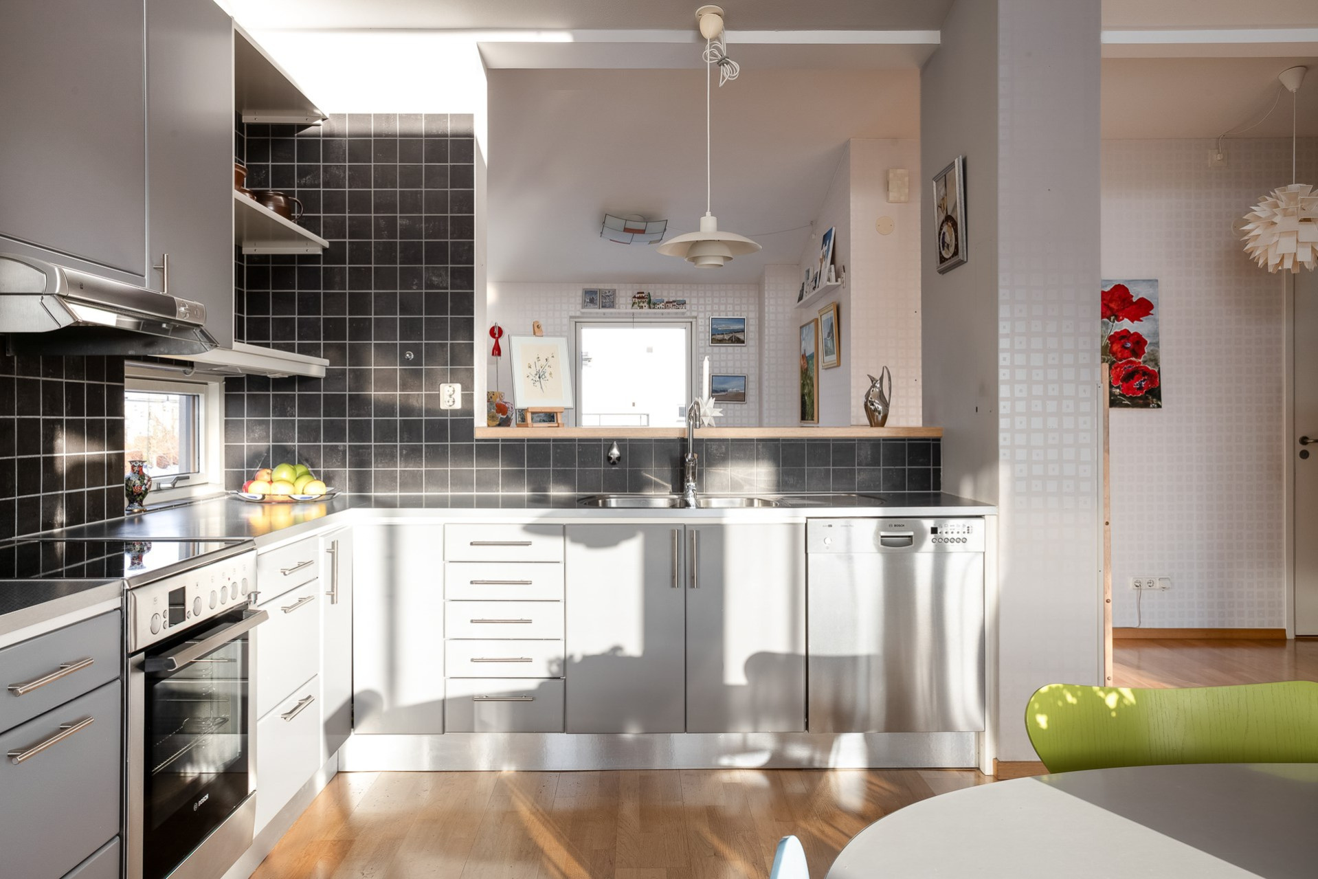 Väl uppe möts man av de öppna, ljusa ytorna, den väl tilltagna takhöjden samt det massiva ljusinsläppet som sprider sig i rummet från alla fönster. Genomgående ekparkett (ej loft), fina färger och bra tillval. Vardagsrum och kök i öppen planlösning. Stor vardagsrumsdel med plats för soffgrupp, bokhylla samt tv-möbel. Rymlig matplats för stora bjudningar och ett praktiskt kök som inspirerar till matlagning och socialisering. Gott om skåpsförvaring med följande maskinpark; kyl/frys, ugn, mikro samt diskmaskin, ugn/häll och fläkt. Från vardagsrum/matplats finns utgången till den inglasade balkongen som förlänger utelivet avsevärt. Vidare når vi den öppna solterrassen som ligger i perfekt söder- och västerläge med sol under nästan dagens alla timmar. Sovrum 1 med fönster mot söder. Högt till tak vilket möjliggör bra utrymme för loftsäng samt plats för förvaring. Sovrum 2 är något större med fönster åt norr och en mycket generös klädkammare finns. Stilrent och helkaklat badrum i grått och vitt. Dusch med kaklad duschvägg och svängbara duschväggar, tvättställ med kommod, vägghängd toalett och öppningsbart fönster. Tvättstuga med skåp för förvaring. tvättmaskin och torktumlare. Helkaklat även här samt med fönster. Ett loft över entrén har byggts av ägaren som använde ytan som måleristudio.