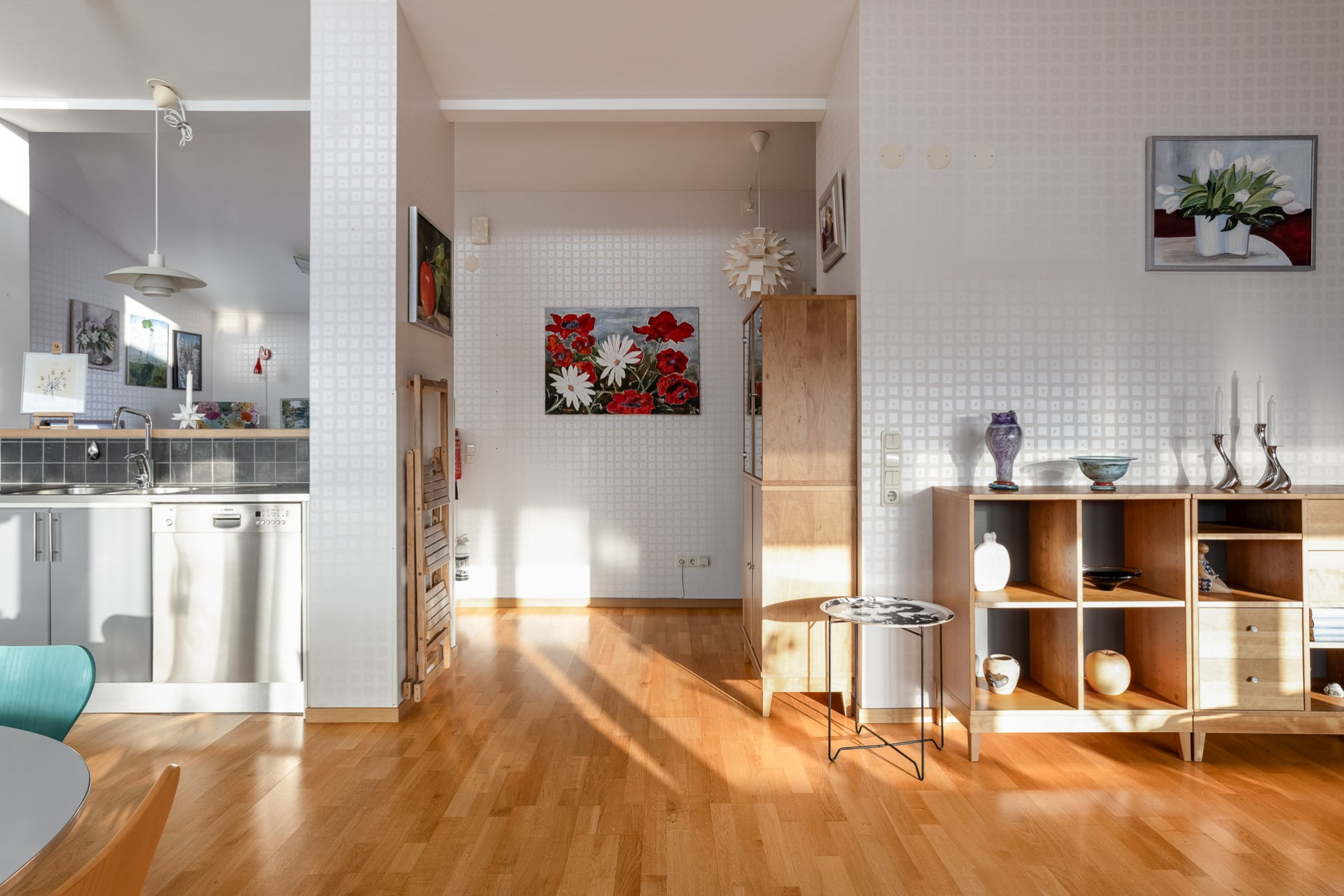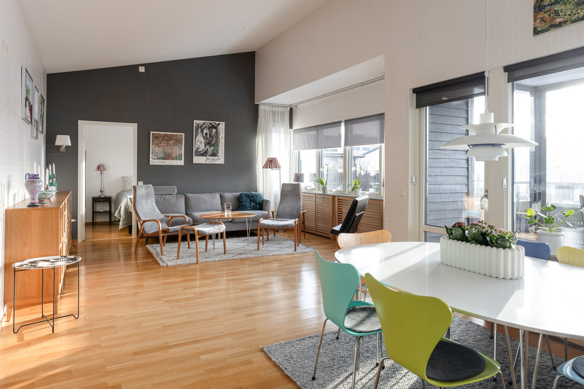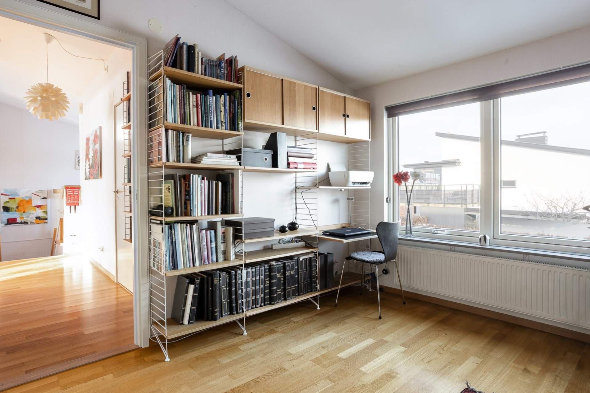 Väl uppe möts man av de öppna, ljusa ytorna, den väl tilltagna takhöjden samt det massiva ljusinsläppet som sprider sig i rummet från alla fönster. Genomgående ekparkett (ej loft), fina färger och bra tillval. Vardagsrum och kök i öppen planlösning. Stor vardagsrumsdel med plats för soffgrupp, bokhylla samt tv-möbel. Rymlig matplats för stora bjudningar och ett praktiskt kök som inspirerar till matlagning och socialisering. Gott om skåpsförvaring med följande maskinpark; kyl/frys, ugn, mikro samt diskmaskin, ugn/häll och fläkt. Från vardagsrum/matplats finns utgången till den inglasade balkongen som förlänger utelivet avsevärt. Vidare når vi den öppna solterrassen som ligger i perfekt söder- och västerläge med sol under nästan dagens alla timmar. Sovrum 1 med fönster mot söder. Högt till tak vilket möjliggör bra utrymme för loftsäng samt plats för förvaring. Sovrum 2 är något större med fönster åt norr och en mycket generös klädkammare finns. Stilrent och helkaklat badrum i grått och vitt. Dusch med kaklad duschvägg och svängbara duschväggar, tvättställ med kommod, vägghängd toalett och öppningsbart fönster. Tvättstuga med skåp för förvaring. tvättmaskin och torktumlare. Helkaklat även här samt med fönster. Ett loft över entrén har byggts av ägaren som använde ytan som måleristudio.