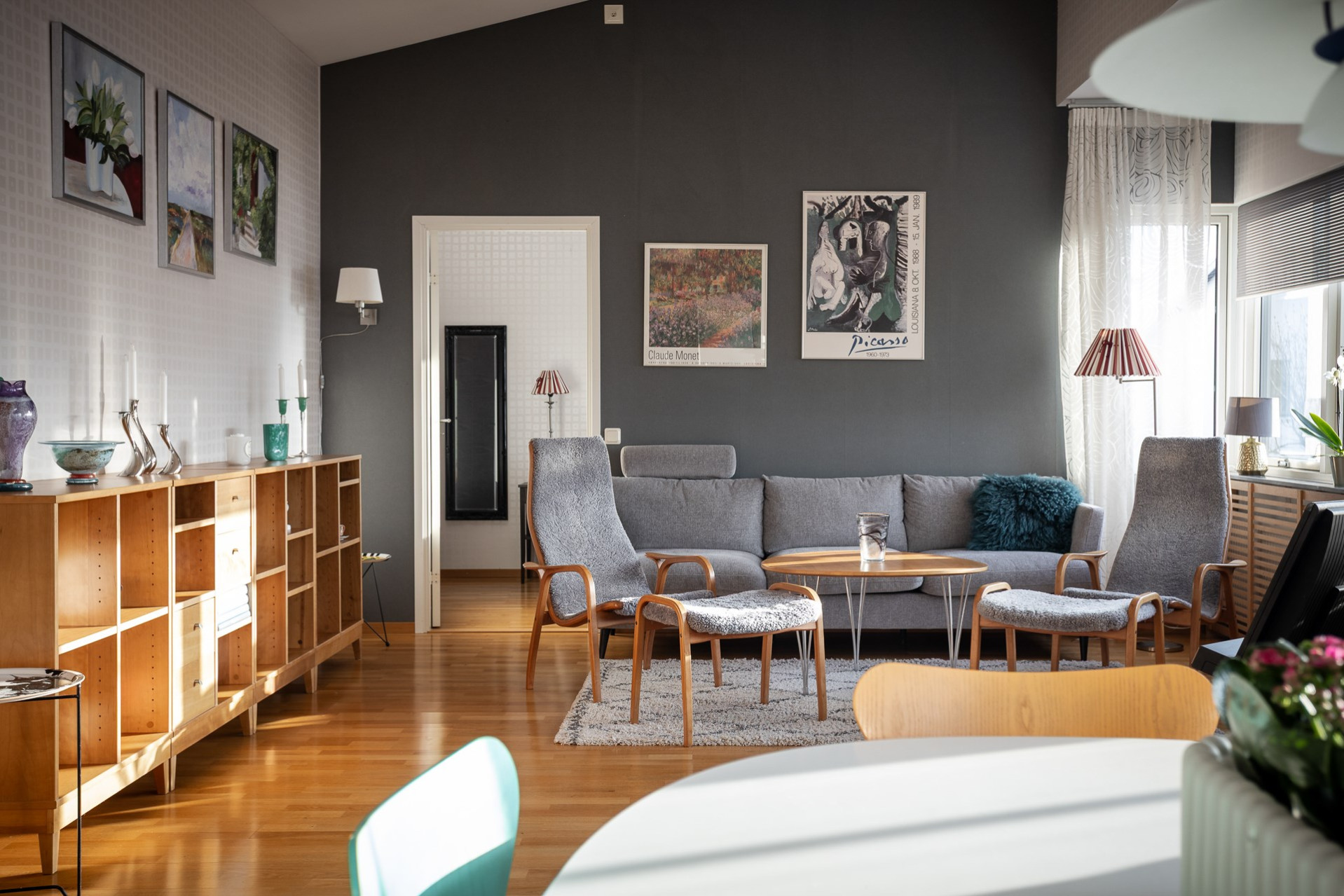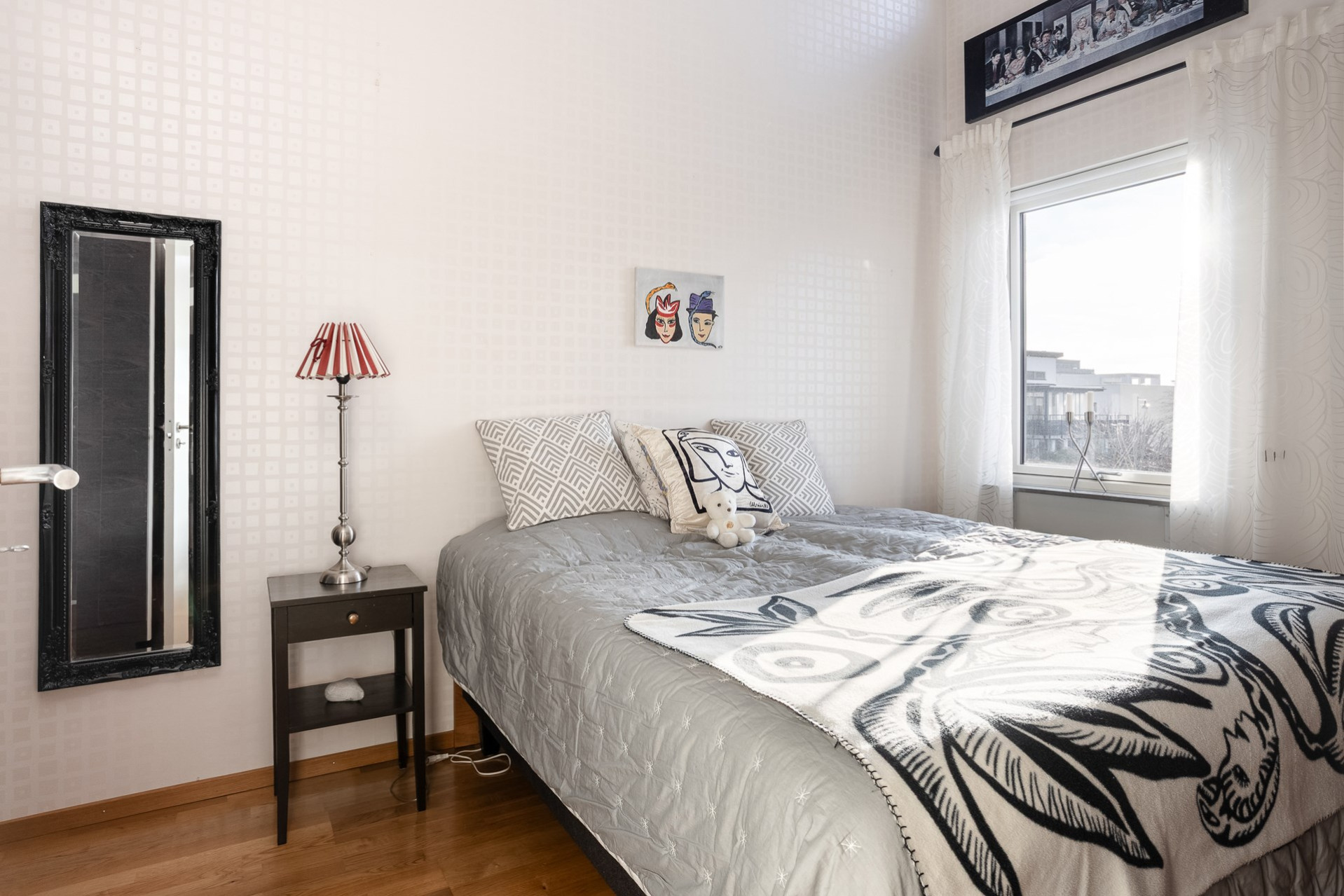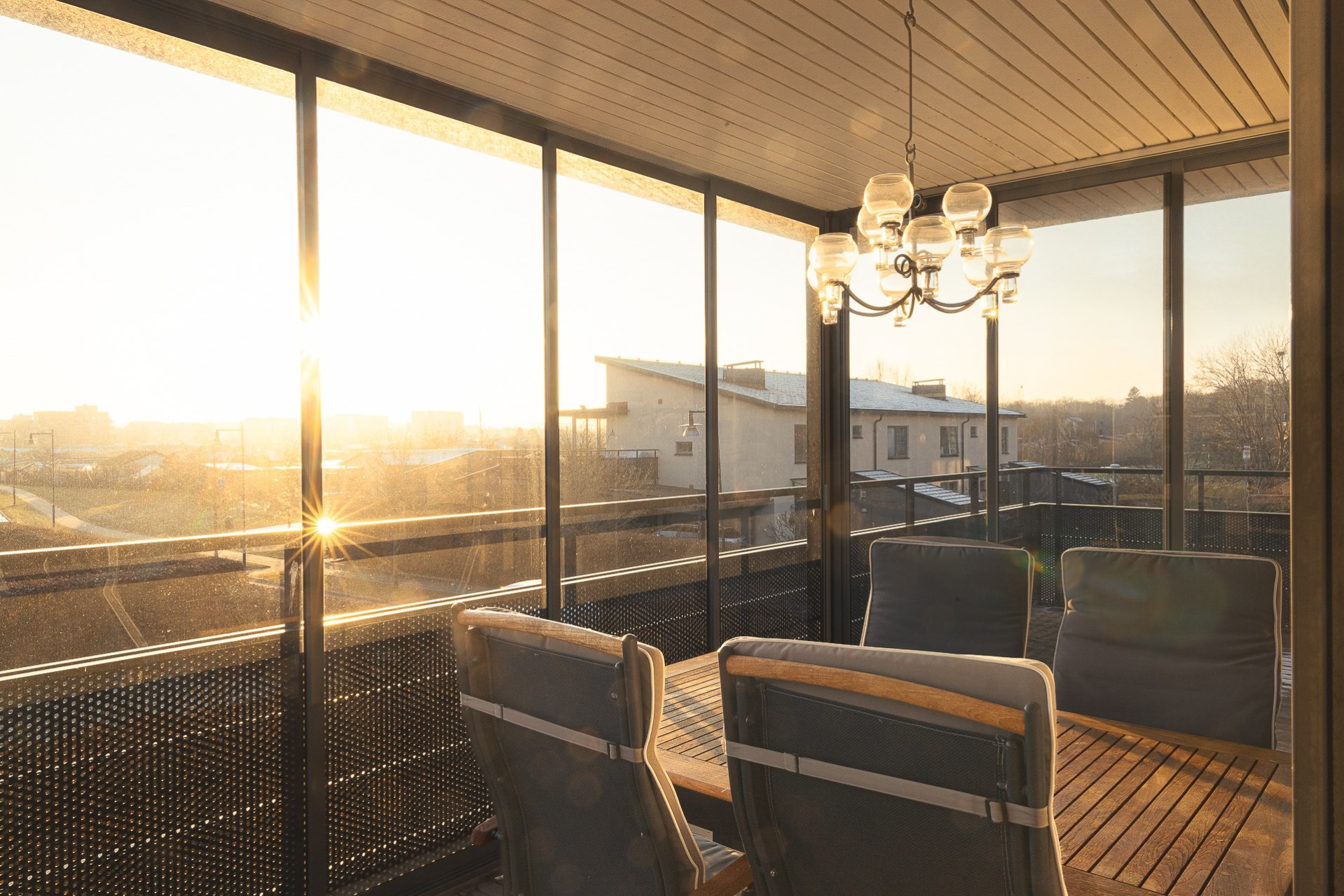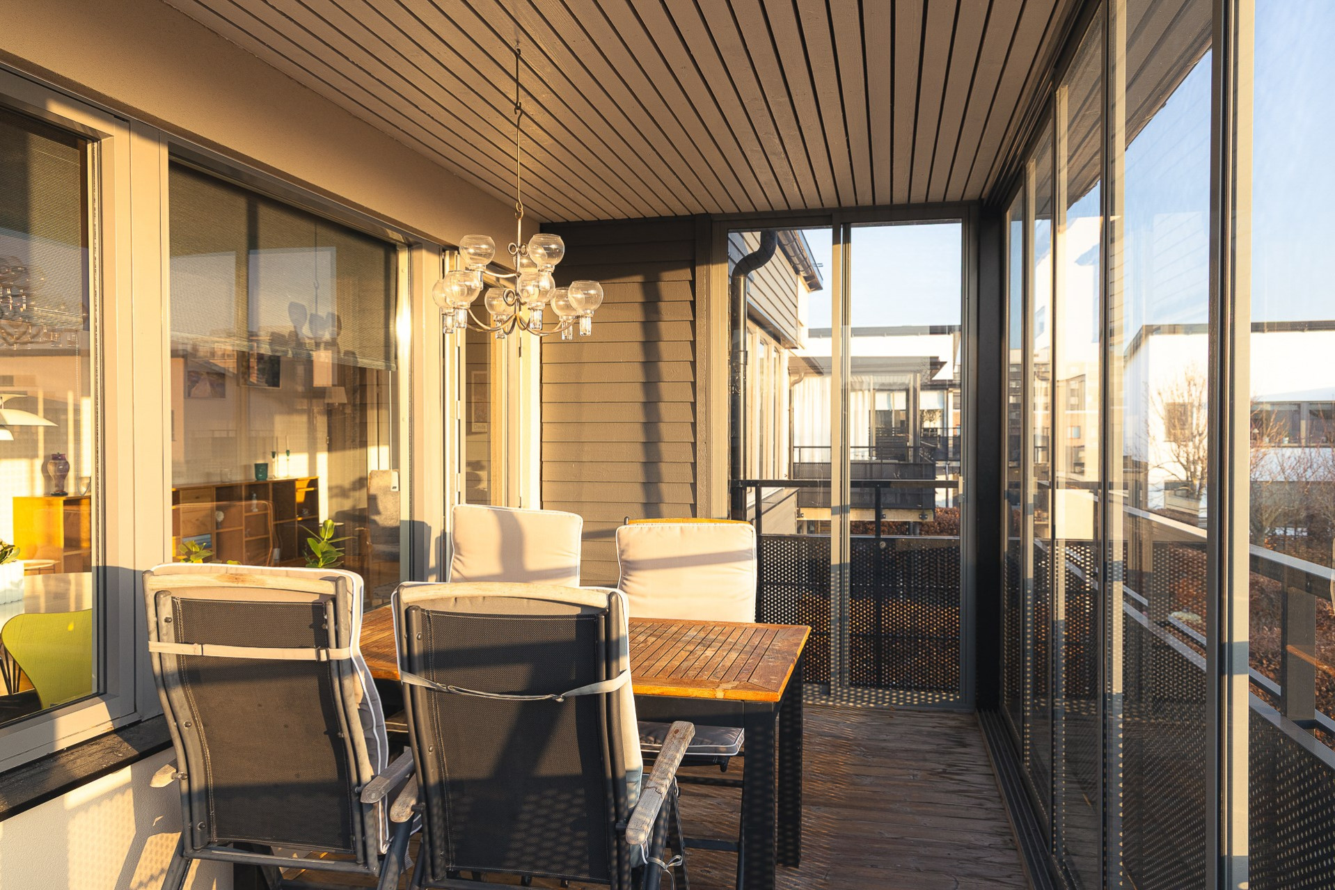 Väl uppe möts man av de öppna, ljusa ytorna, den väl tilltagna takhöjden samt det massiva ljusinsläppet som sprider sig i rummet från alla fönster. Genomgående ekparkett (ej loft), fina färger och bra tillval. Vardagsrum och kök i öppen planlösning. Stor vardagsrumsdel med plats för soffgrupp, bokhylla samt tv-möbel. Rymlig matplats för stora bjudningar och ett praktiskt kök som inspirerar till matlagning och socialisering. Gott om skåpsförvaring med följande maskinpark; kyl/frys, ugn, mikro samt diskmaskin, ugn/häll och fläkt. Från vardagsrum/matplats finns utgången till den inglasade balkongen som förlänger utelivet avsevärt. Vidare når vi den öppna solterrassen som ligger i perfekt söder- och västerläge med sol under nästan dagens alla timmar. Sovrum 1 med fönster mot söder. Högt till tak vilket möjliggör bra utrymme för loftsäng samt plats för förvaring. Sovrum 2 är något större med fönster åt norr och en mycket generös klädkammare finns. Stilrent och helkaklat badrum i grått och vitt. Dusch med kaklad duschvägg och svängbara duschväggar, tvättställ med kommod, vägghängd toalett och öppningsbart fönster. Tvättstuga med skåp för förvaring. tvättmaskin och torktumlare. Helkaklat även här samt med fönster. Ett loft över entrén har byggts av ägaren som använde ytan som måleristudio.