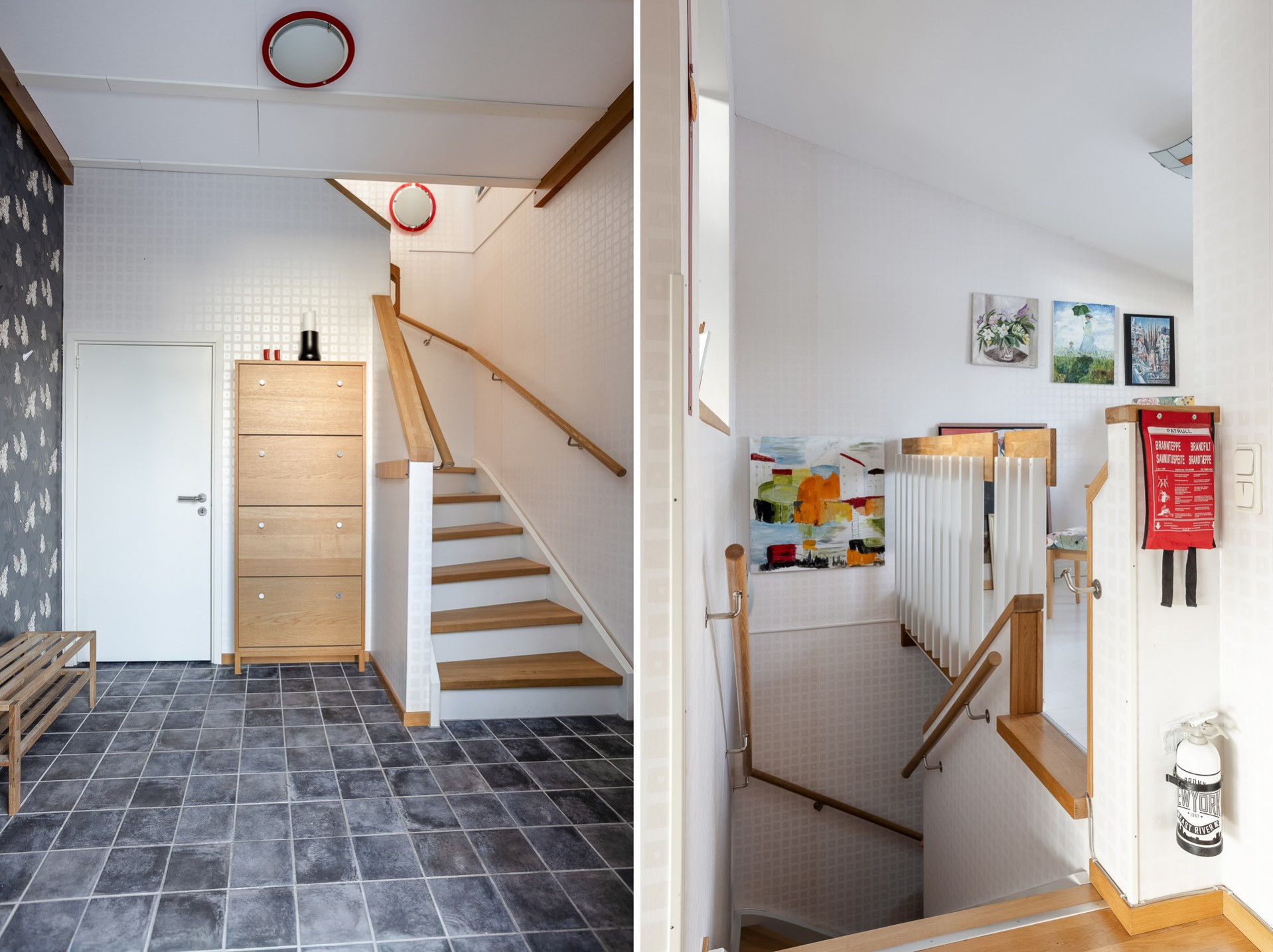 Välkomnande entré med plats för avhängning och praktiskt förvaringsutrymme via förråd under trappan. Klinkergolv.