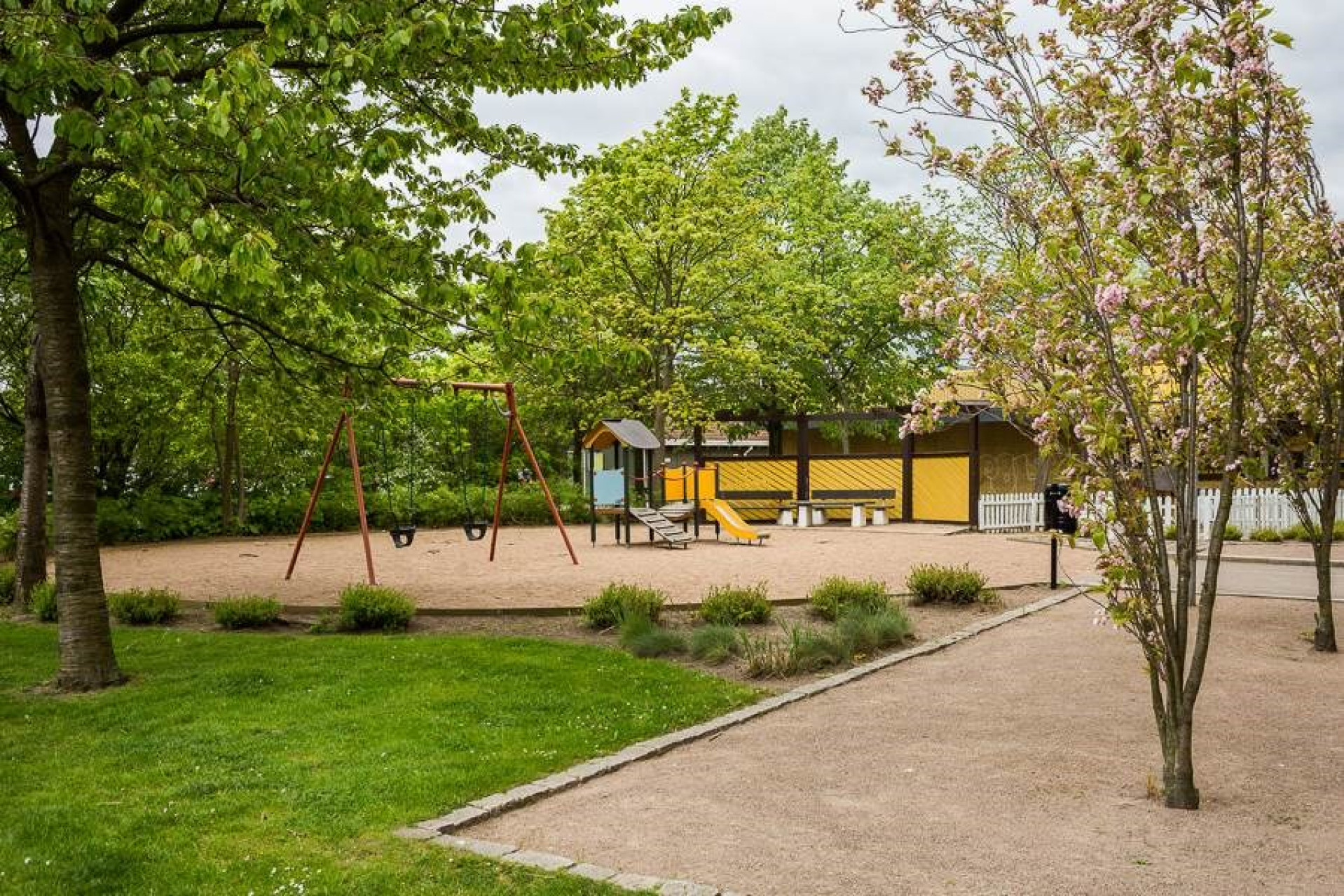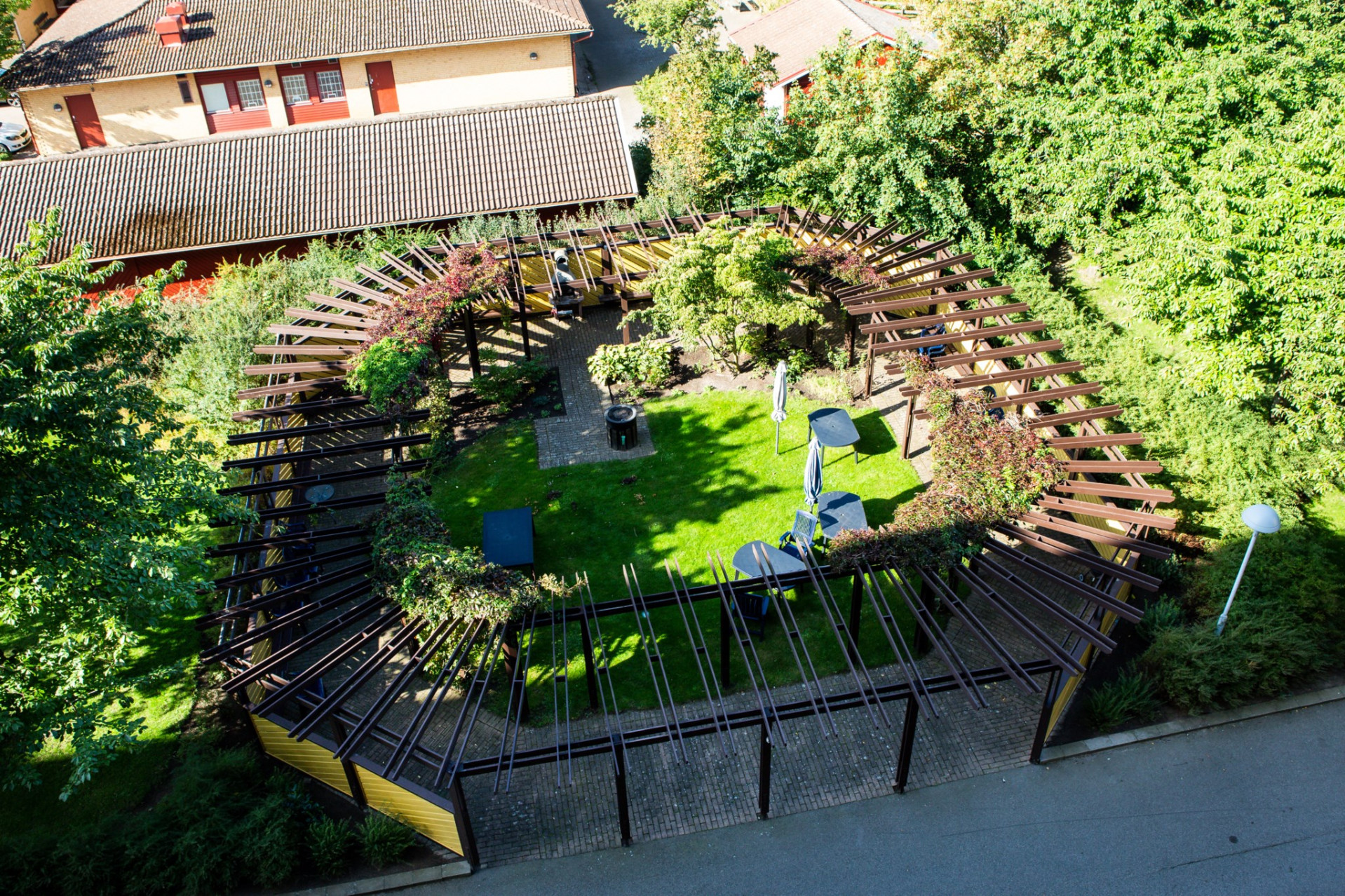 Runt husen finns en mångfald av växter och blomsterrabatter, välskötta gräsytor med flera gemensamma samlingsplats där boende kan träffas för att umgås, grilla och ha egen fester.