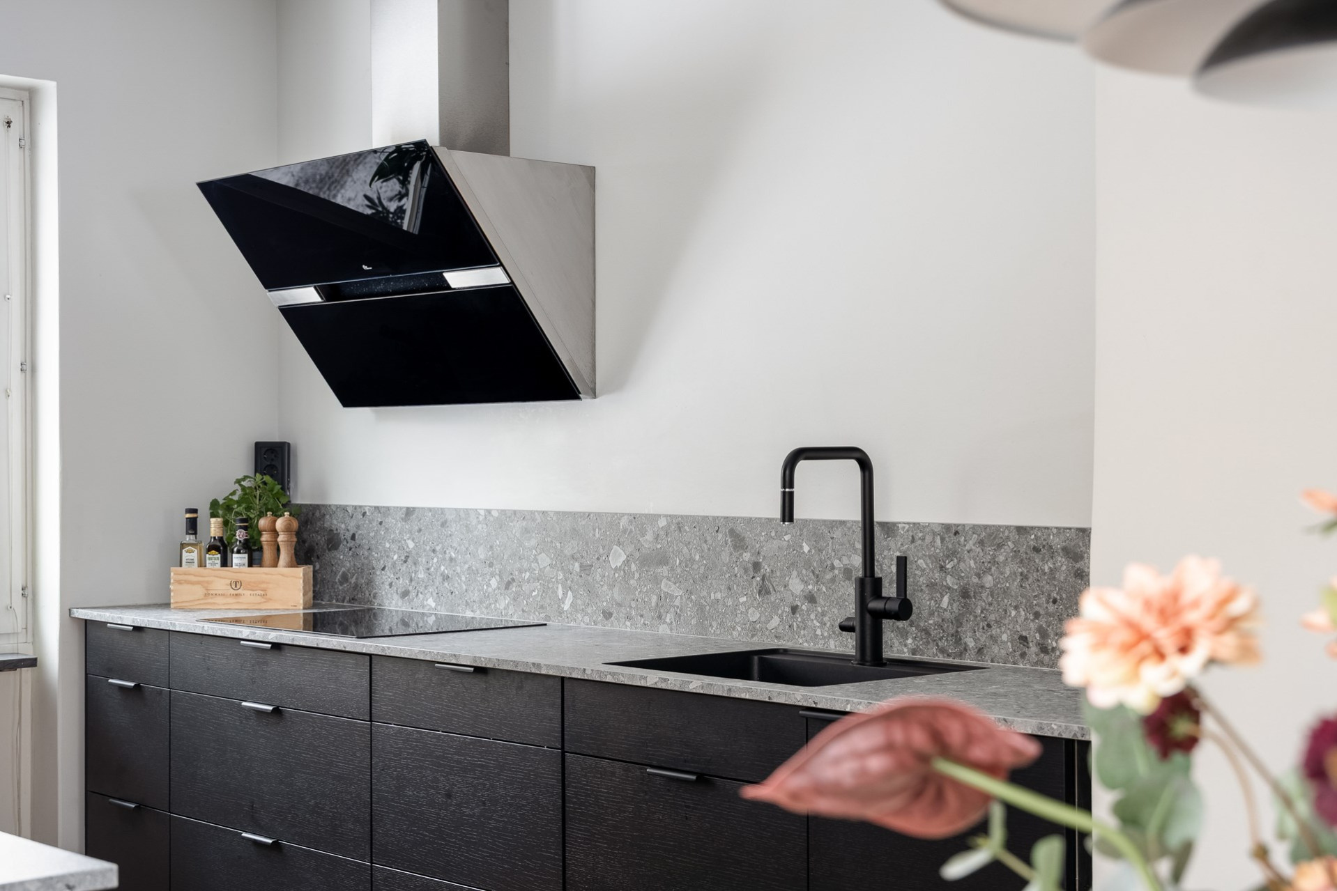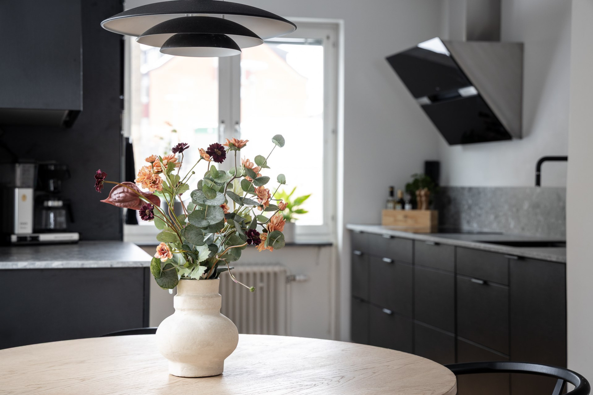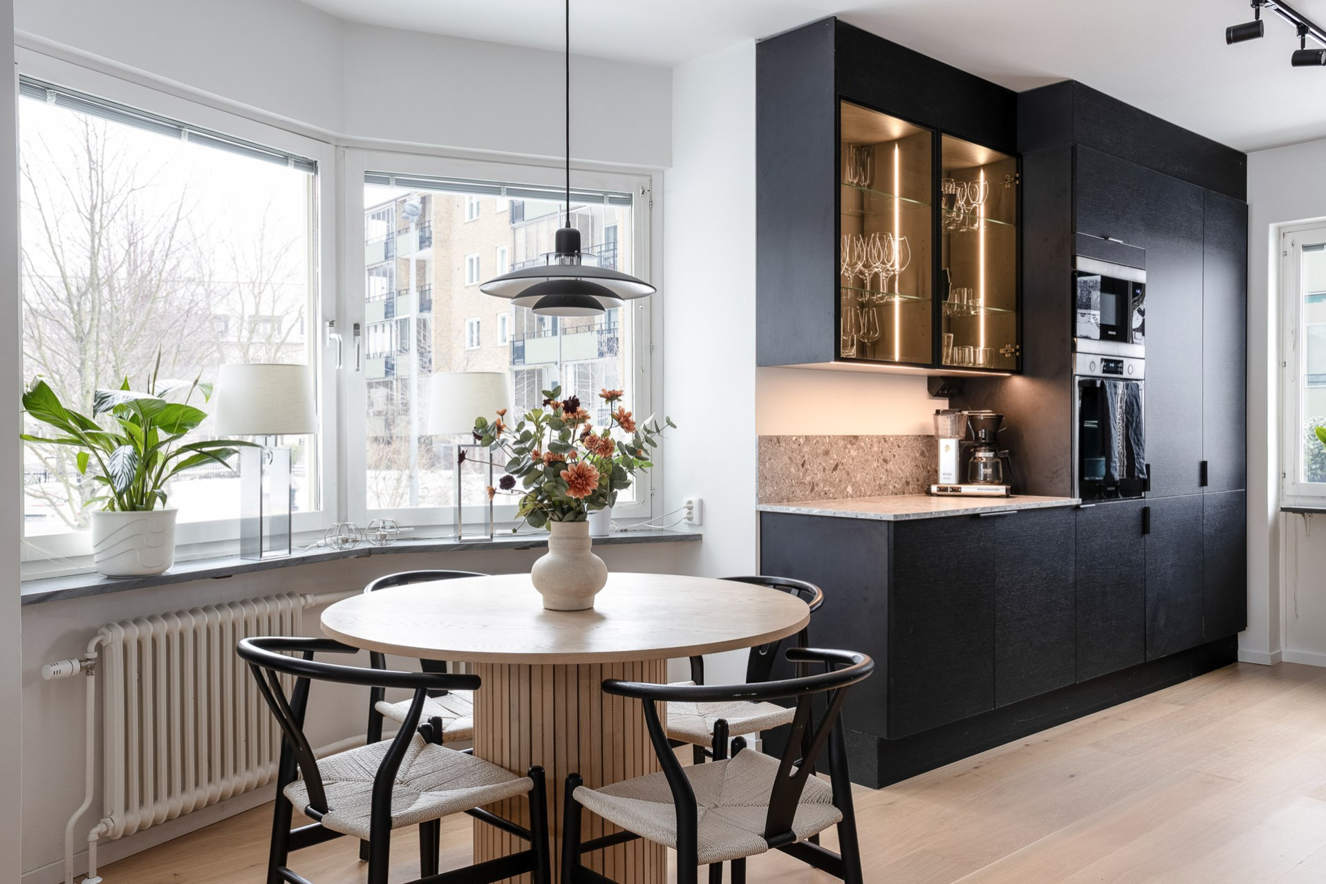 Ett påkostat, modernt kök från JKE design (-22) som är utrustat med diskmaskin (Cylinda), inbyggd ugn och mikrovågsugn (Samsung), kombinerad och integrerad kyl & frys (Samsung), spisfläkt (Thermex) och induktionshäll (Whirlpool). Svarta luckor (ett skåp med glasluckor och belysning) och en gråmelerad bänkskiva/stänkskydd som blir en snygg detalj i köket. Trevlig och ljus matplats för 4-6 personer vid ett burspråk.