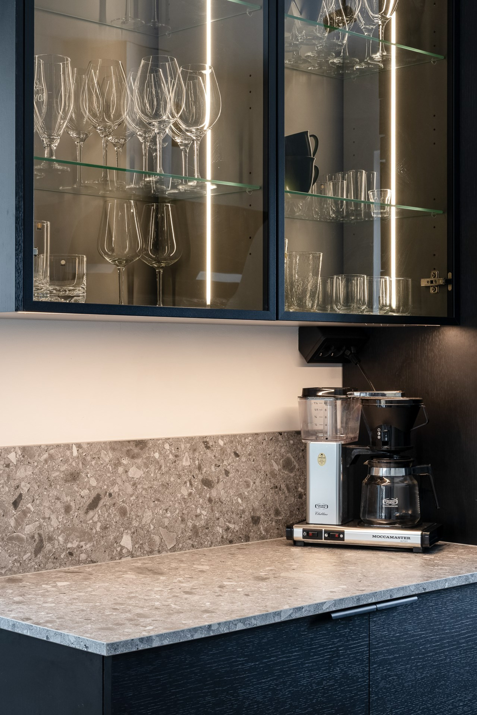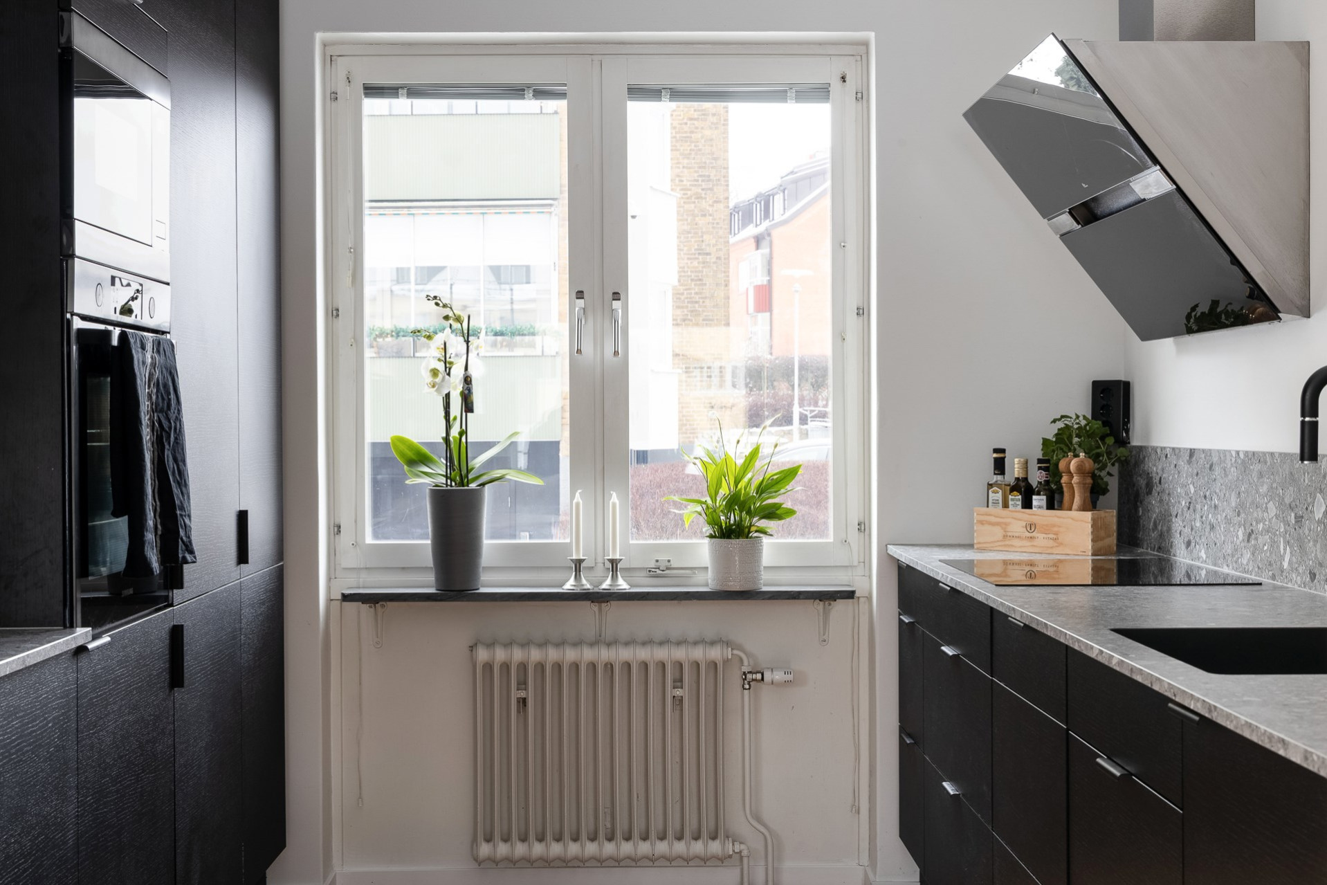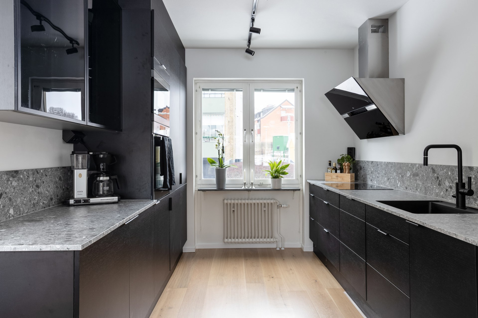 Ett påkostat, modernt kök från JKE design (-22) som är utrustat med diskmaskin (Cylinda), inbyggd ugn och mikrovågsugn (Samsung), kombinerad och integrerad kyl & frys (Samsung), spisfläkt (Thermex) och induktionshäll (Whirlpool). Svarta luckor (ett skåp med glasluckor och belysning) och en gråmelerad bänkskiva/stänkskydd som blir en snygg detalj i köket. Trevlig och ljus matplats för 4-6 personer vid ett burspråk.