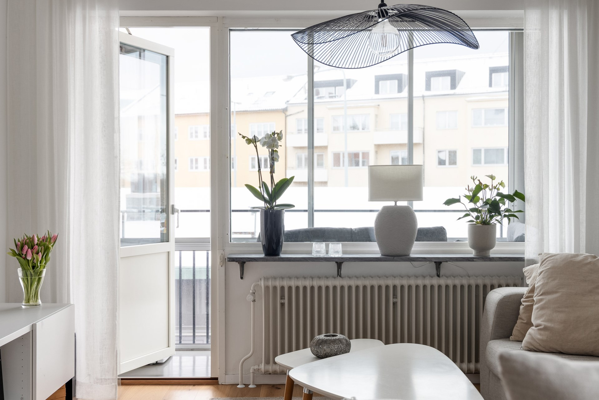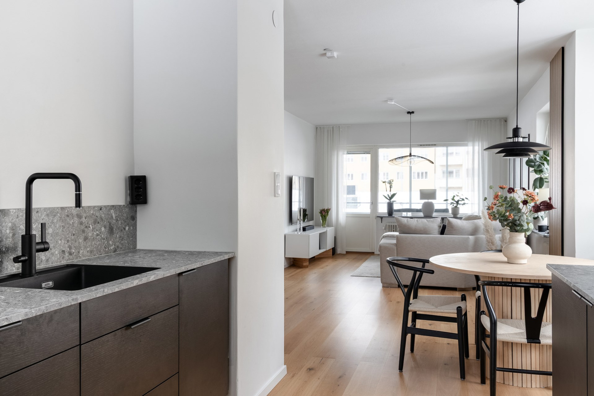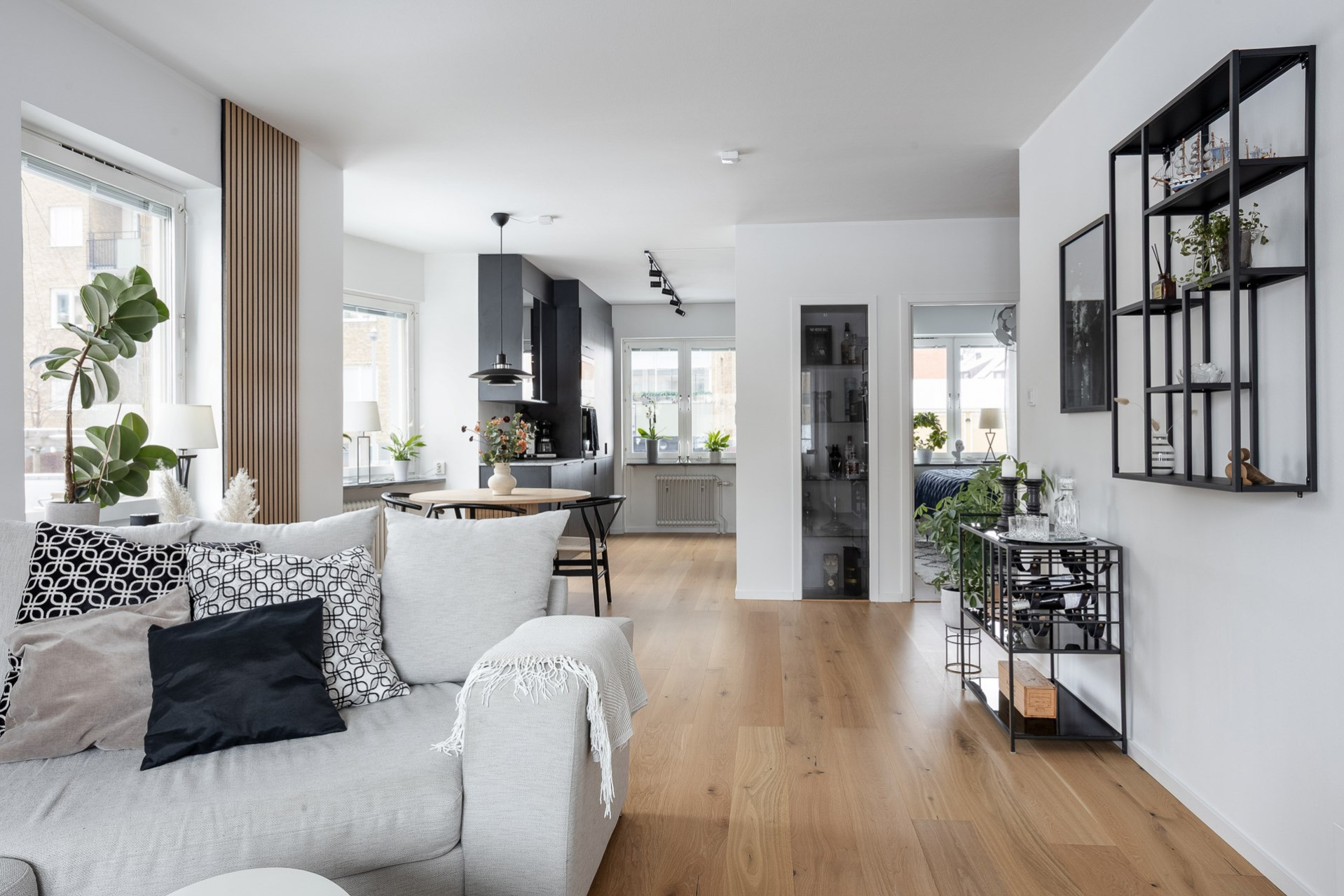 Genomgående i bostaden (förutom i badrummet) vilar att snyggt enstavsparkett på golvet och väggarna är släta och vitmålade (varvat med modern akustikpanel)