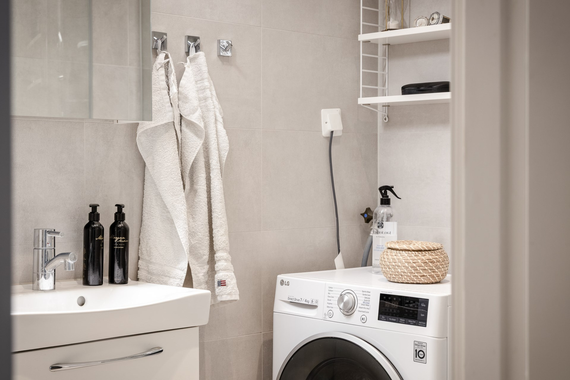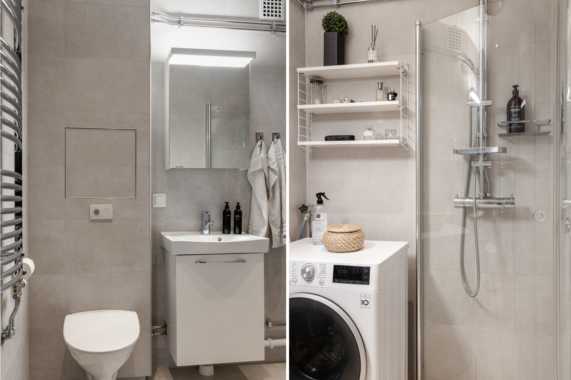 Ett tidlöst och helkaklat badrum (-20) som går i en varm beige ton. Badrummet är utrustat med dusch och duschdörrar i glas, vask med kommod undertill samt spegelskåp, vägghängd wc, uppvärmd handdukstork samt ett kombinerad tvättmaskin med torktumlare (LG) för extra komfort.