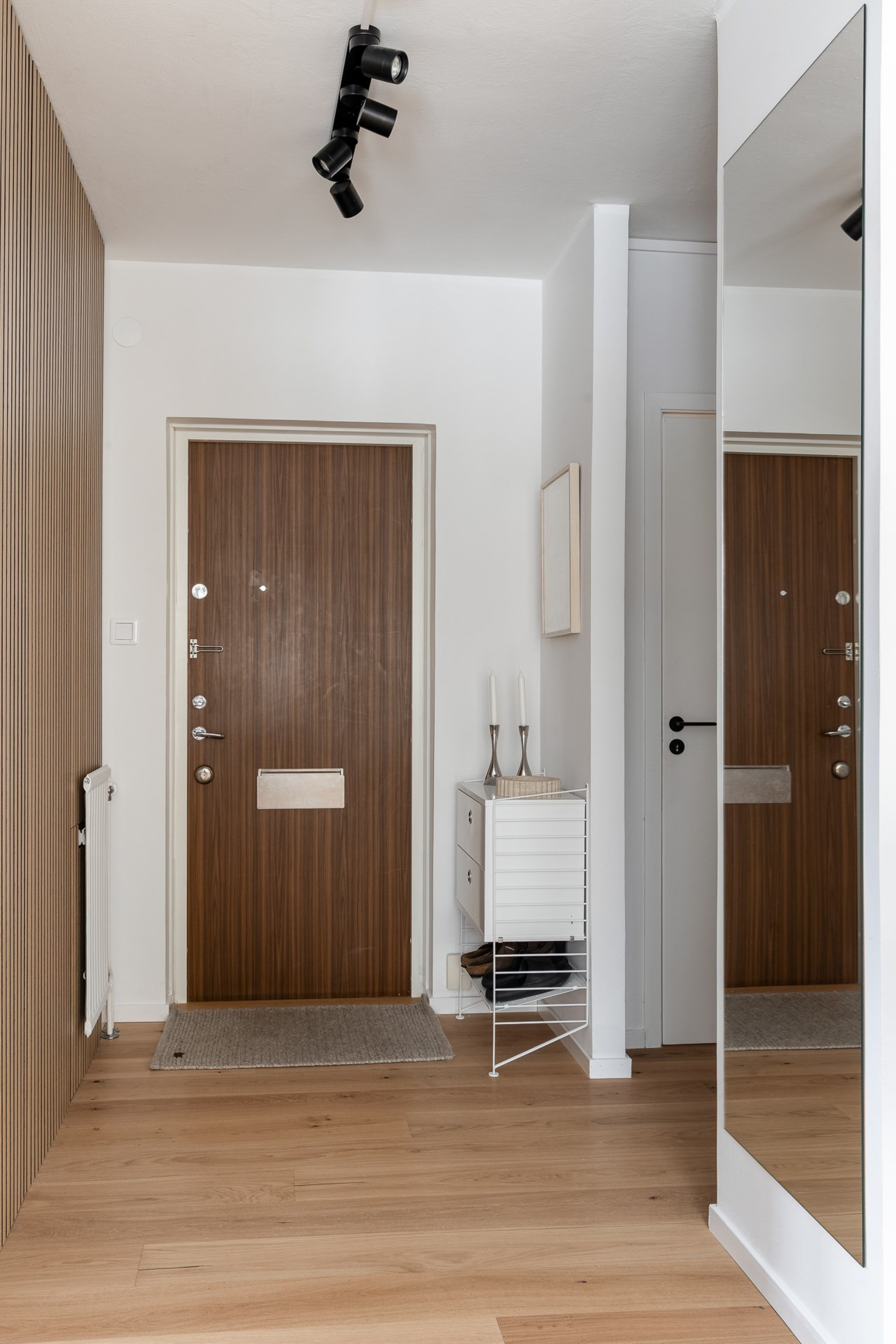 Välkomnande hall med plats för avhängning. Från hallen nås badrummet och en walk-in closet där du får plats med skor och jackor. Från hallen tar du dig även vidare till resterande rum i bostaden.