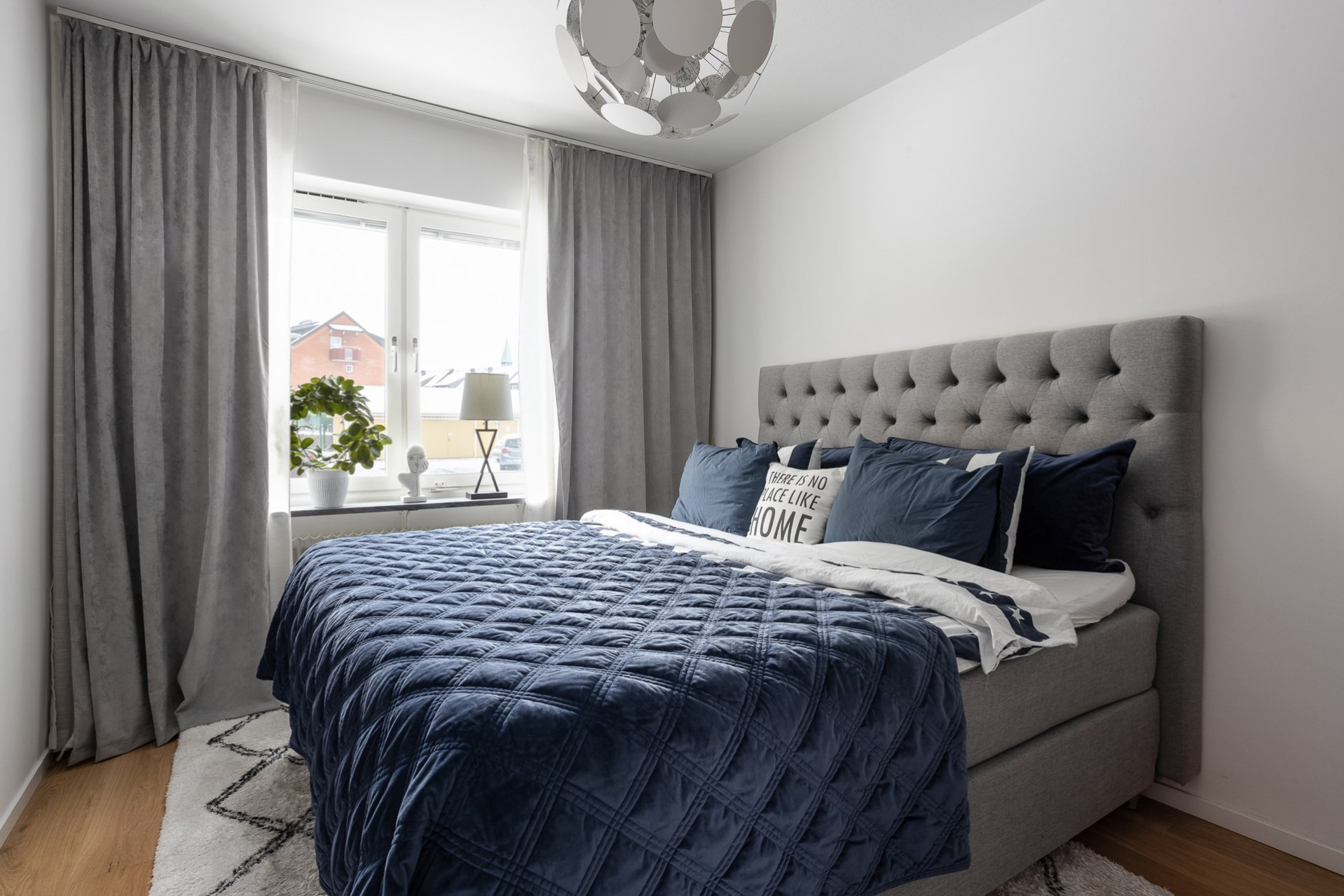 Rymligt sovrum som vetter mot den lugna innergården. Här får du plats med en dubbelsäng och annat önskat möblemang. Garderob på ena sidan som erbjuder plats för kläder.