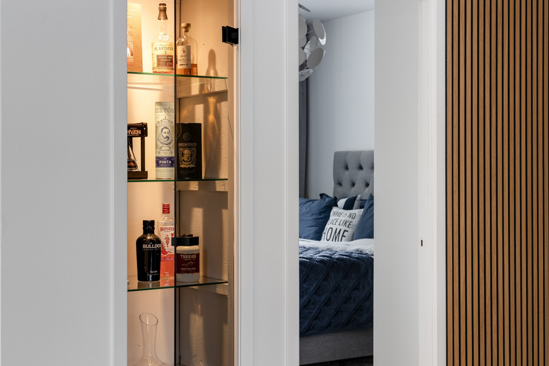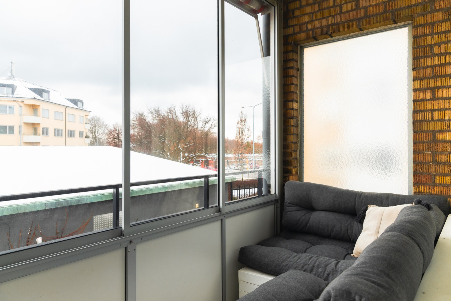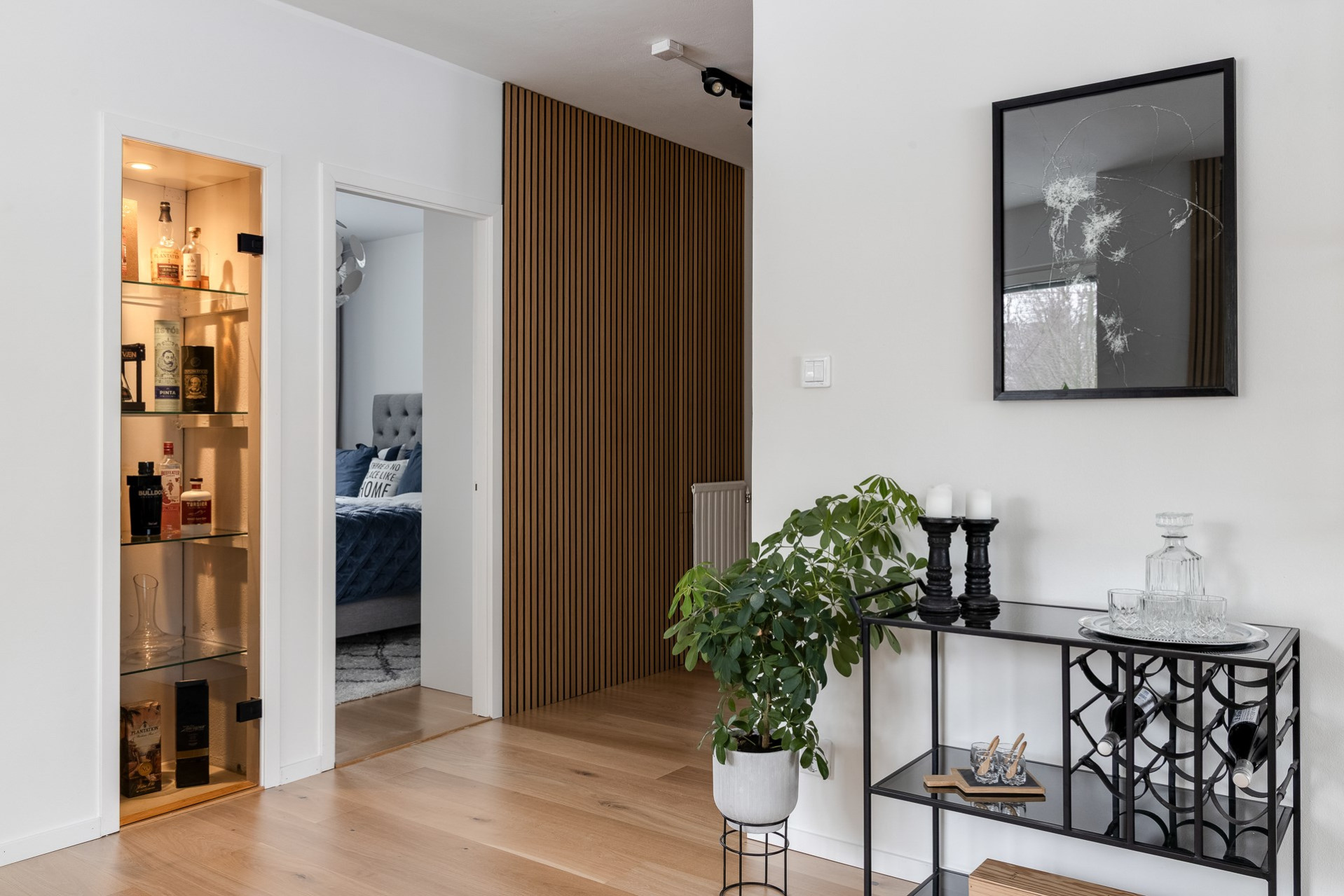 Ett generöst och ljust vardagsrum som ligger öppet mot köket. Här får du plats med en stor soffa, soffbord och annat önskat möblemang. Från vardagsrummet når du ut till den inglasade balkongen i soligt sydväst-läge. Balkongen blir en förlängning av bostaden. Garderoben i vardagsrummet/köket har gjorts om till ett modernt skåp med belysning och glasdörr. En fin detalj i bostaden.
