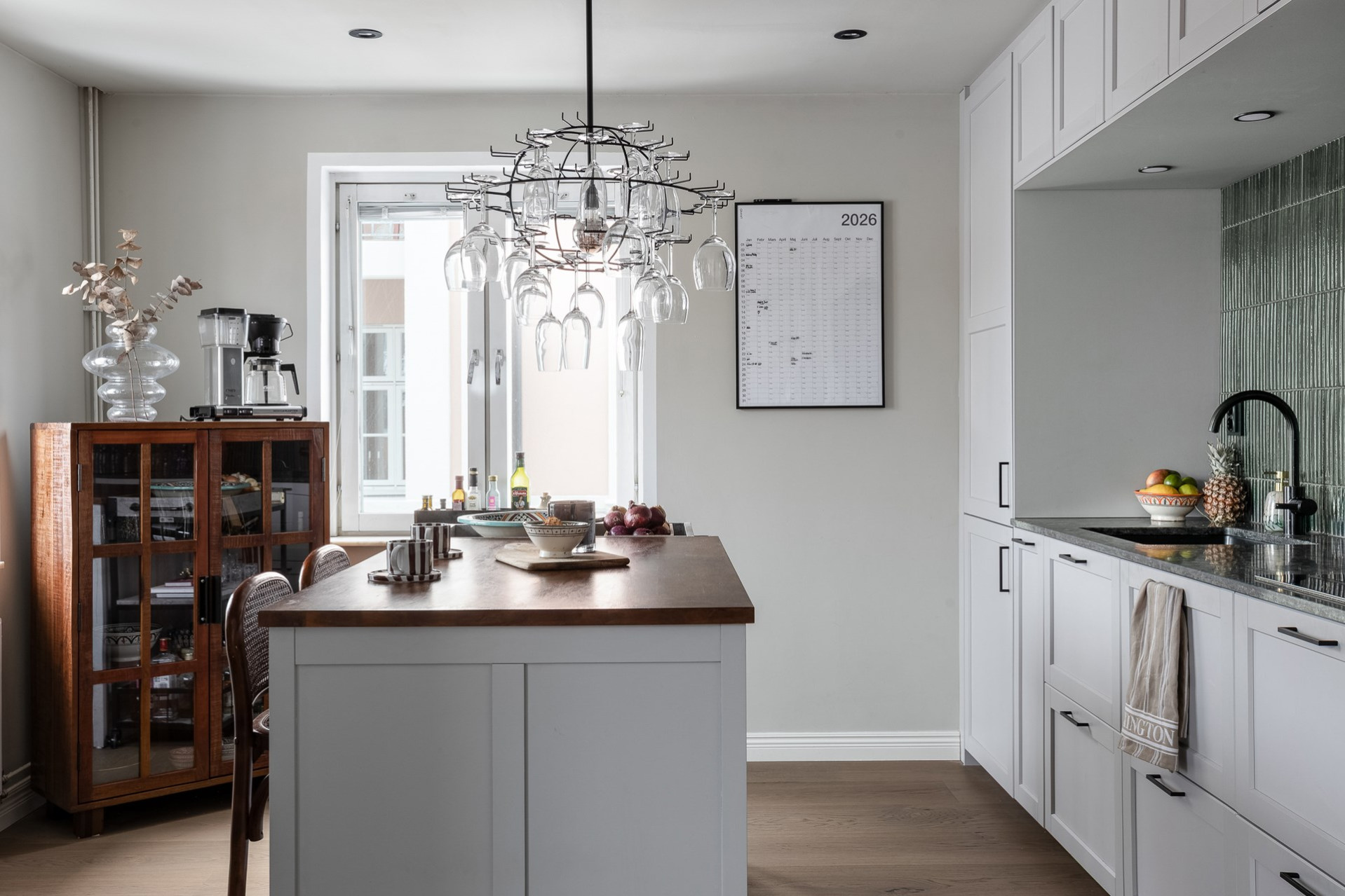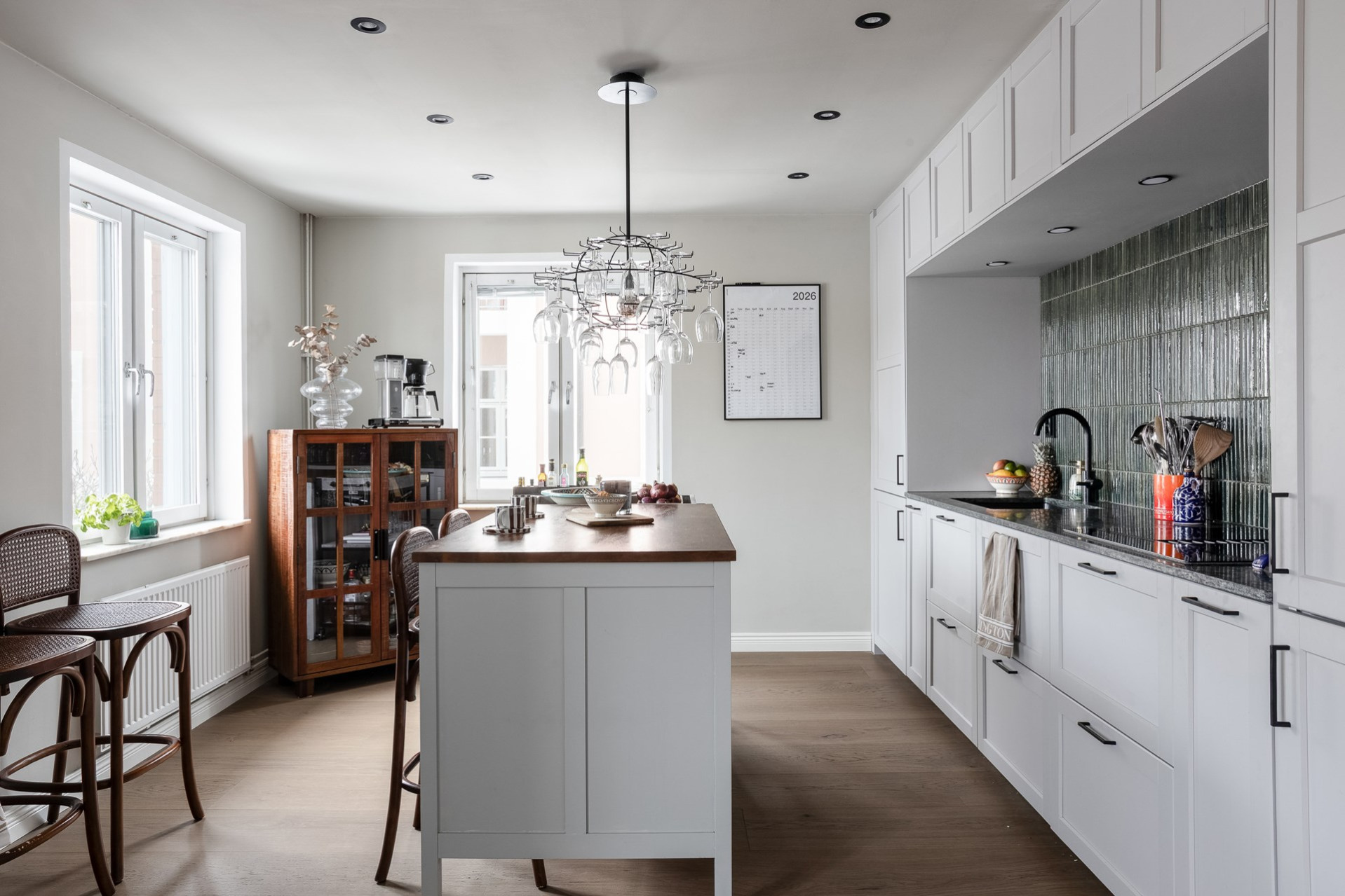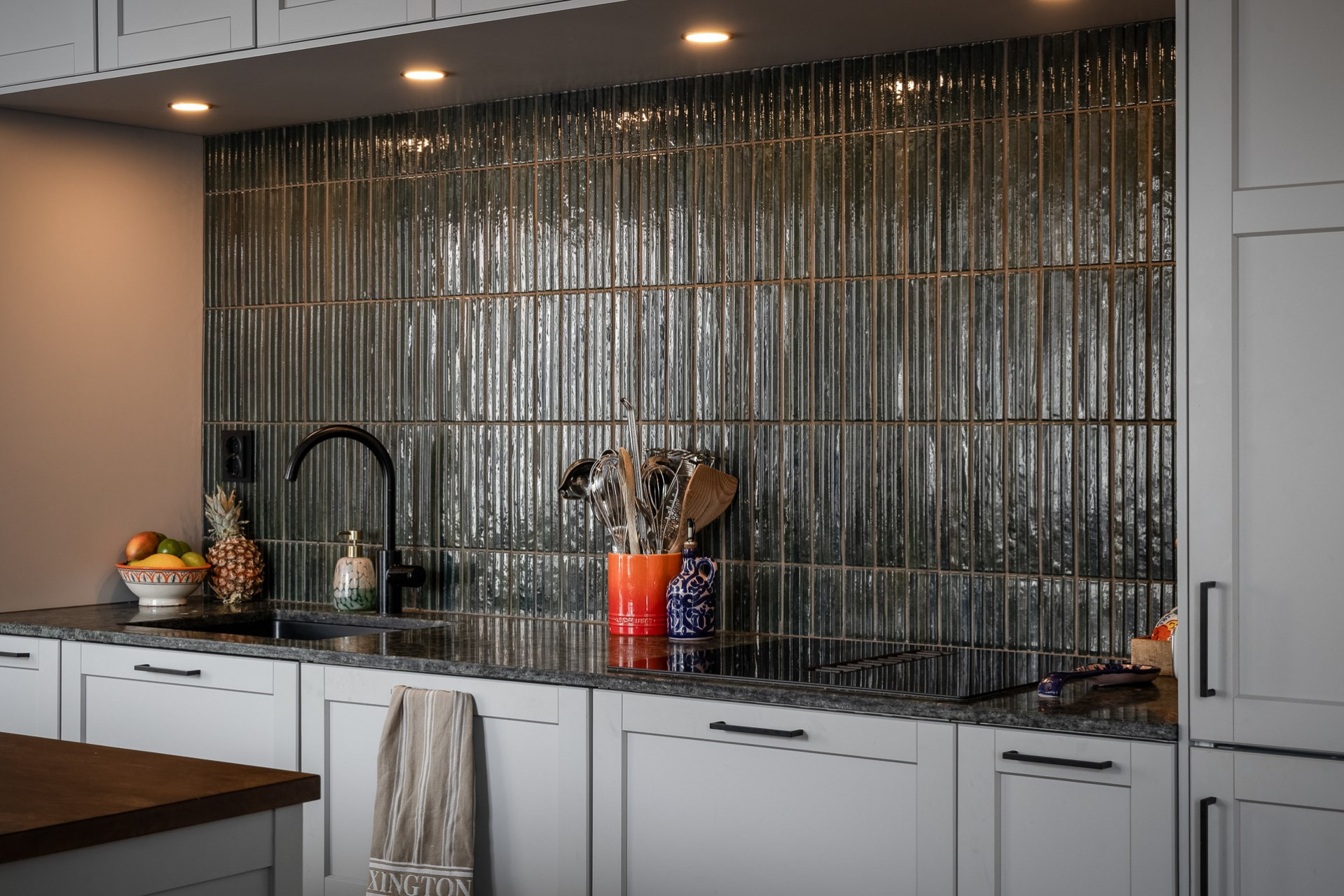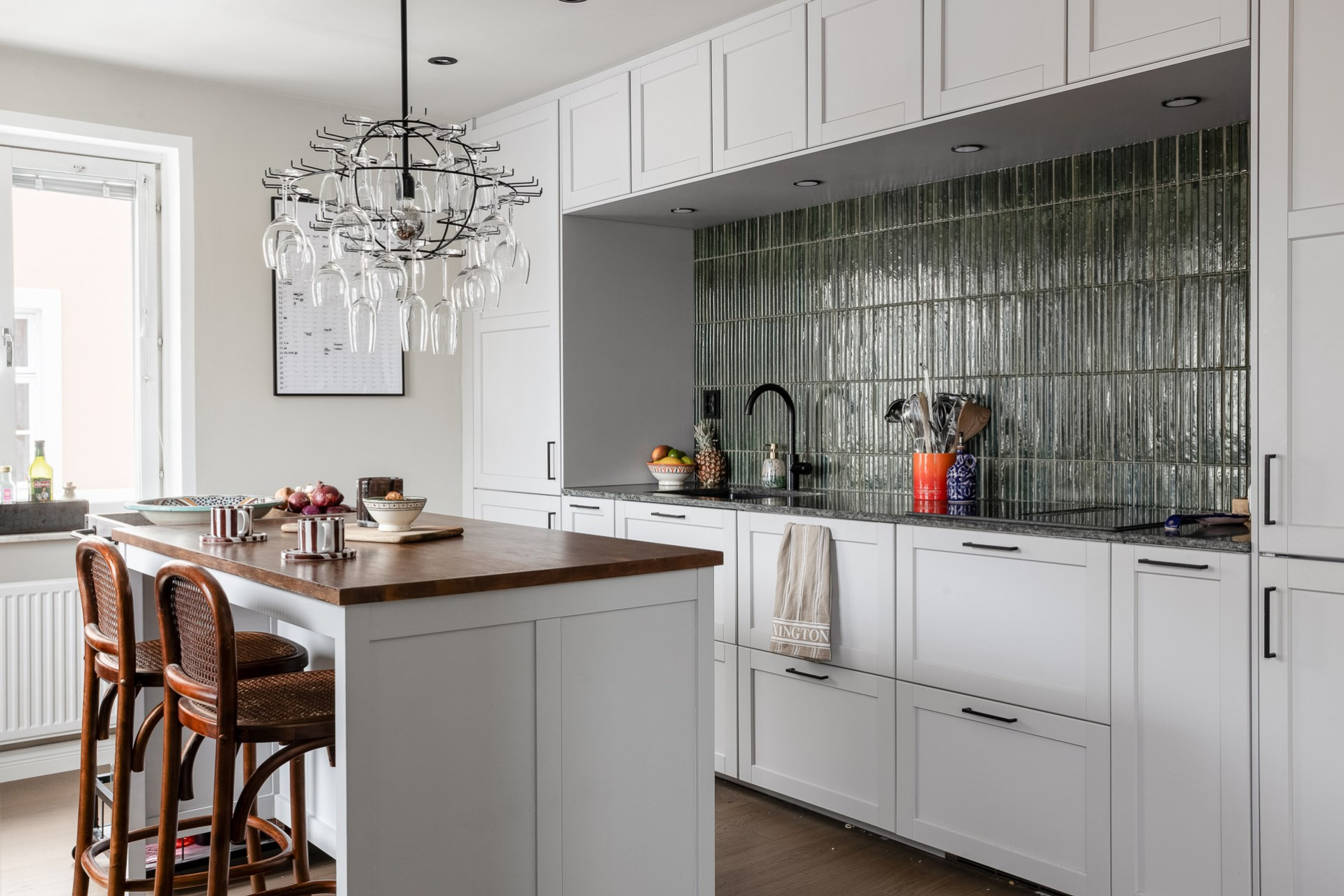 Kökets inredning är i ljusa toner som snyggt och stilrent bryts av mot det avlånga kaklet i grön nyans som är satt stående.