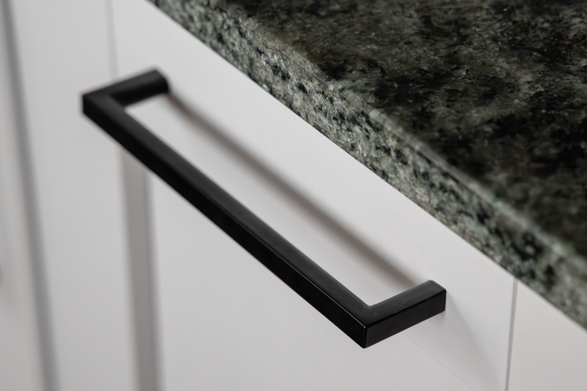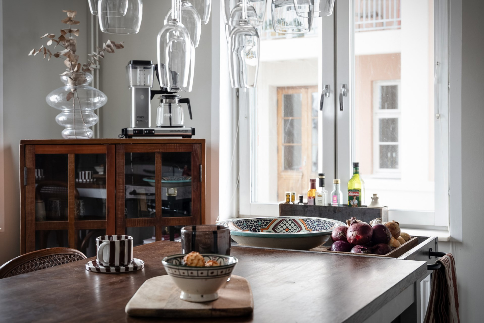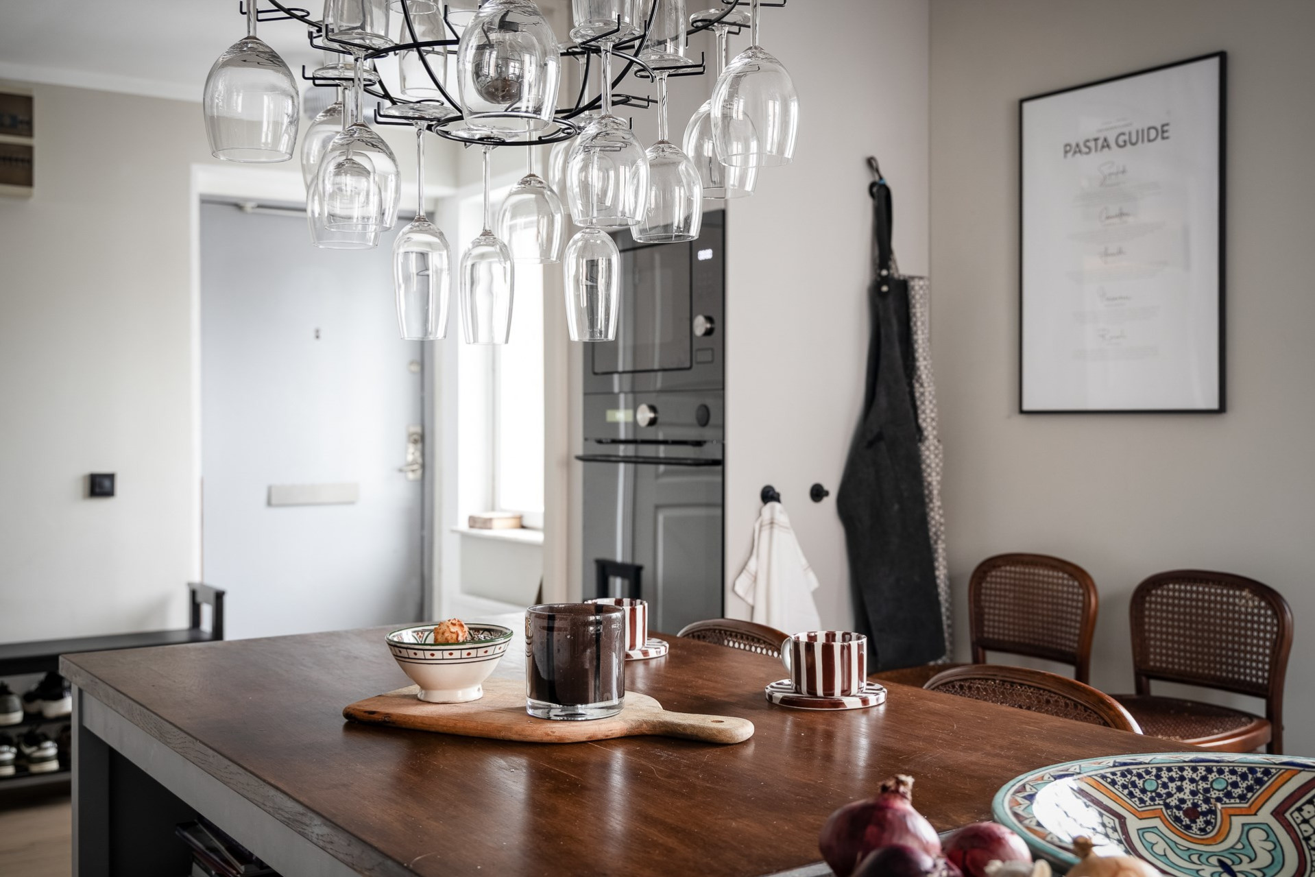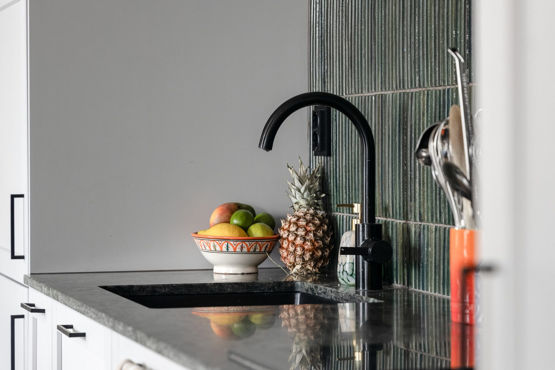 Kökets inredning är i ljusa toner som snyggt och stilrent bryts av mot det avlånga kaklet i grön nyans som är satt stående.