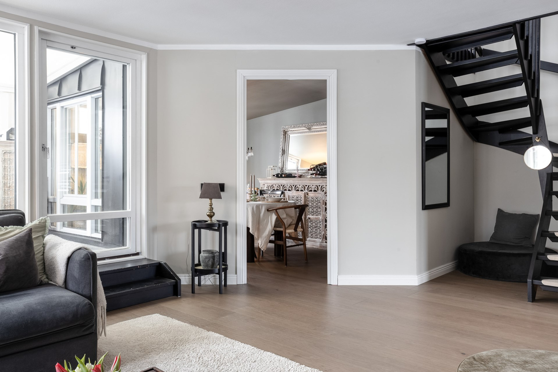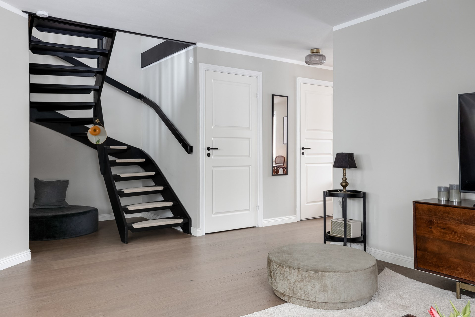 Från vardagsrummet finns också trappan upp till ovanvåningen.