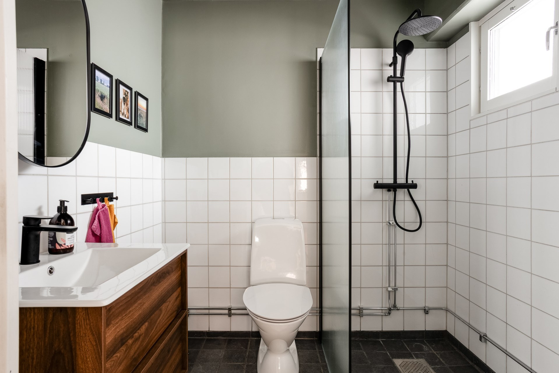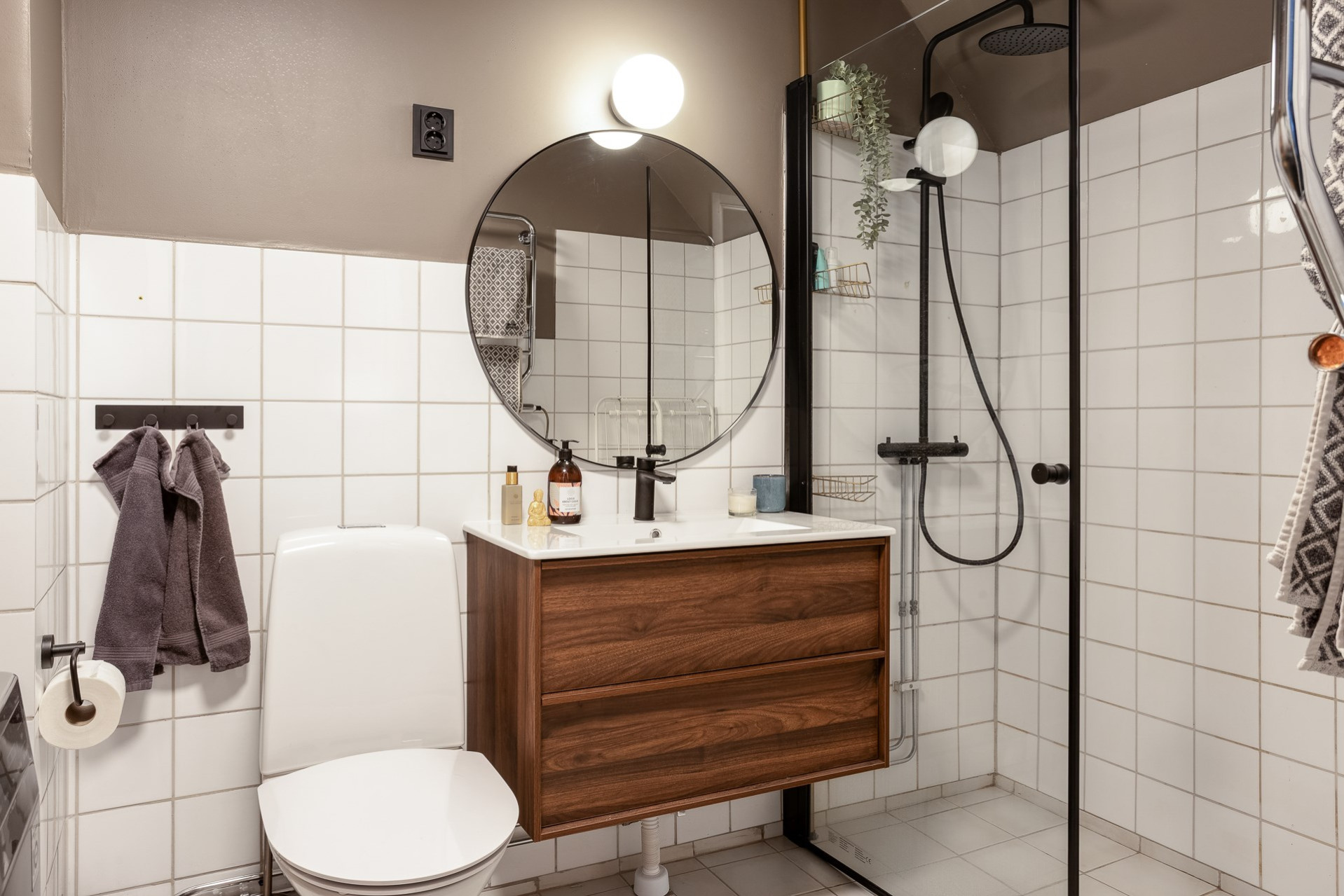 Badrummet på entréplan är utrustat med dusch, handfat med kommod under samt wc.