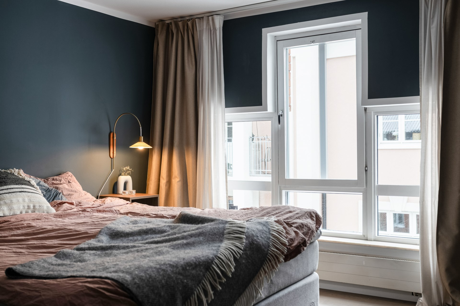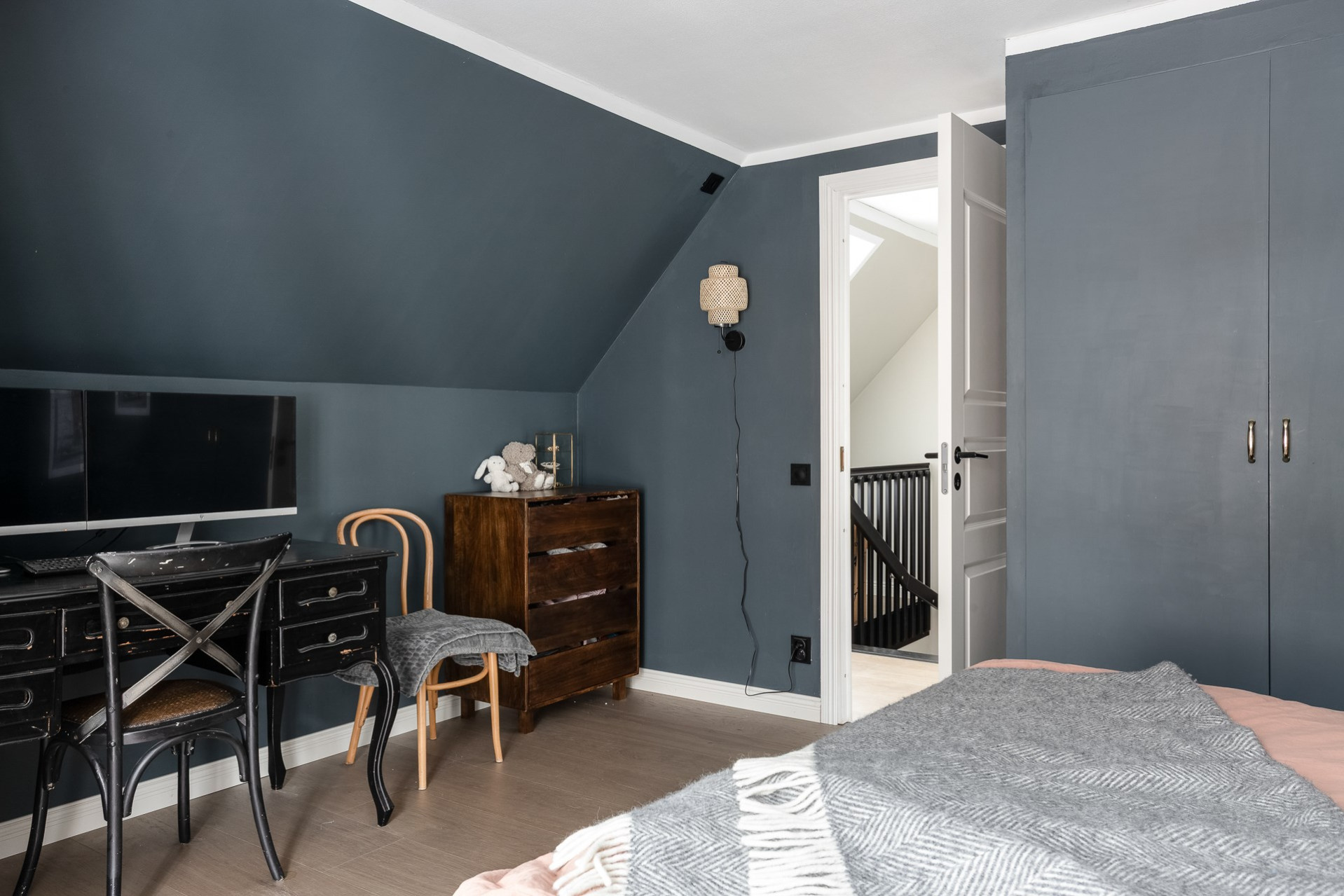 Sovrum 2 ligger en trappa upp på ovanvåningen och är riktigt väl tilltaget. Här finns gott om plats för både en stor dubbelsäng och diverse övrig möblering som t ex extra förvaring eller skrivbord. Dessutom finns två fasta garderober.