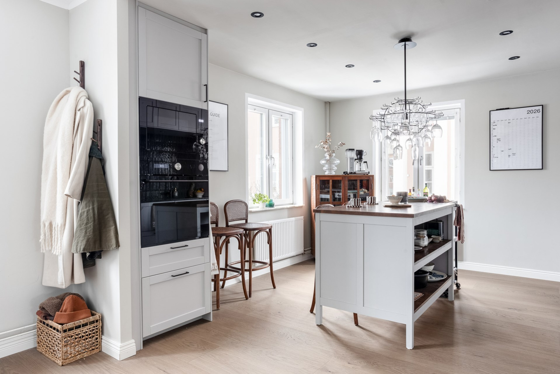 Väggen mellan kök och hall har tagits ner och gett båda utrymmena en härligt öppen och ljus känsla. Golvet är ljust trä i enstav och löper genomgående från hallen in i köket och även in i vardagsrum och sovrum 1.