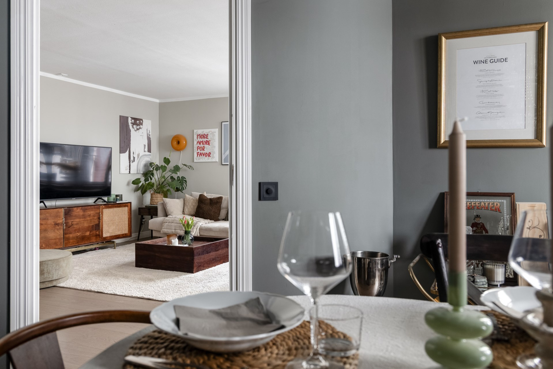 Entré till hall med gott om avhängningsyta och fin kontakt vidare in i bostaden tack vare den öppna planlösningen mot både kök och vardagsrum.
