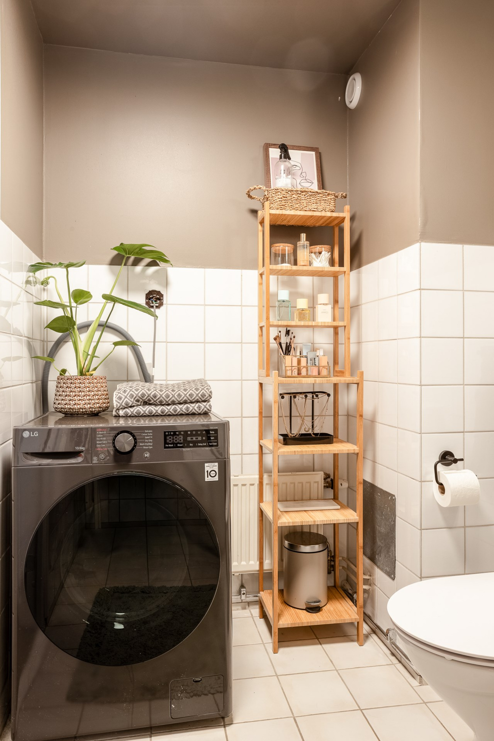 Även ovanvåningen badrum har dusch, handfat och wc men här finns också en praktisk kombinerad tvättmaskin och torktumlare installerad!