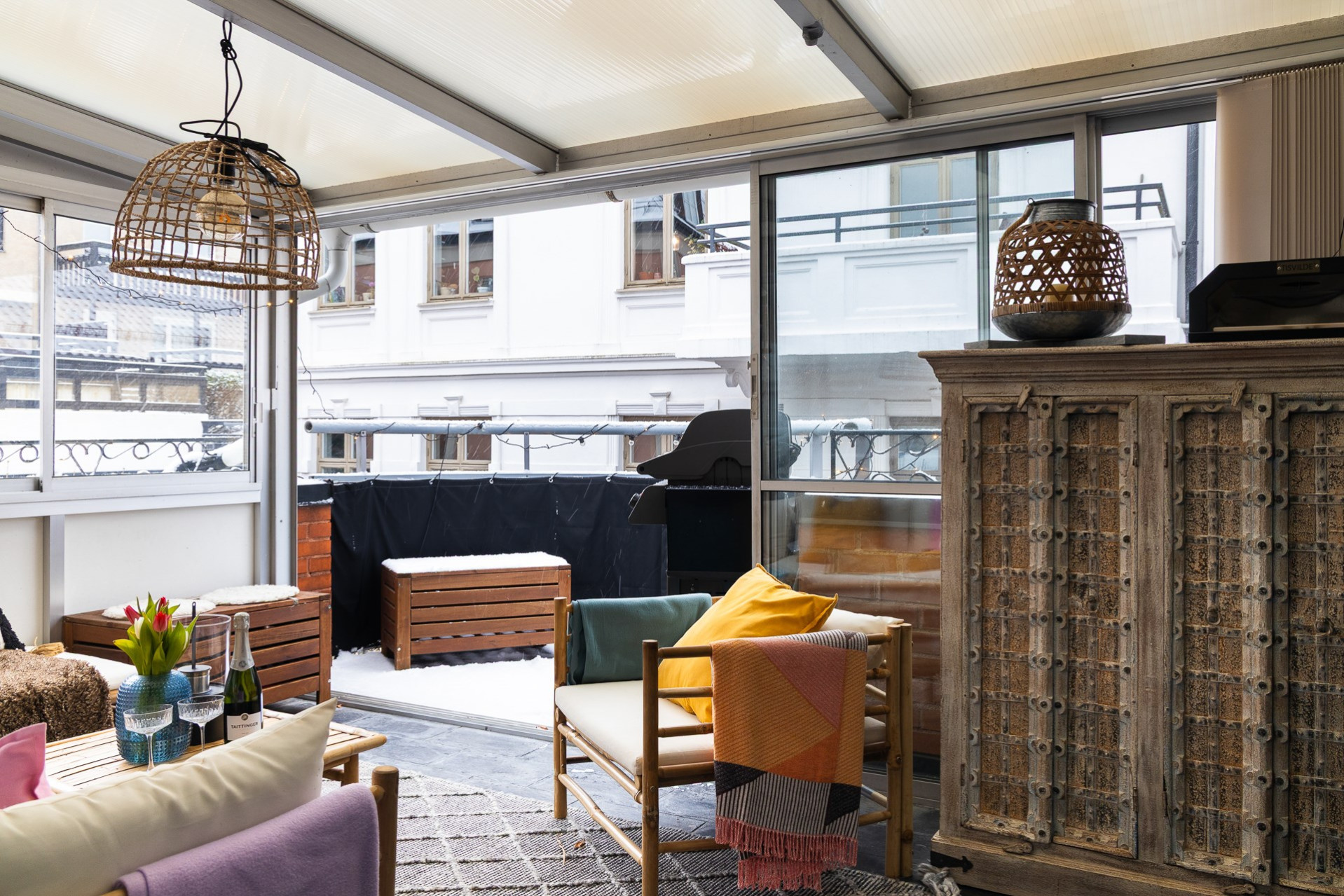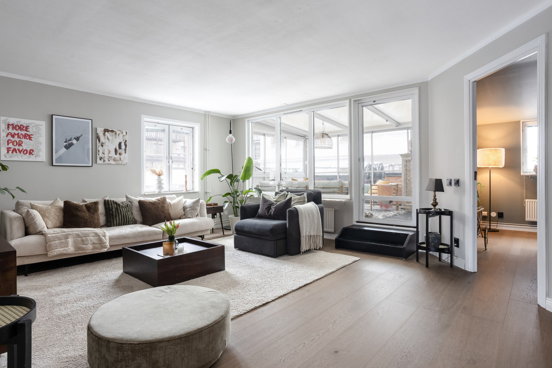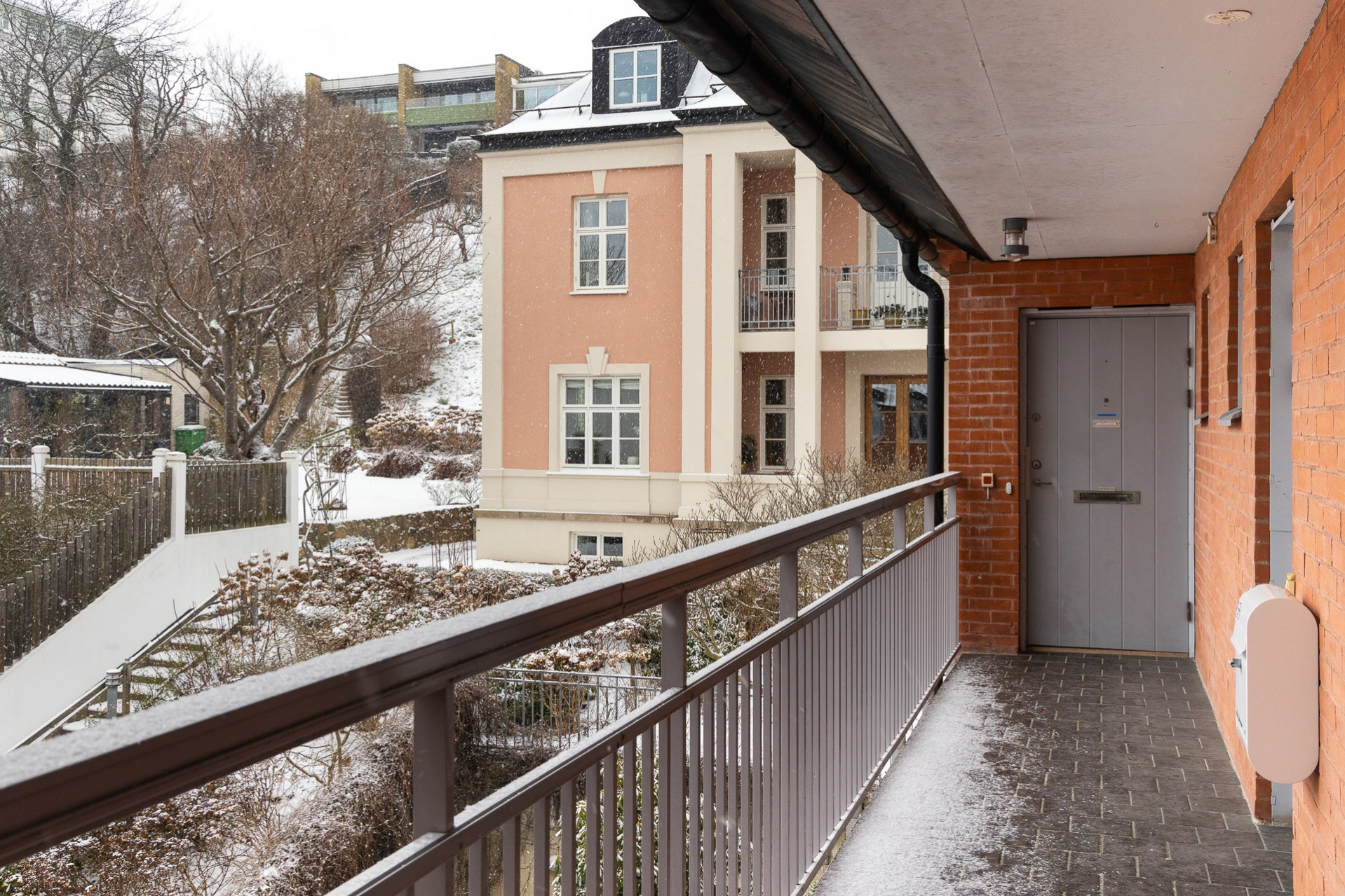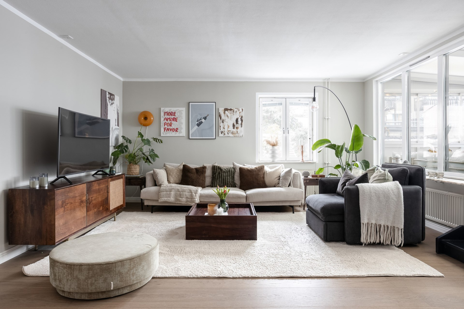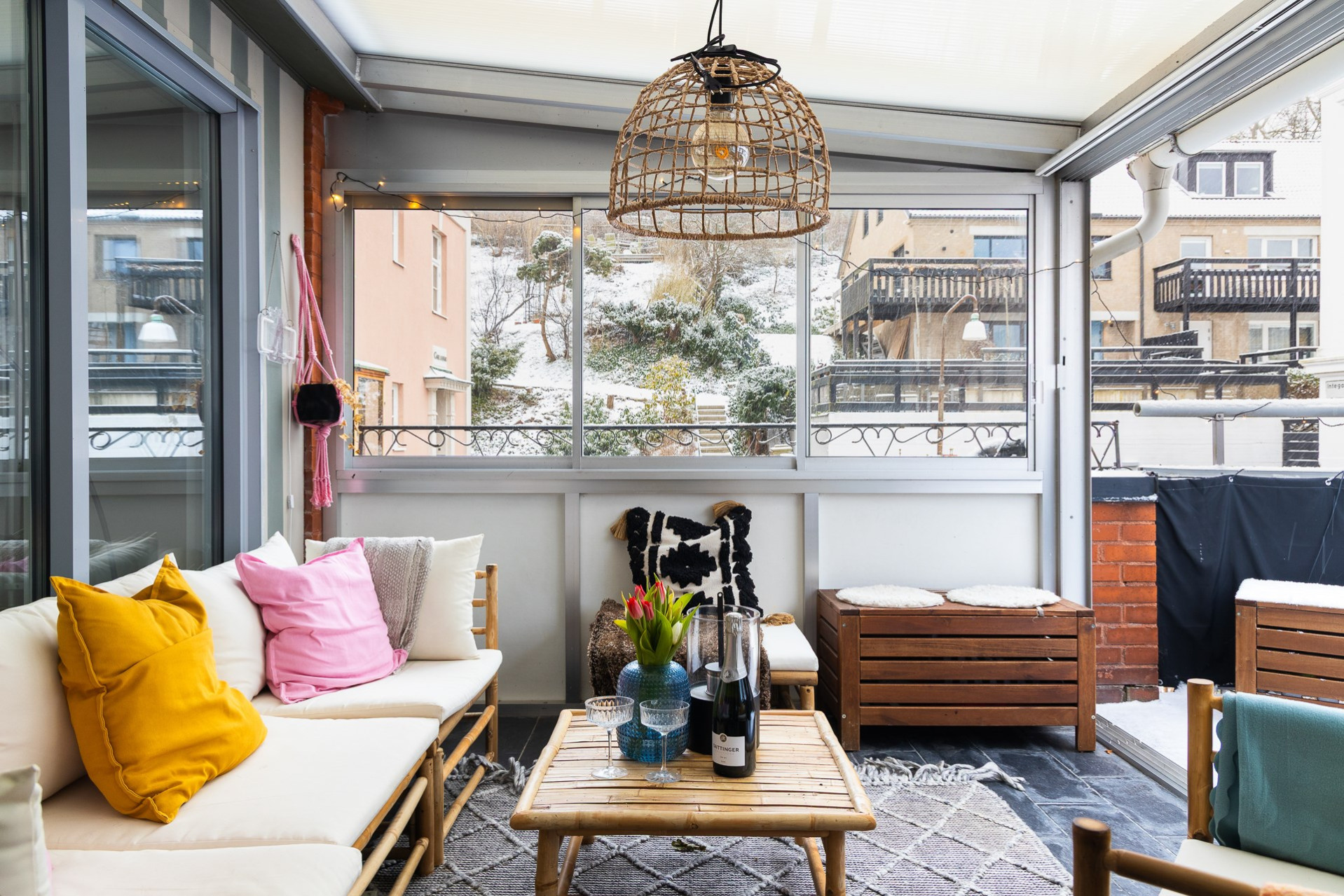 Från vardagsrummet finns utgång till det härliga uterummet och därifrån vidare ut till den lilla balkongen utanför.