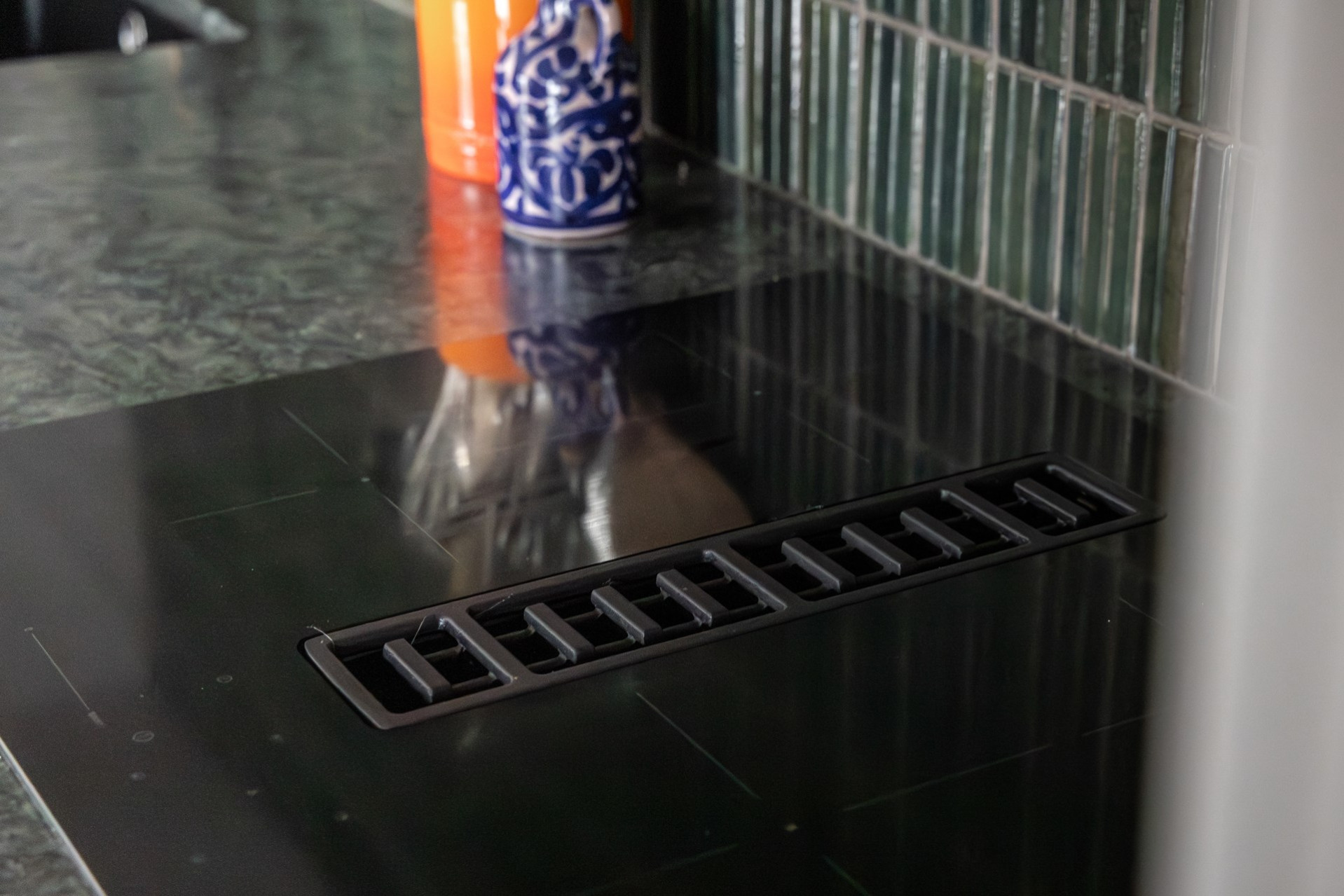 Infällda spotlights både över arbetsyta och i resten av taket.