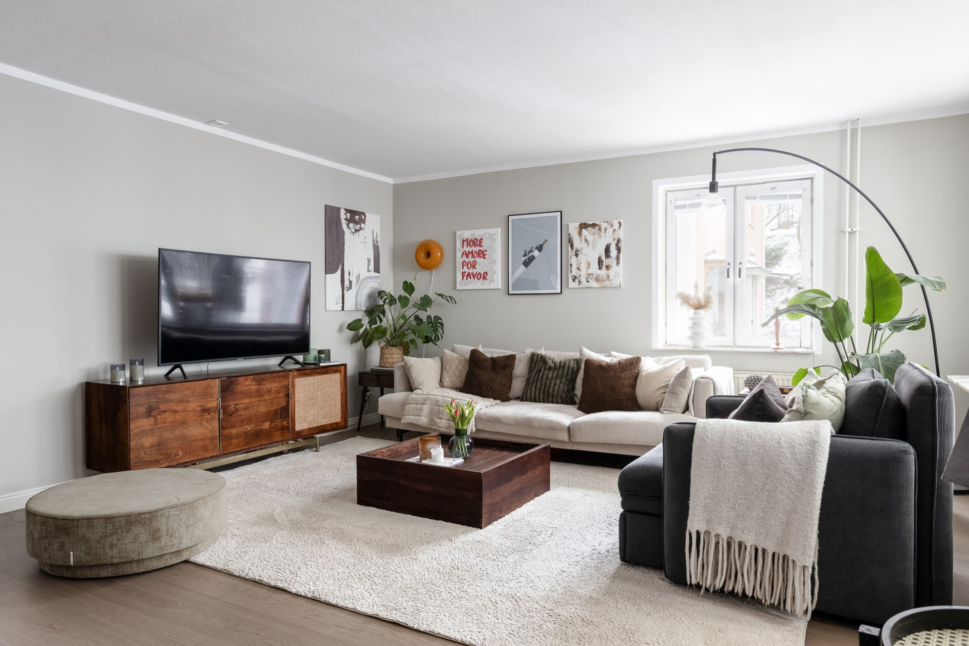 Stort vardagsrum som idag fungerar som tv-rum men som tack vare sin storlek enkelt skulle kunna rymma både soffa/tv-hörna och matsalsmöblemang.