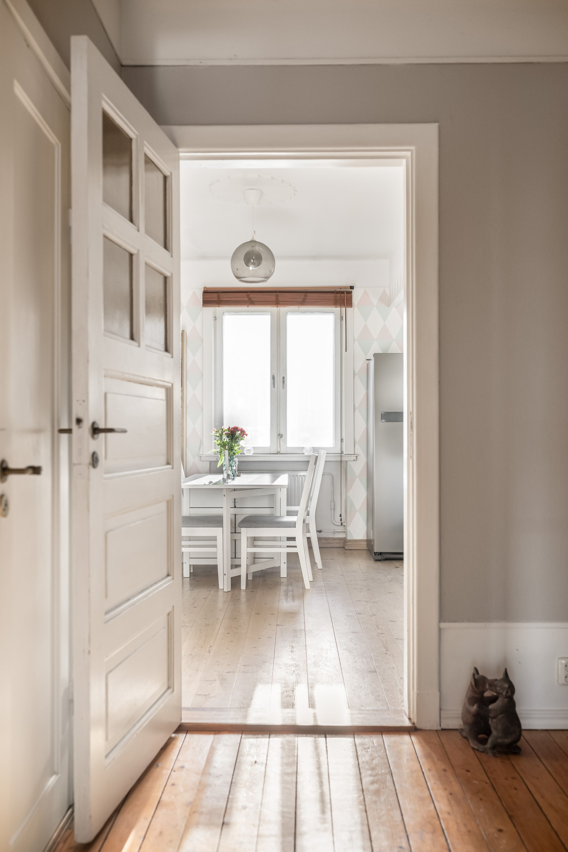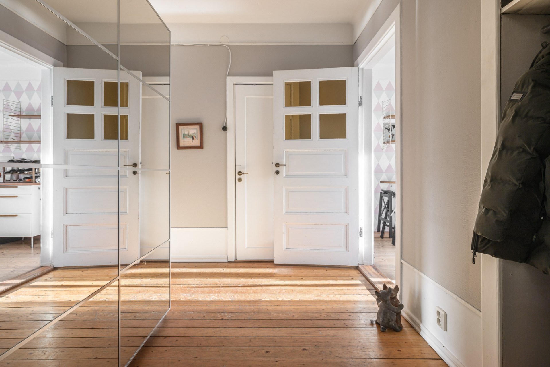 Välkommen in genom en ny säkerhetsdörr. Hallen är rymlig och erbjuder yta för garderober (spegel garderoberna idag ingår inte i köpet). På golvet vilar ett vackert brädgolv och väggarna är målade i ljus lilla.