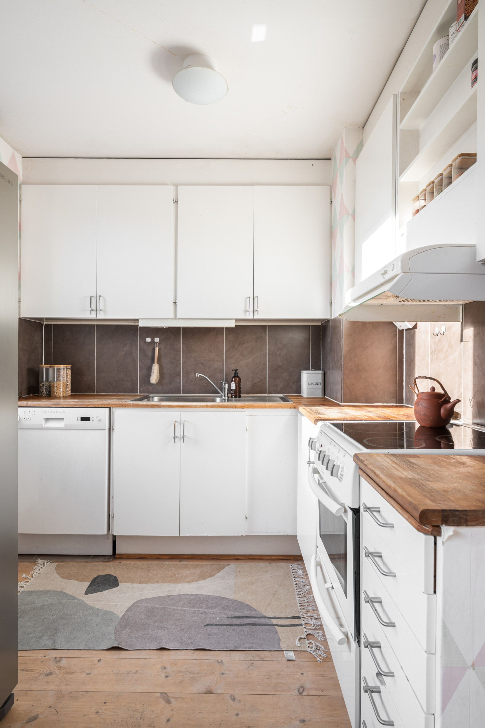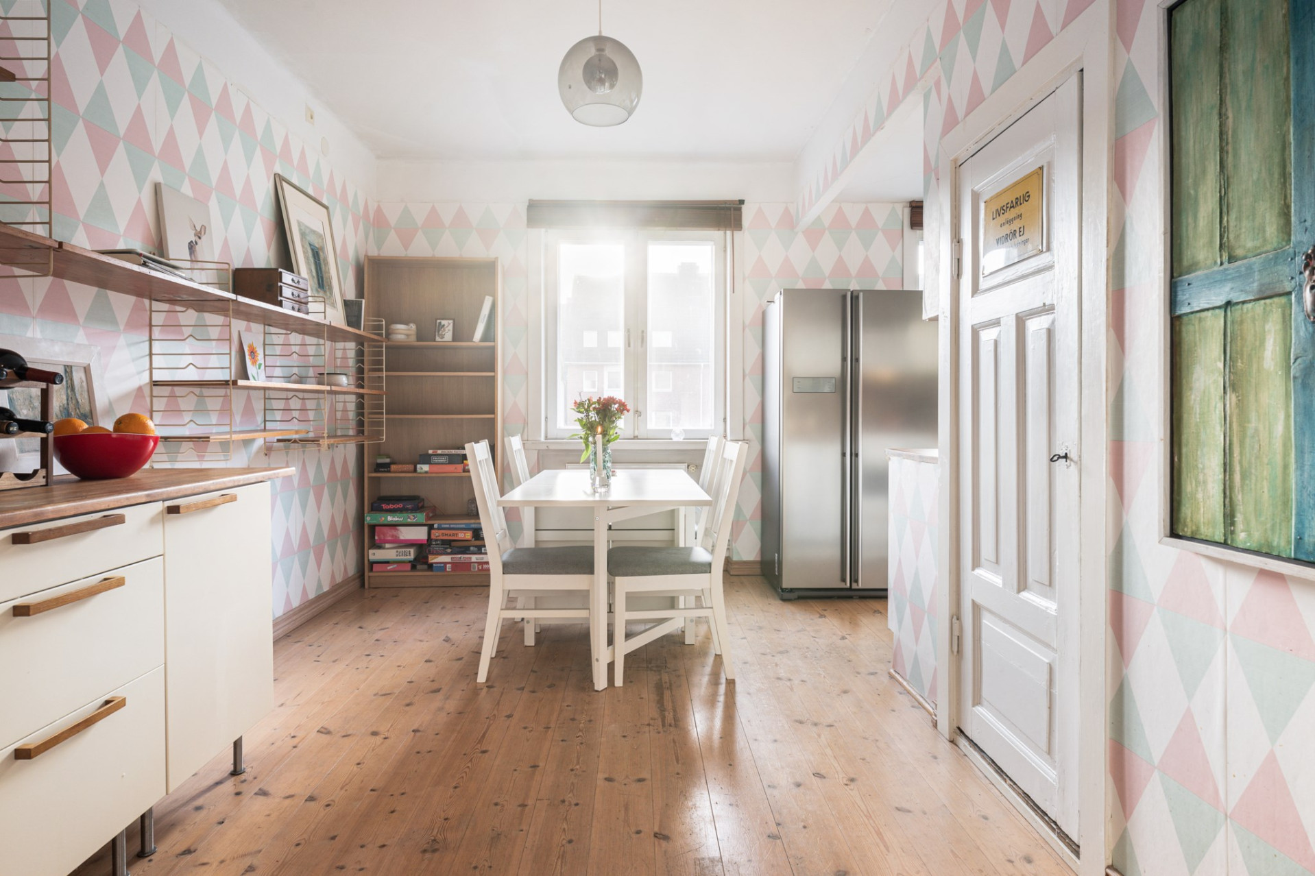 Genom en vacker spegeldörr når ni köket från hallen. Köket är inbjudande och har flera möjligheter för inredning och ett större matrumsbord. Köket är utrustat med över och underskåp, god arbetsyta med vask, ugn, spis, diskmaskin samt fristående kyl/frys. Där finns ett litet förrådsutrymme för ytterligare förvaringsmöjligheter. Väggarna är tapetserade och på golvet ligger ett parkett.