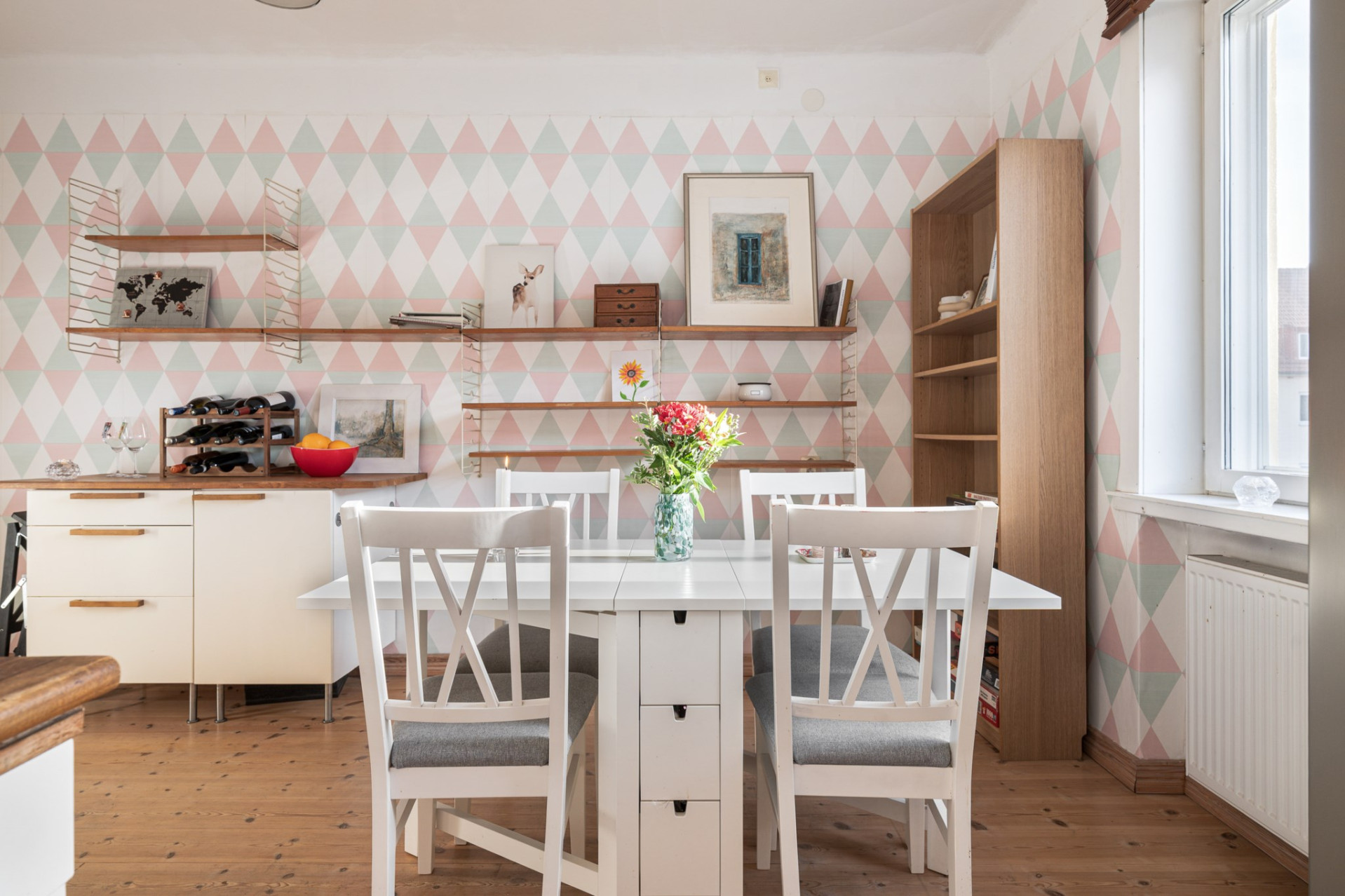 Vardagsrummet når ni direkt till vänster om hallen, vardagsrummet är ljust och rymligt! Här finns det gott om plats för en större soffgrupp och umgänge. Väggarna är tapetserade och på golvet ligger det vackra brädgolvet.