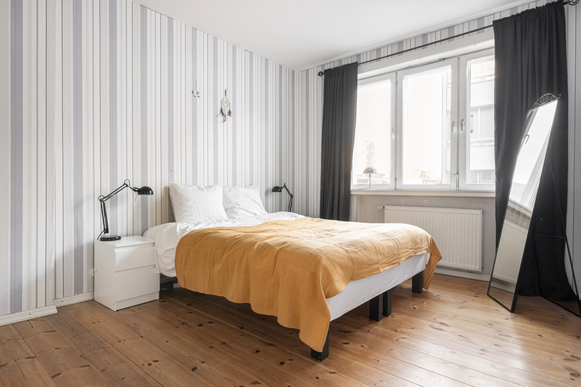 Rummet i fil bredvid, når ni sovrummet som även det är stort och rymligt! Här får ni plats med en stor säng och tillhörande möbler. Väggarna är tapetserade och på golvet ligger ett parkett.