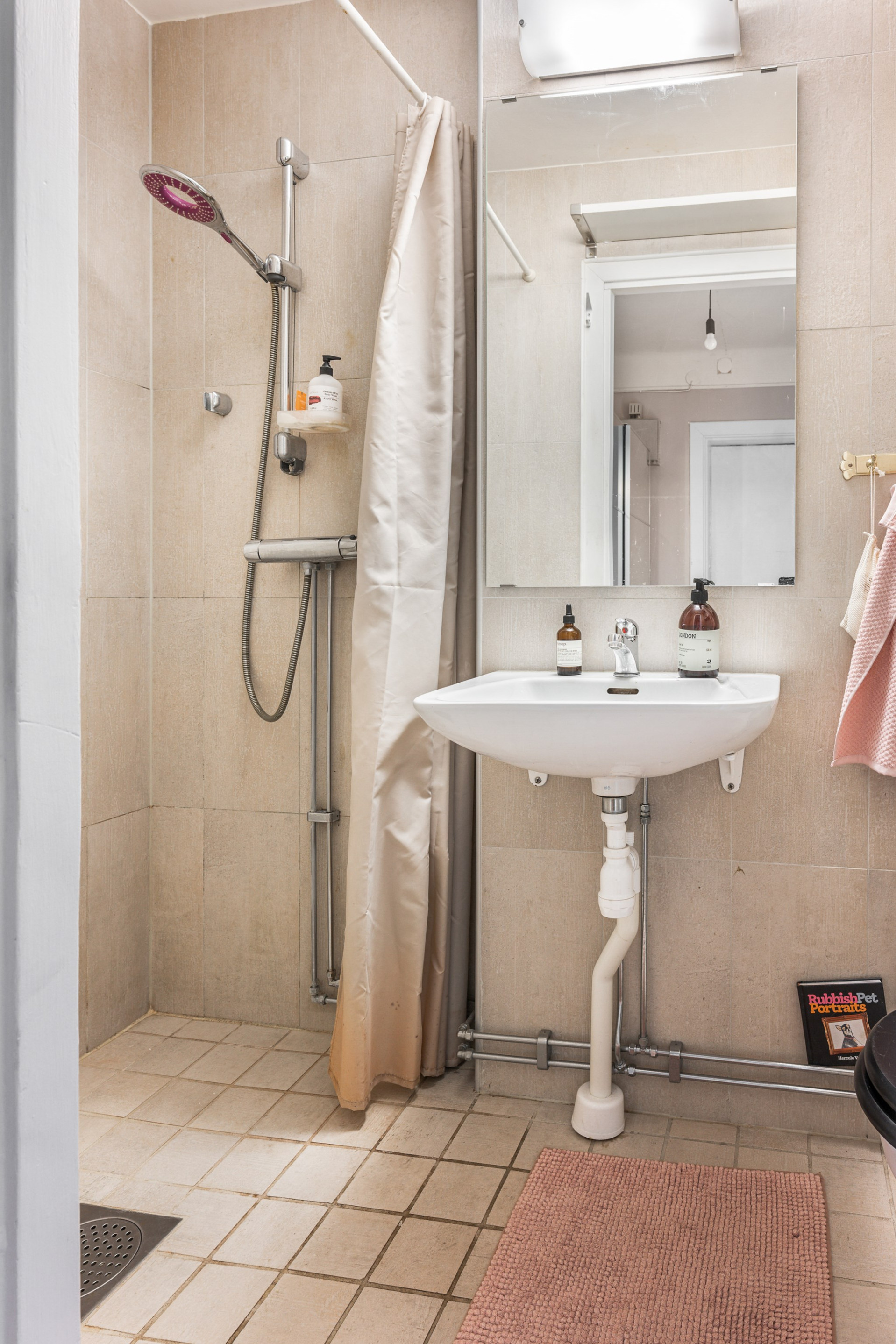 Badrummet är helkaklat i beigt och utrustat med vask, wc och dusch.