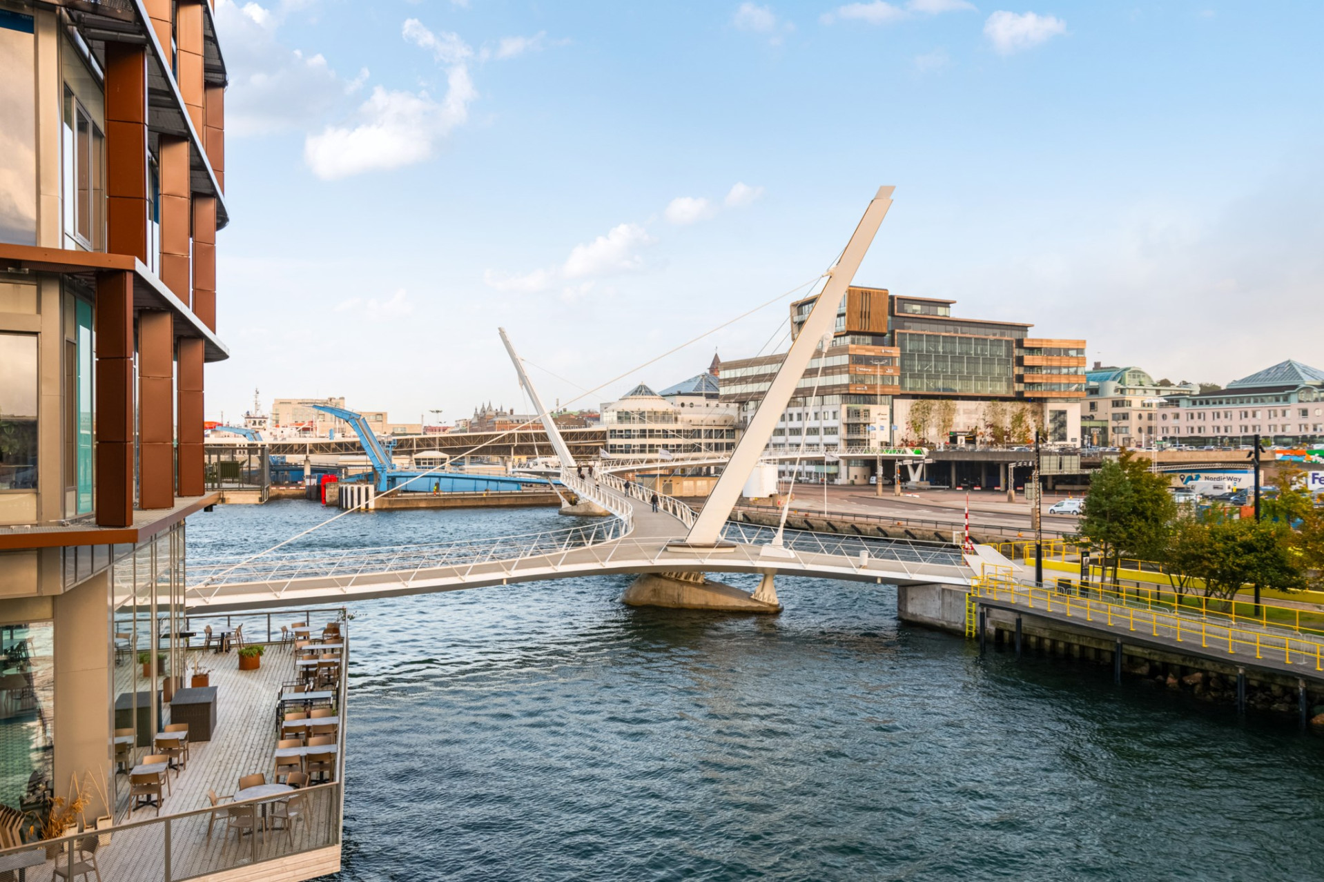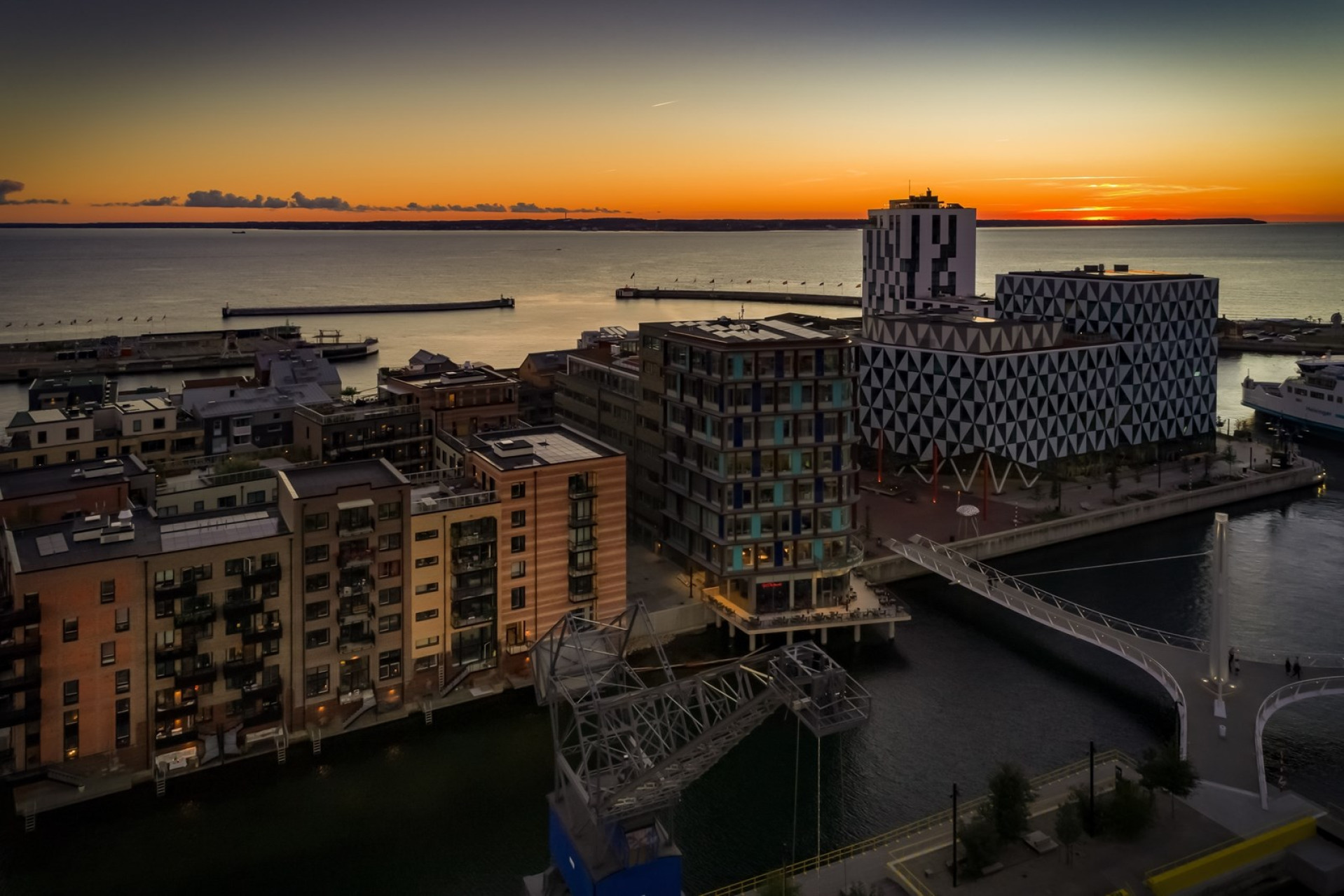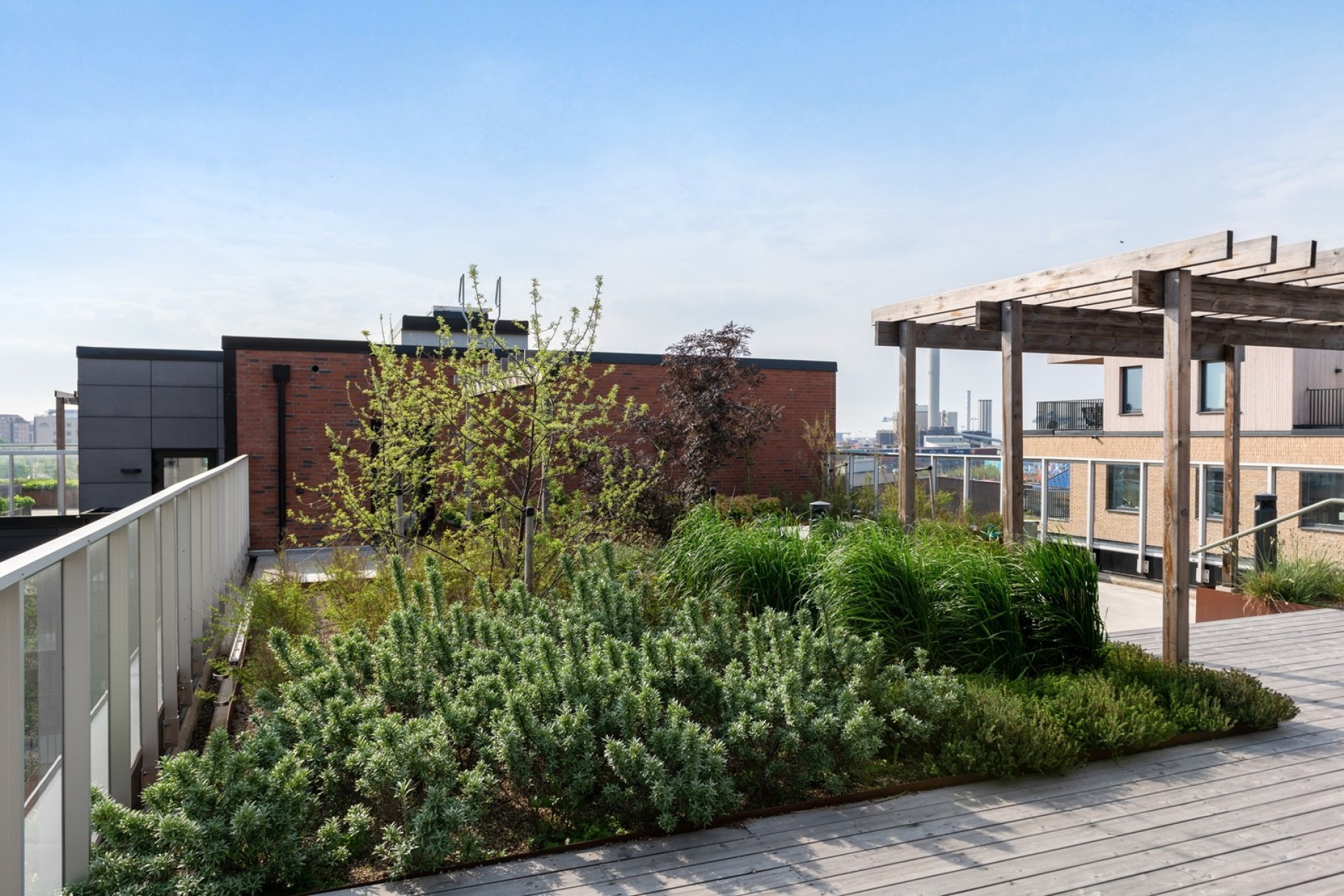 Två gemensamma takterrasser och en gemensam brygga mot hamnbassängen.