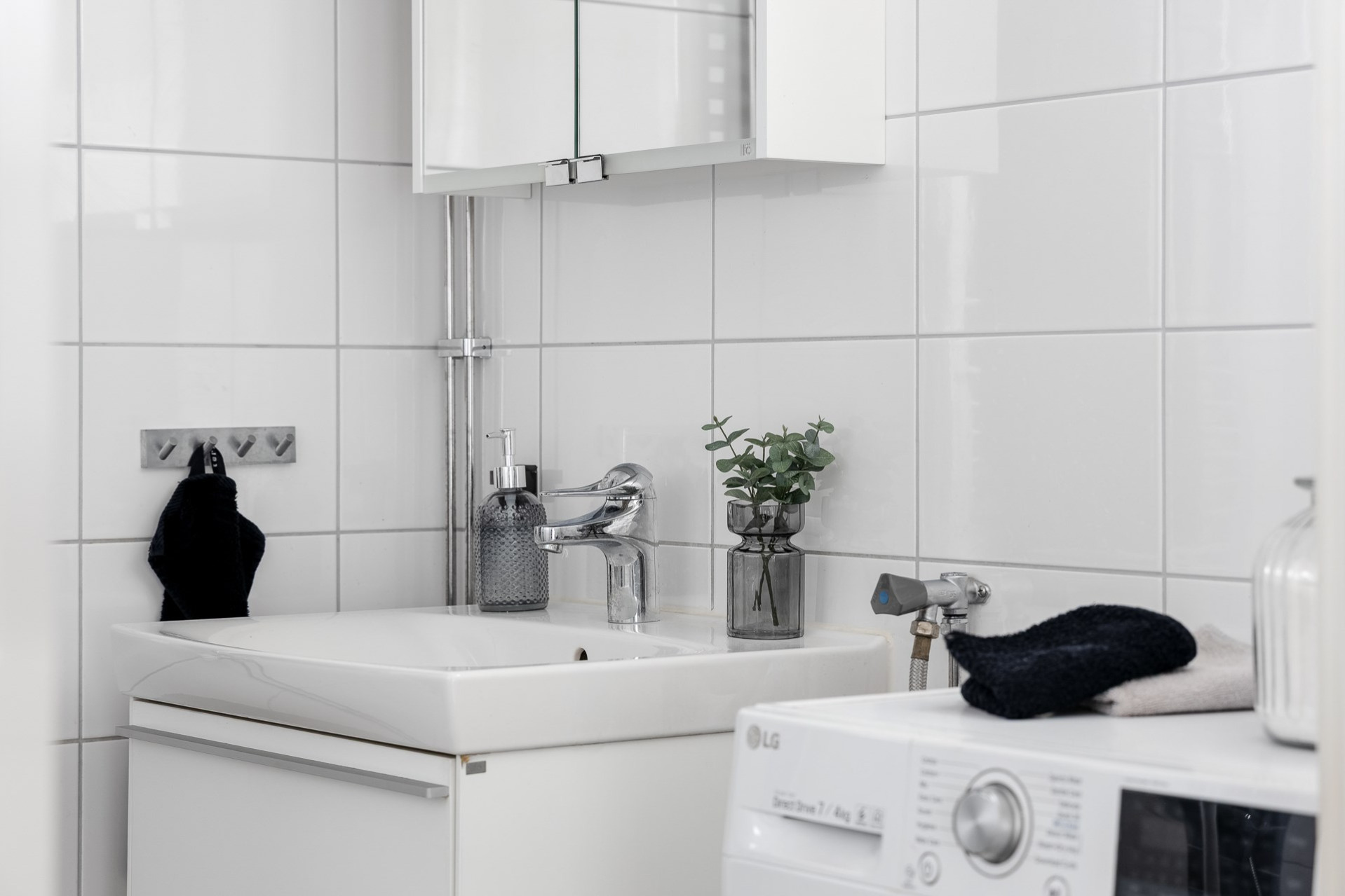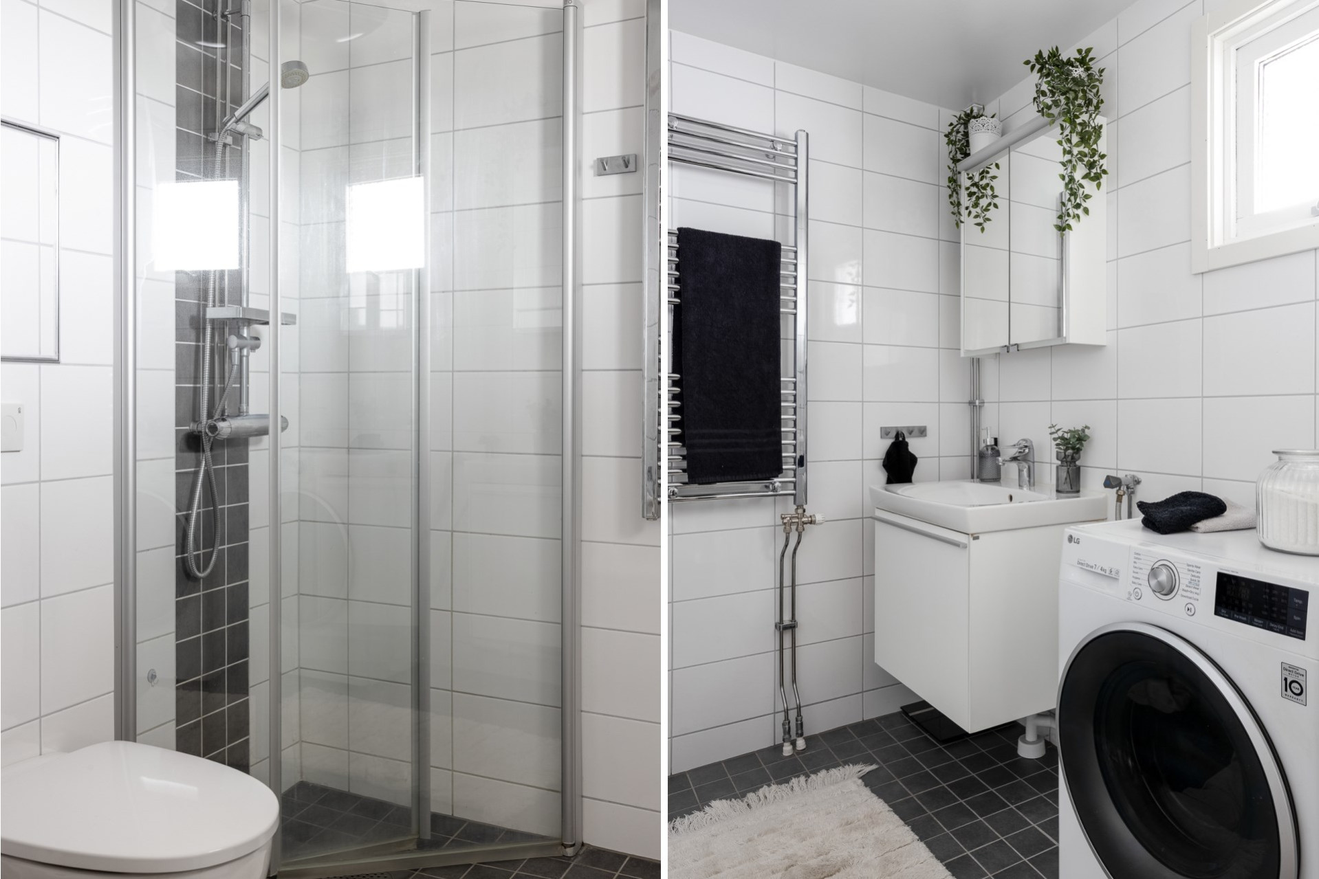 Helkaklat badrum (ca -21) i tidlösa färger som är utrustat med dusch och duschdörrar i glas, vask med kommod undertill samt spegelskåp som erbjuder plats för hygienartiklar, vägghängd wc, uppvärmd handdukstork och kombinerad tvätt- och torkmaskin för extra komfort.
