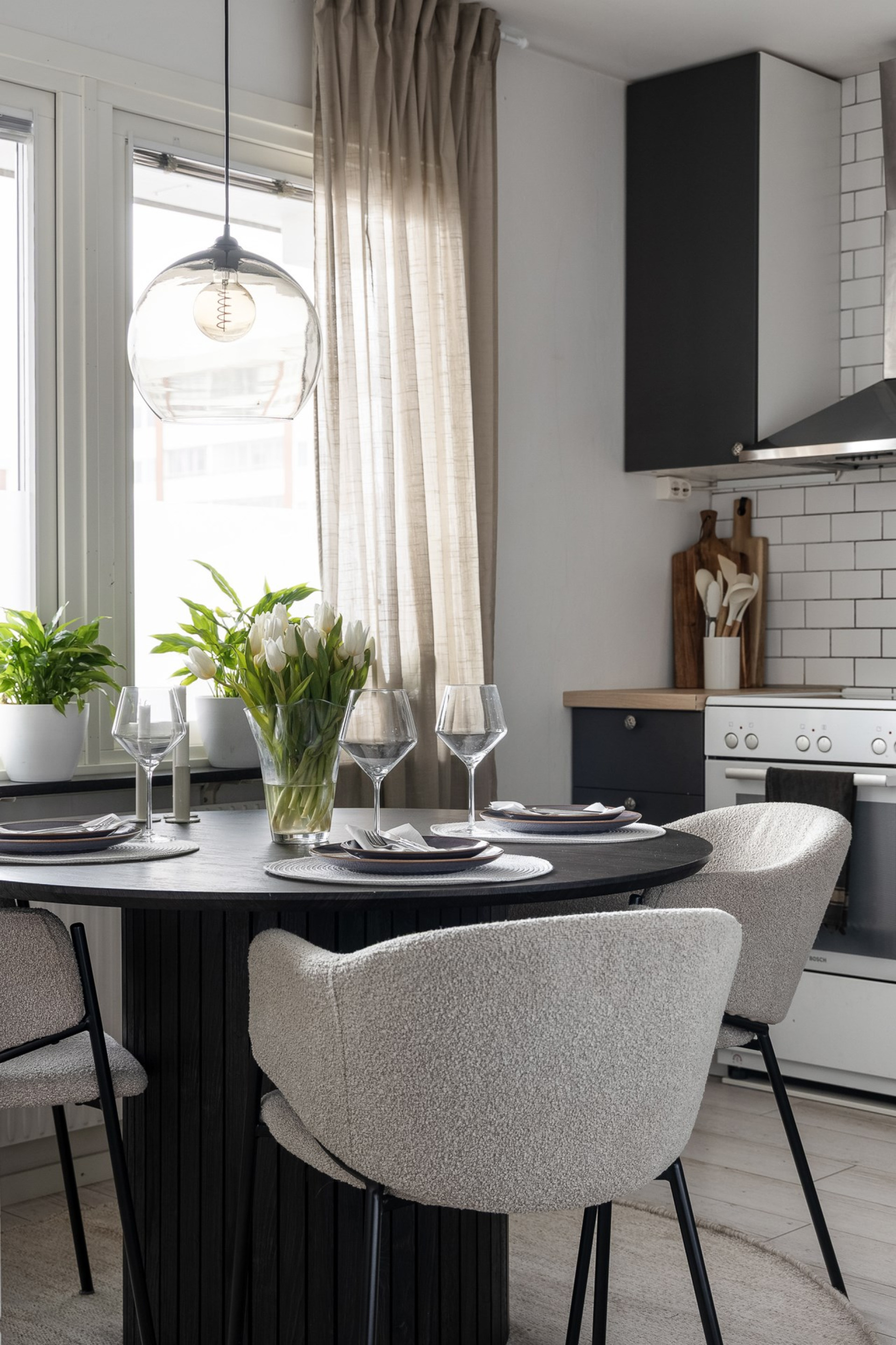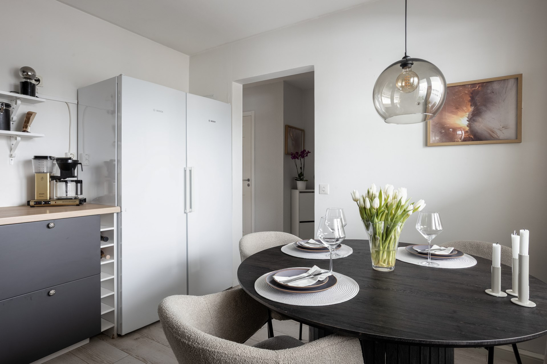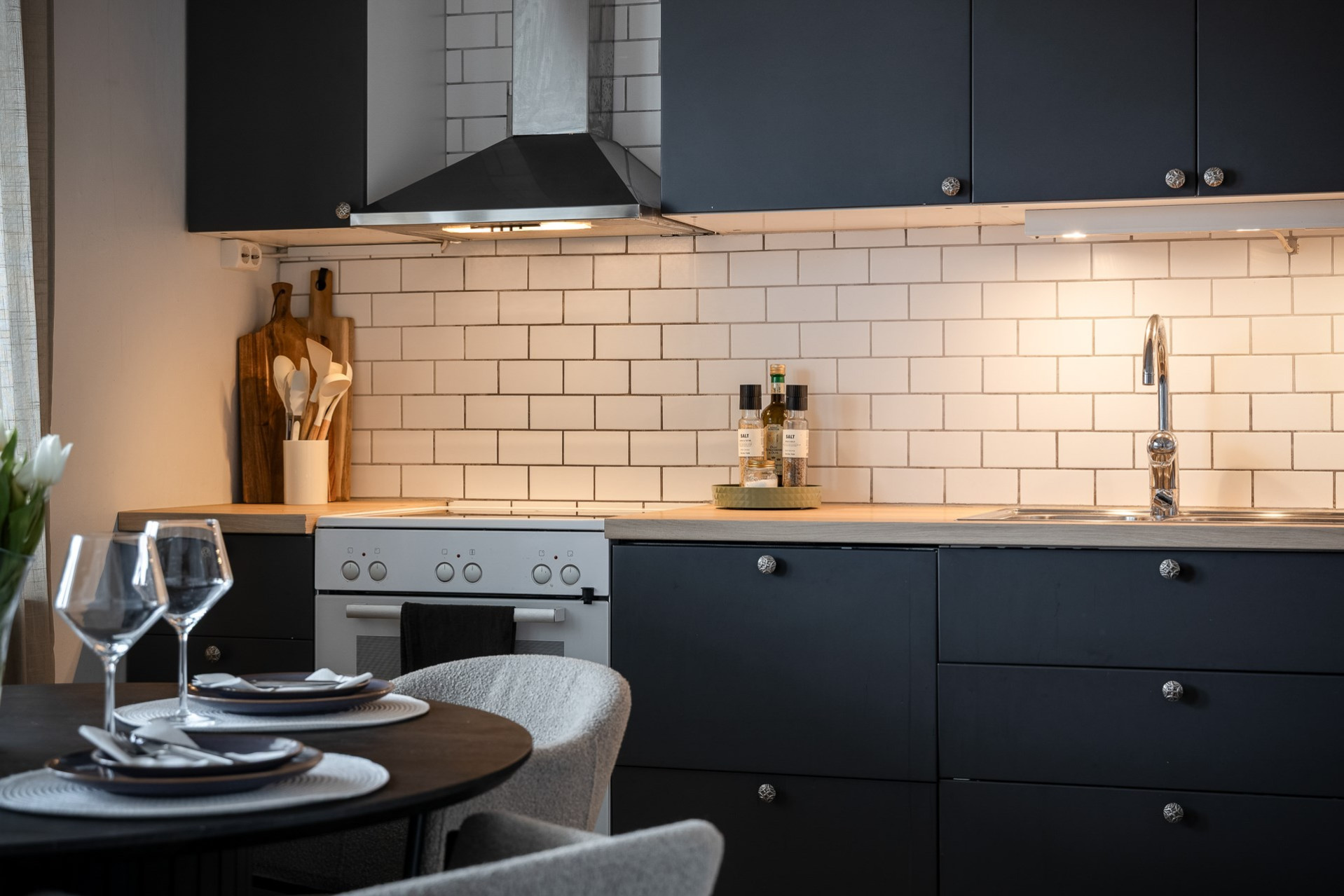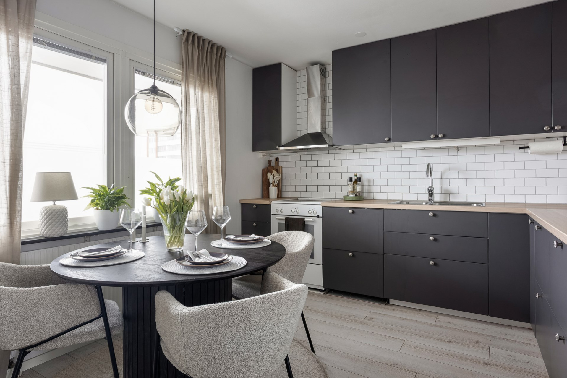 Ett modernt och inbjudande kök med matplats för 4 personer vid fönstret. Köket erbjuder goda arbetsytor och förvaringsmöjligheter i både skåp och lådor. Mörkgråa luckor, ljus bänkskiva och vita kakelplattor som stänkskydd. Köket är utrustat med spisugn, spisfläkt, diskmaskin samt kyl & frys. På golvet ligger ett ljust laminat och väggarna är vita.